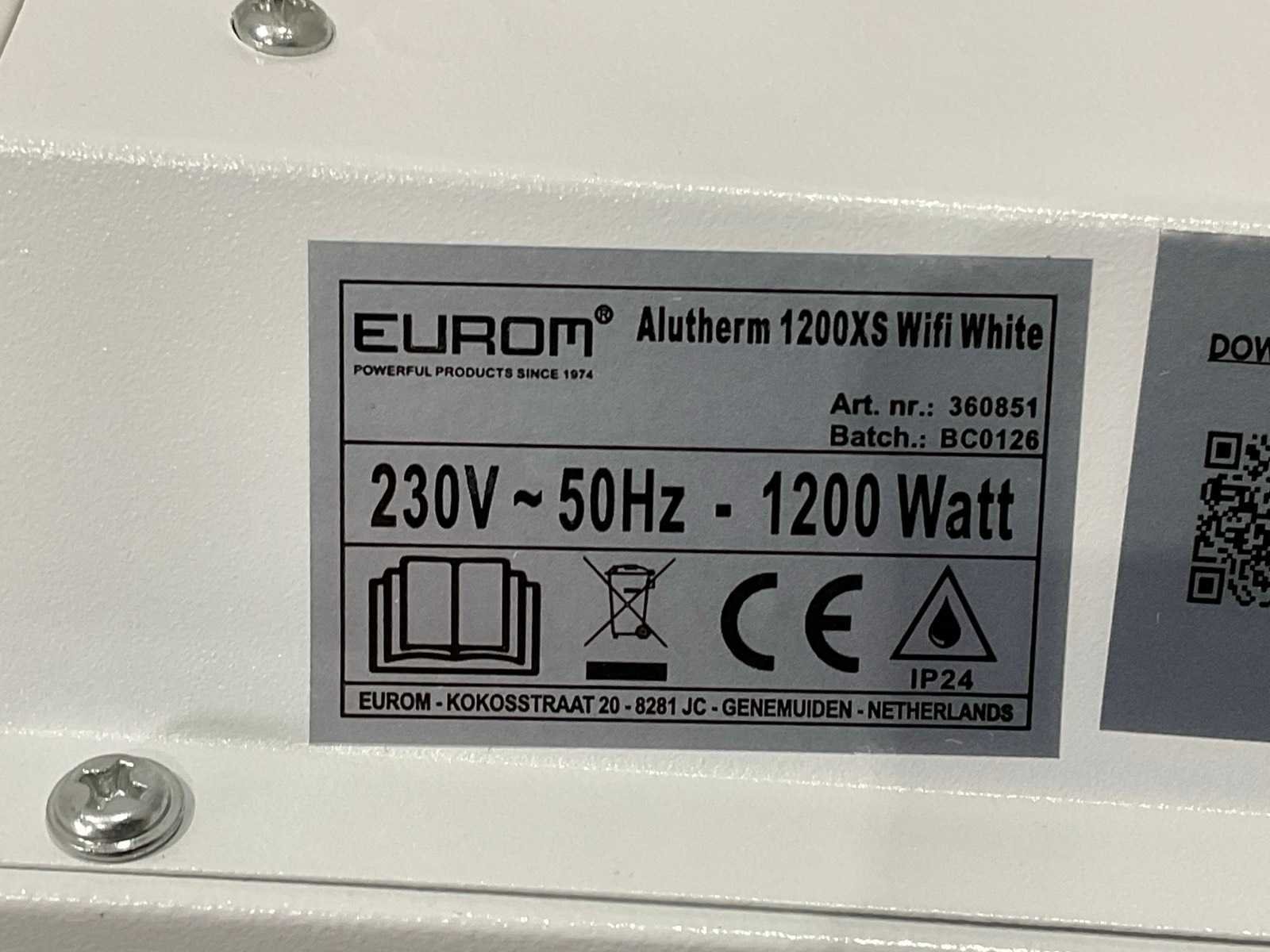Merk: Eurom Type: Alutherm 1200XS wifi White Aansluiting: 220V Totale afmeting Breedte: 700mm Totale afmeting Hoogte: 430mm