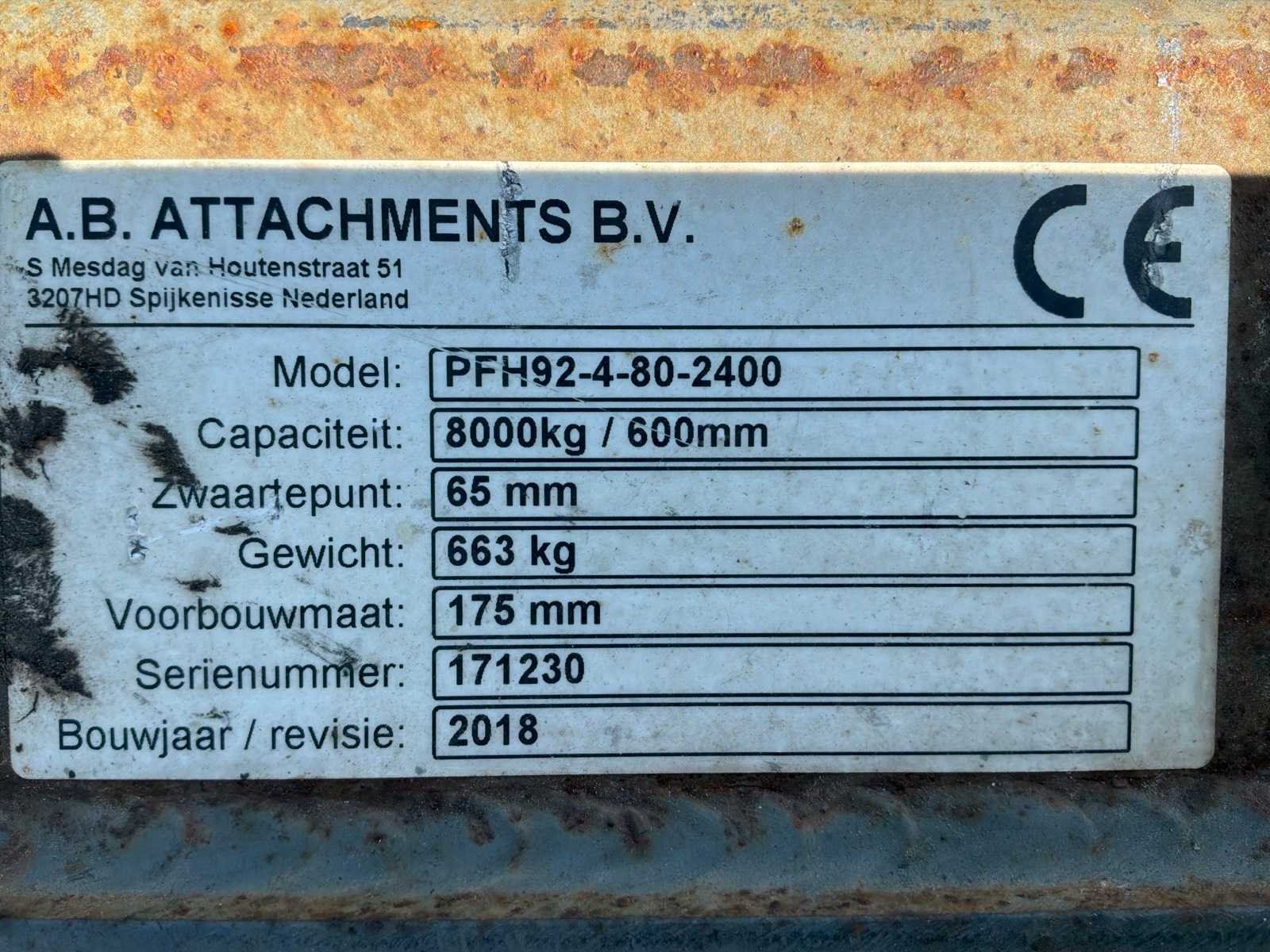 Capaciteit: 8000kg, voorbouwmaat 175mm. Merk: AB attachements Type: PFH92-4-80-2400 Bouwjaar: 2018 Serienummer: 171230 Eigen gewicht: 663kg