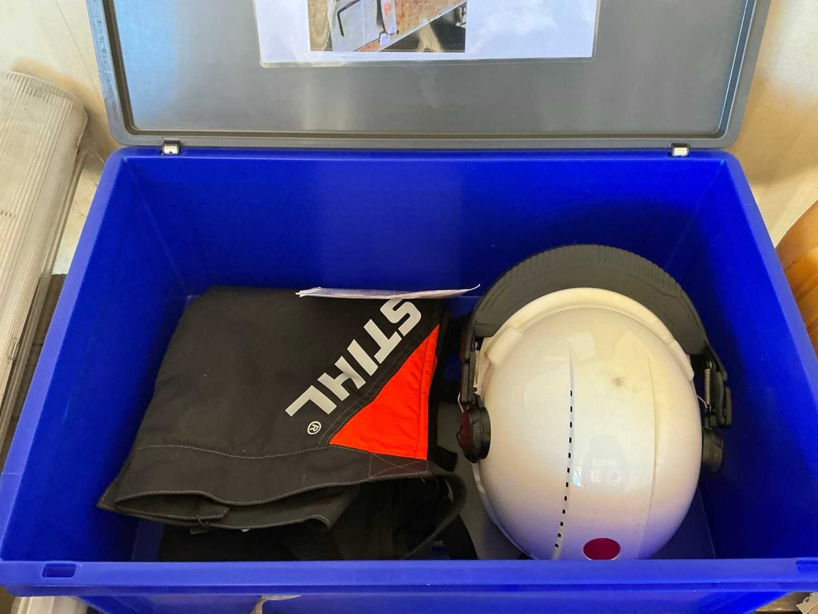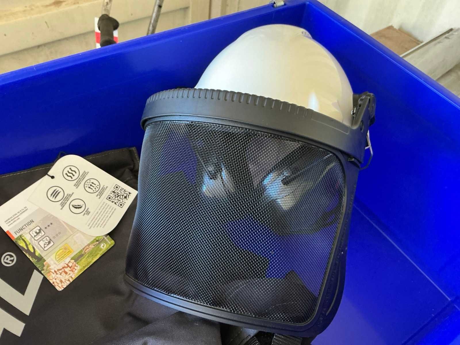 Bestaande uit: veiligheidshelm met gelaats en gehoorbescherming, en veiligheidsbroek