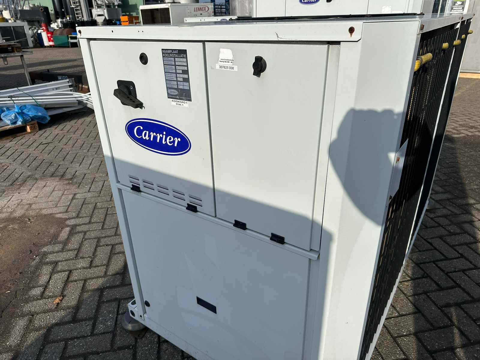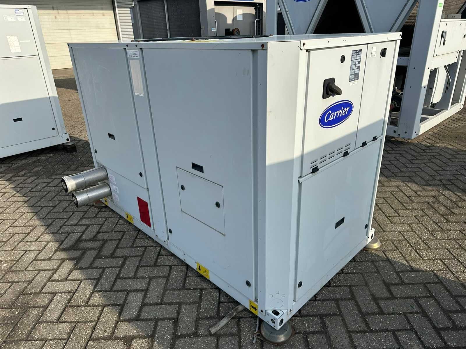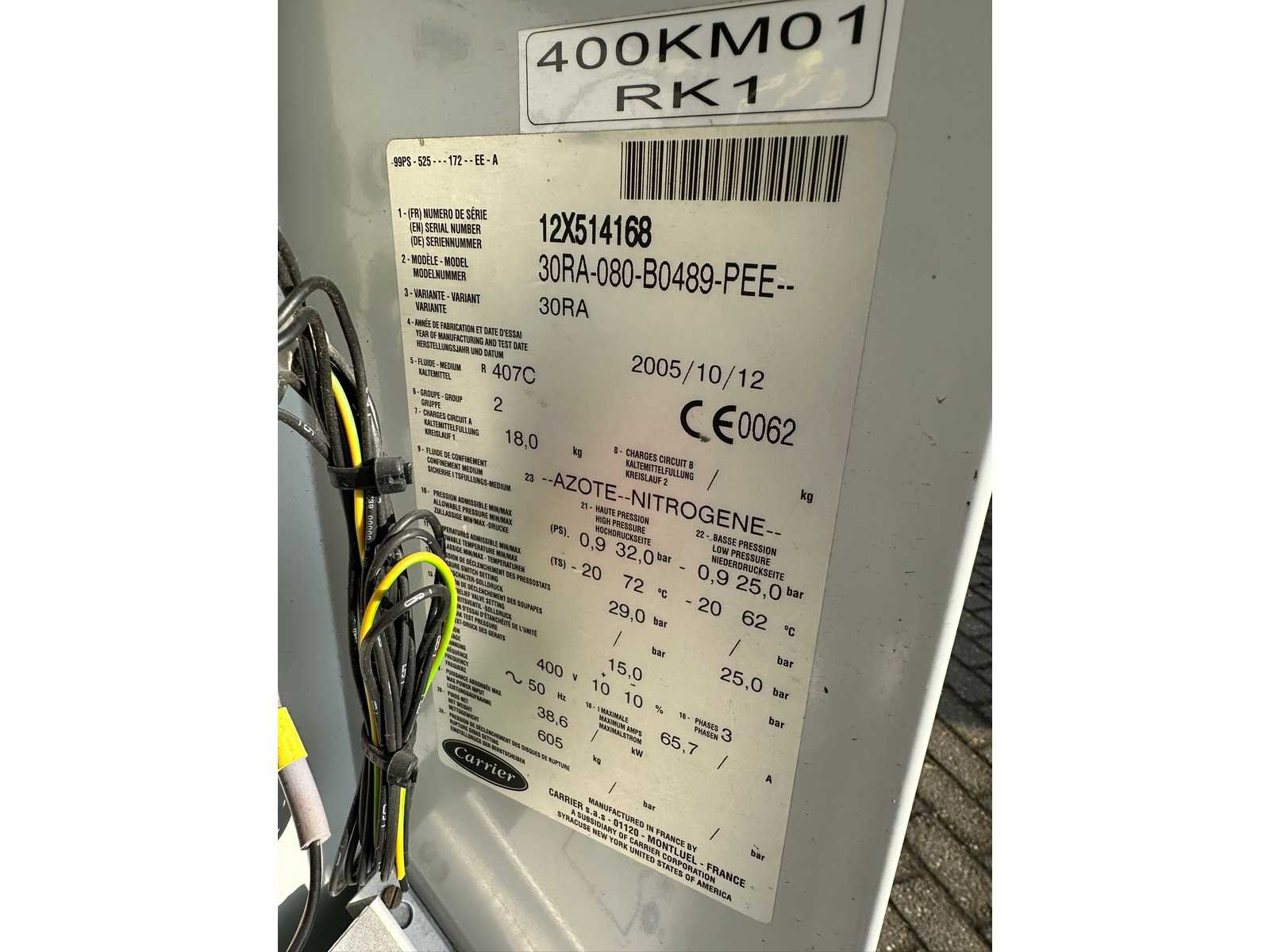 Koelvermogen: 79kW. Type koudemiddel: R407c. Merk: Carrier Type: 30RA-080-B049-PEE Bouwjaar: 2005 Aansluiting: 400V Eigen gewicht: 605kg Totale afmeting L: 2060mm Totale afmeting Breedte: 1370mm Totale afmeting Hoogte: 1380mm