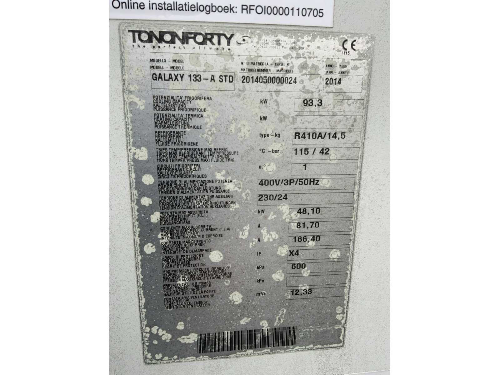 Koelvermogen: ca 130kW. Type koudemiddel: R410a. Merk: TononForty Type: GALAXY 133-A STD Bouwjaar: 2014 Aansluiting: 400V Totale afmeting L: 3100mm Totale afmeting Breedte: 1400mm Totale afmeting Hoogte: 2100mm