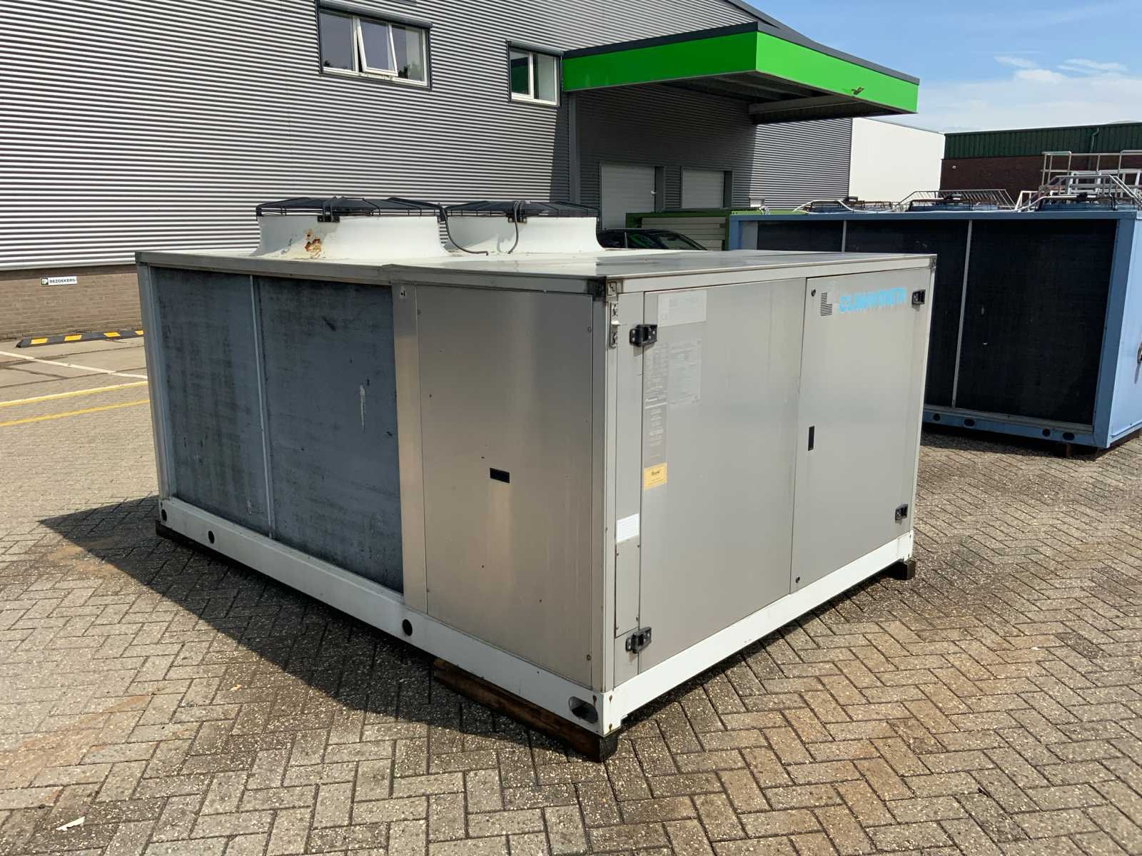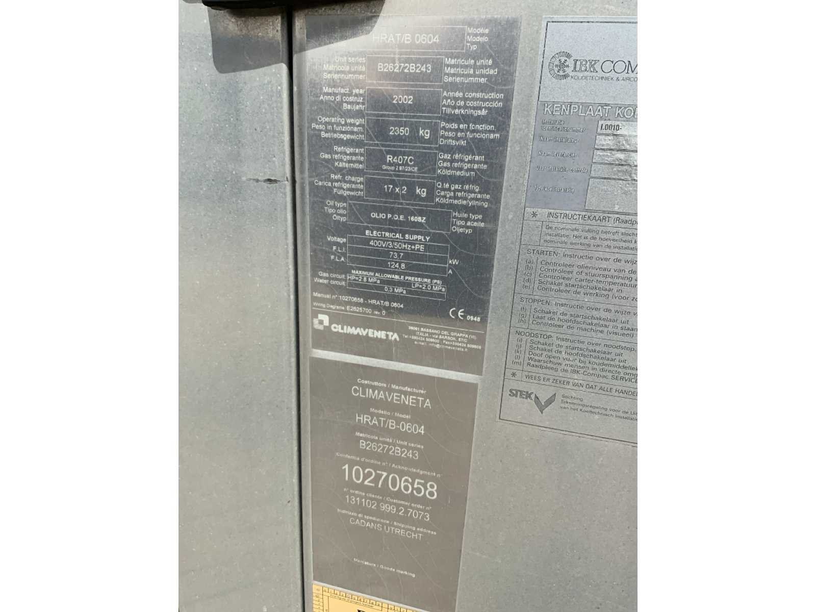Koelvermogen: 231kW. Type koudemiddel: R407c. Merk: Climaveneta Type: HRAT/B 0604 Bouwjaar: 2002 Aansluiting: 400V Eigen gewicht: 2350kg Totale afmeting L: 3450mm Totale afmeting Breedte: 2200mm Totale afmeting Hoogte: 1700mm