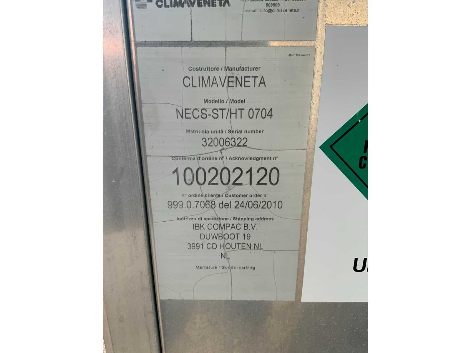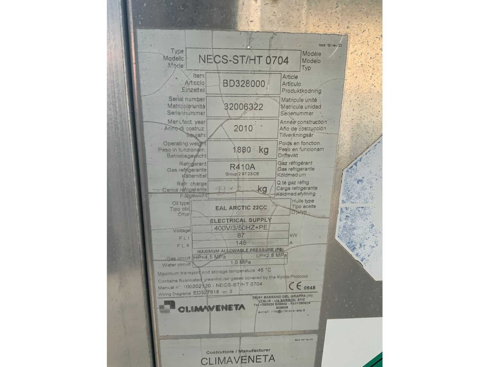 Koelvermogen: 207kW. Type koudemiddel: R410a. Merk: Climaveneta Type: NECS-ST/HT 0704 Bouwjaar: 2010 Aansluiting: 400V Eigen gewicht: 1880kg Totale afmeting L: 3400mm Totale afmeting Breedte: 2400mm Totale afmeting Hoogte: 2250mm