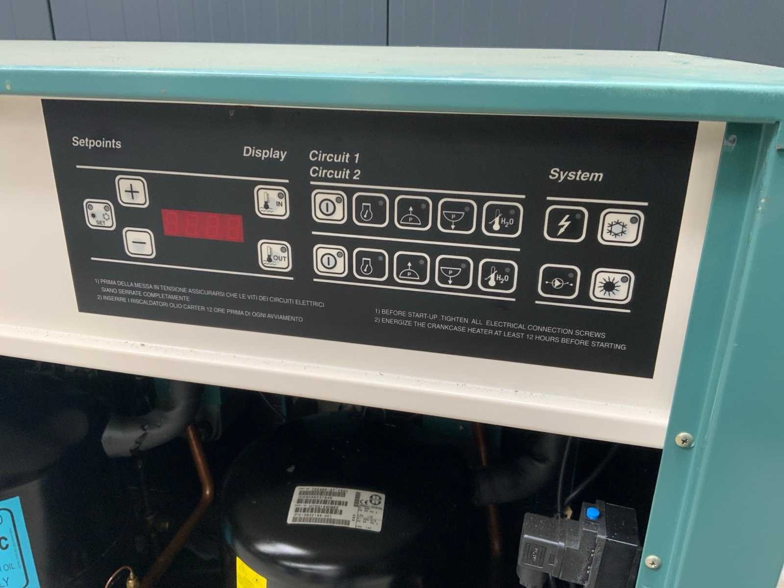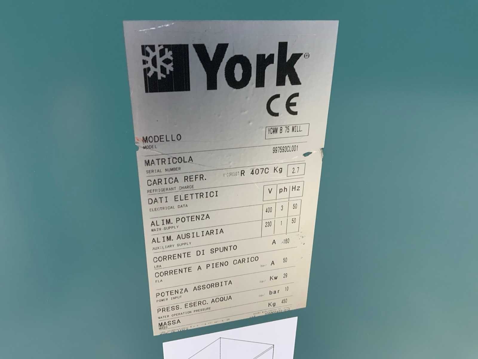 Koelvermogen: +/- 70kW. Type koudemiddel: R407c. Merk: York Type: YCWM B 75 MILL Eigen gewicht: 450kg Totale afmeting L: 1210mm Totale afmeting Breedte: 850mm Totale afmeting Hoogte: 1050mm