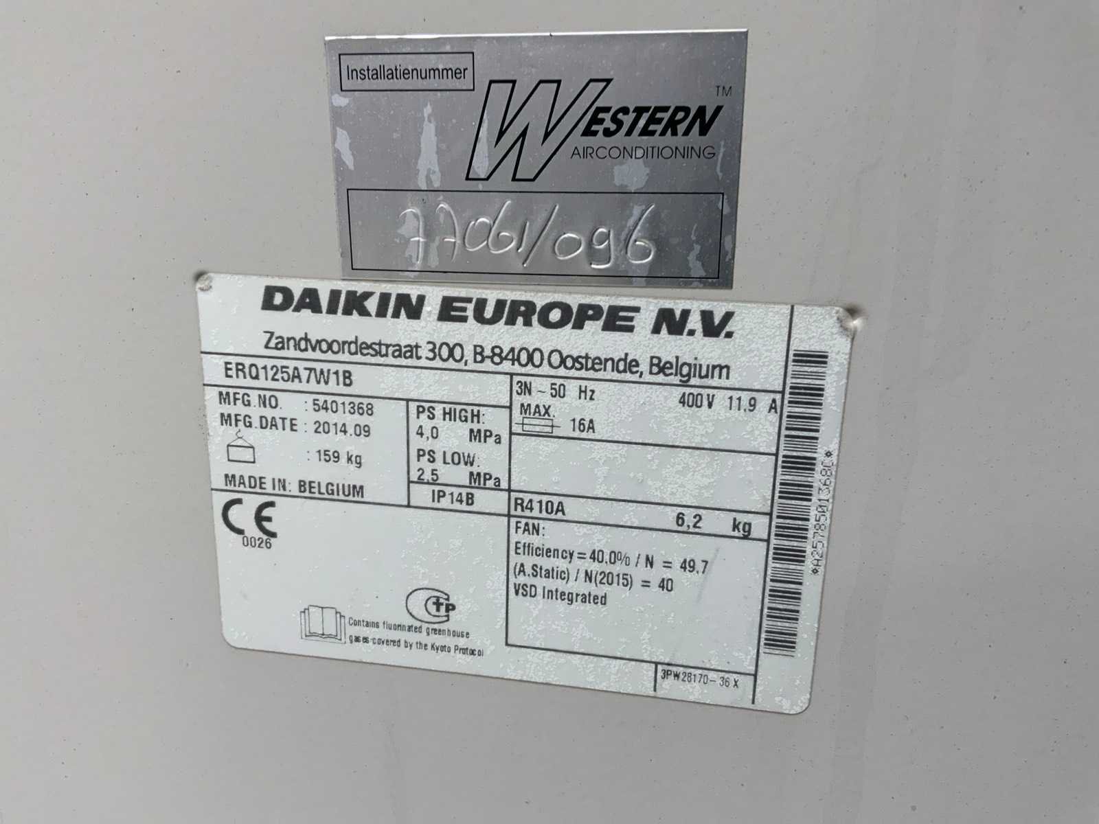 Type koudemiddel: R410a. Merk: Daikin Type: ERQ125A7W1B Bouwjaar: 2014 Aansluiting: 400V Totale afmeting L: 630mm Totale afmeting Breedte: 760mm Totale afmeting Hoogte: 1750mm