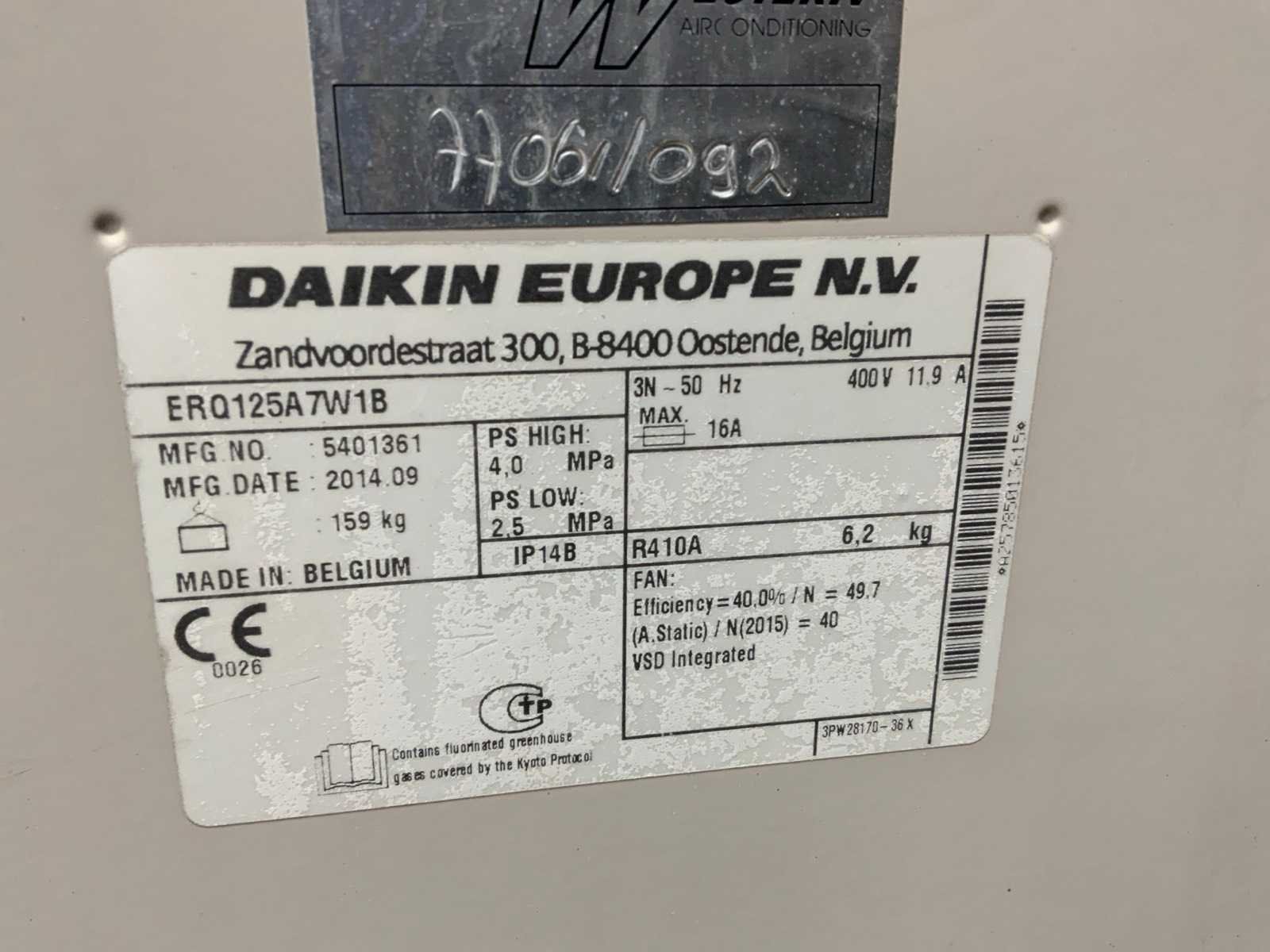 Type koudemiddel: R410a. Merk: Daikin Type: ERQ125A7W1B Bouwjaar: 2014 Aansluiting: 400V Totale afmeting L: 630mm Totale afmeting Breedte: 760mm Totale afmeting Hoogte: 1750mm
