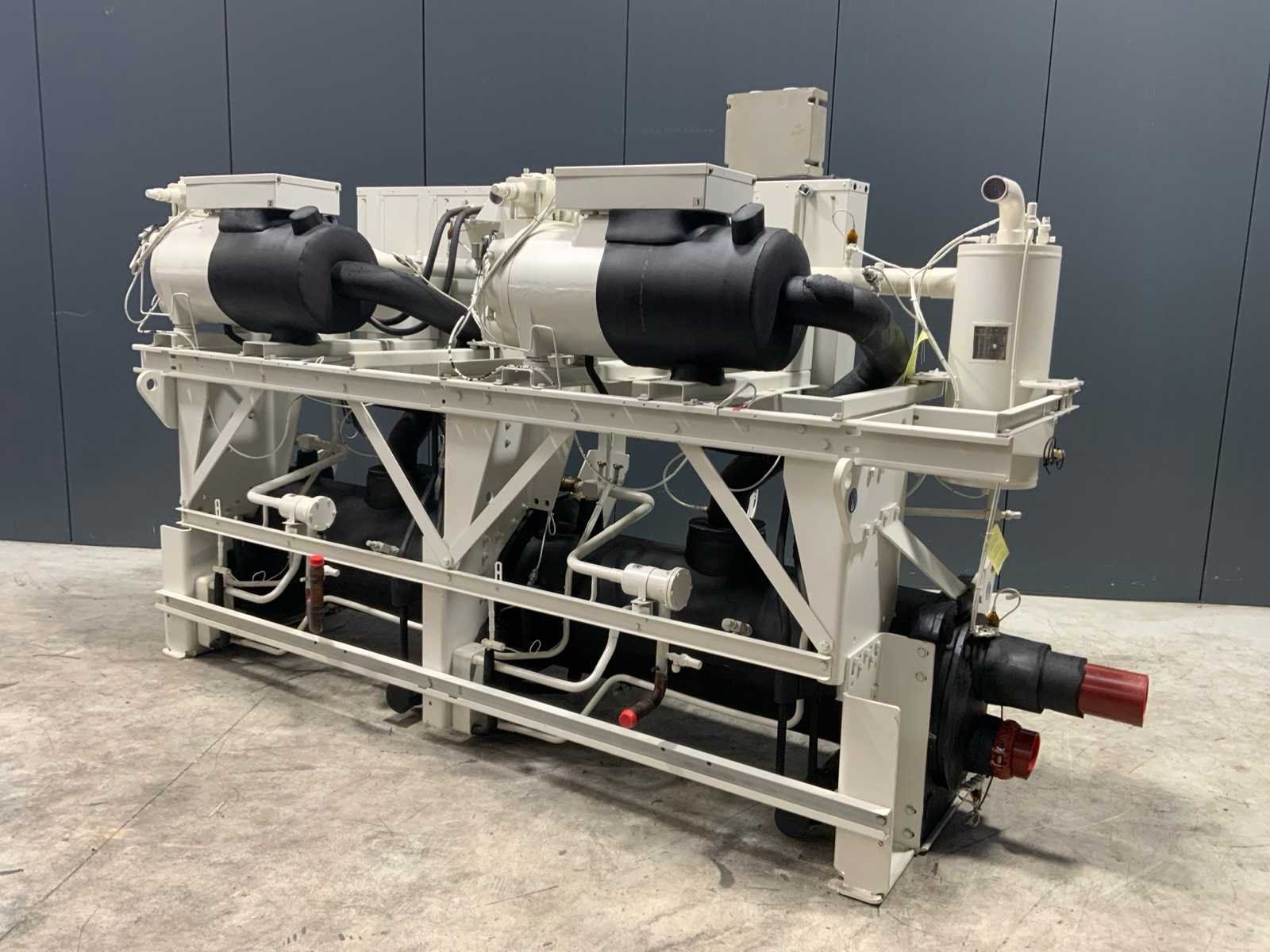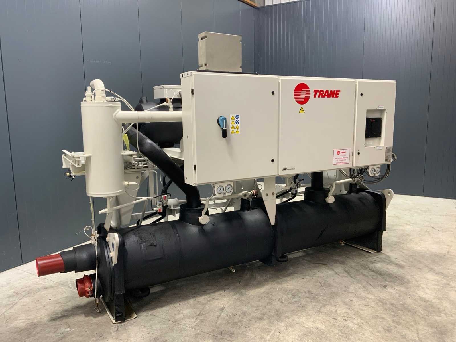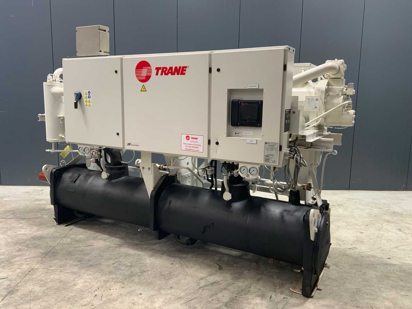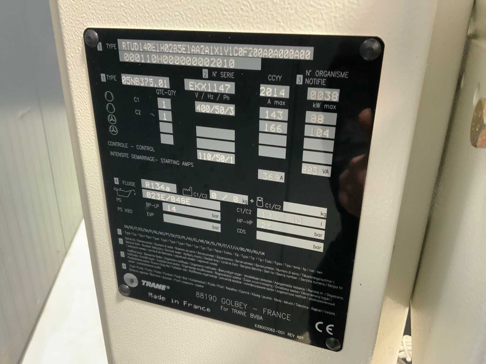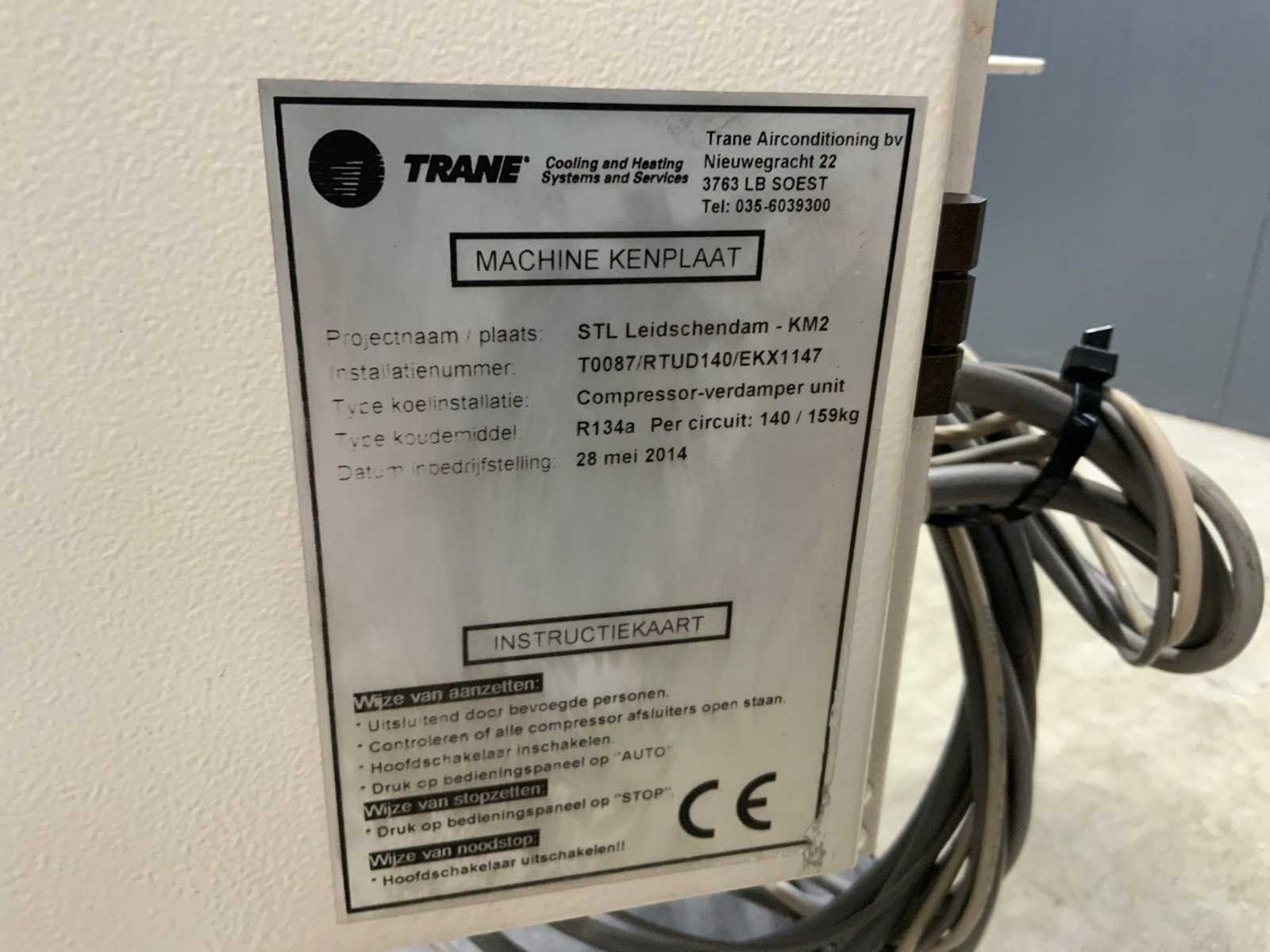 Koelvermogen: 474kW. Koudemiddel: R134a. Voorzien van documentatie. Ook onderdeel van combinatiekavel 42. Merk: Trane Type: RTUD140E1H02B5E1AA Bouwjaar: 2014 Serienummer: EKX1147 Aansluiting: 400V Totale afmeting L: 3600mm Totale afmeting Breedte: 1100mm Totale afmeting Hoogte: 2200mm