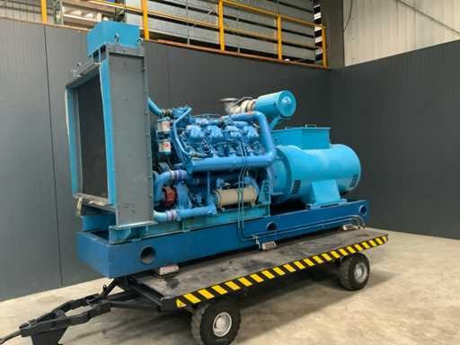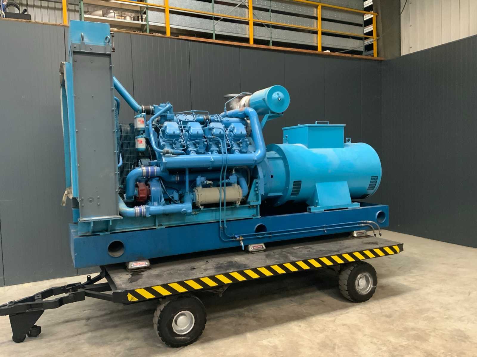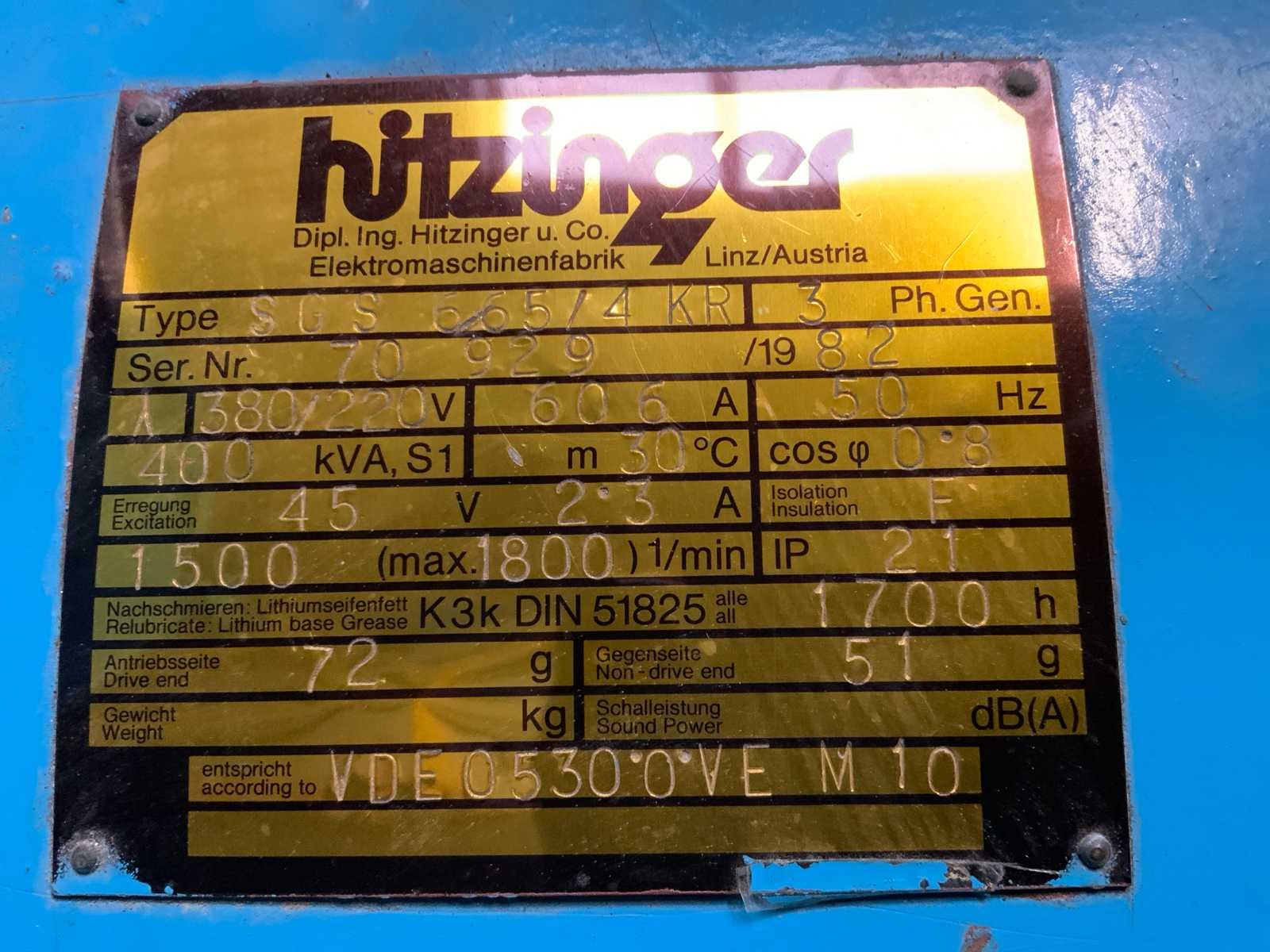Capaciteit: 400kVa. Voorzien van Dorman dieselmotor type 8QT. Voorzien van Hitzinger generator type SGS 665 / 4 KR. Gebruikt als noodstroom generator. Aantal draaiuren: 336 uur. Voorzien van besturingspaneel, documentatie en tekeningen. Transportkar niet inbegrepen. Merk: Hitzinger Type: SGS 665/4 KR Bouwjaar: 1982 Capaciteit.: 400kVA Type motor: Dorman 8QT Aantal cilinders: 8 Motorvermogen (kW): 202kW Totale afmeting L: 4200mm Totale afmeting Breedte: 1570mm Totale afmeting Hoogte: 2500mm
