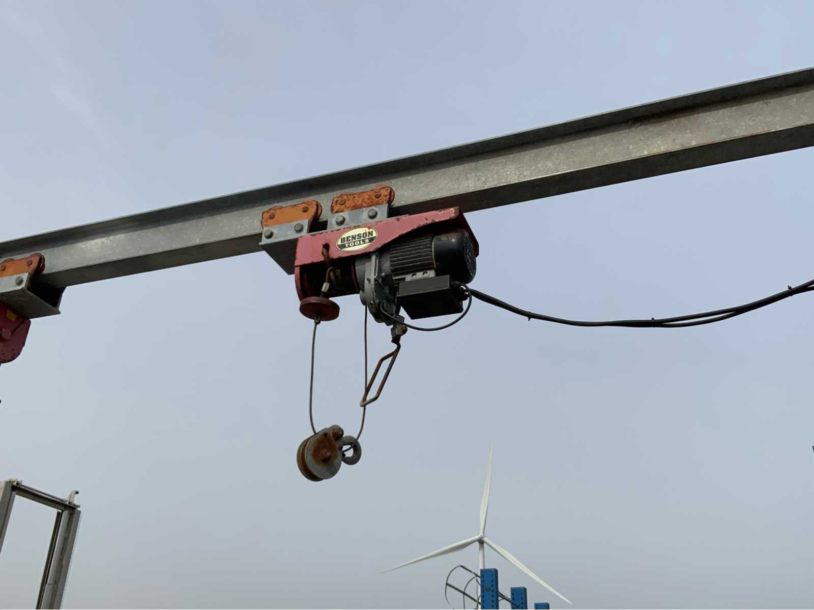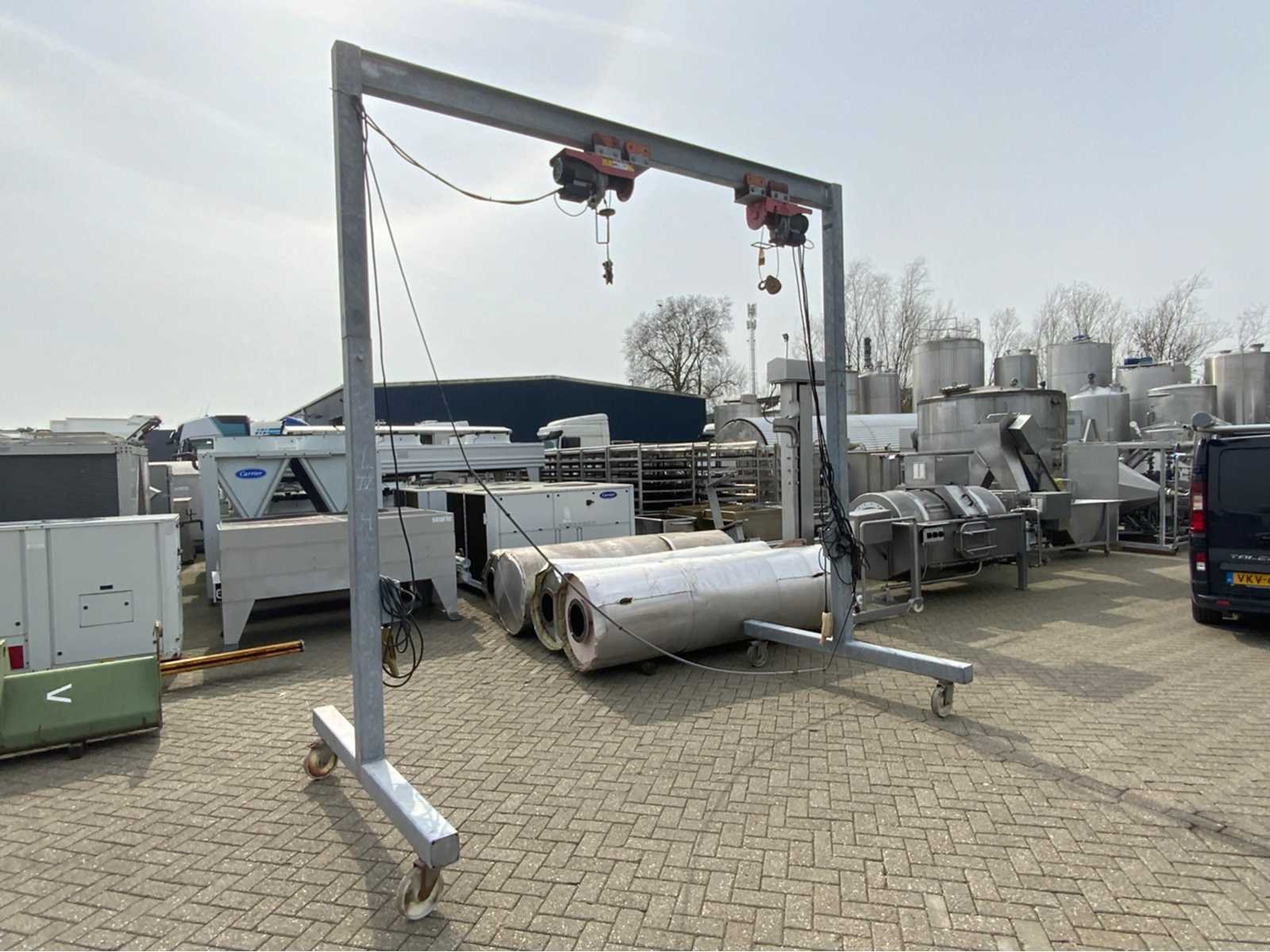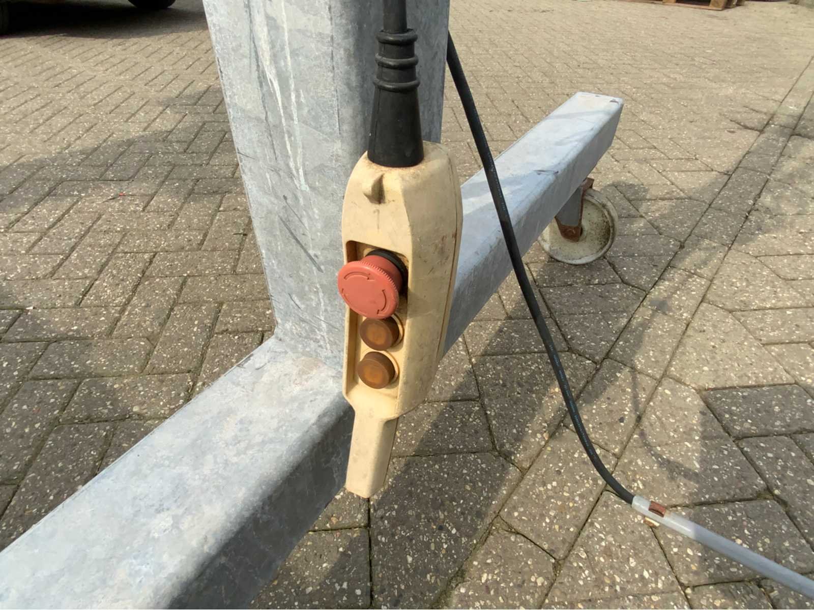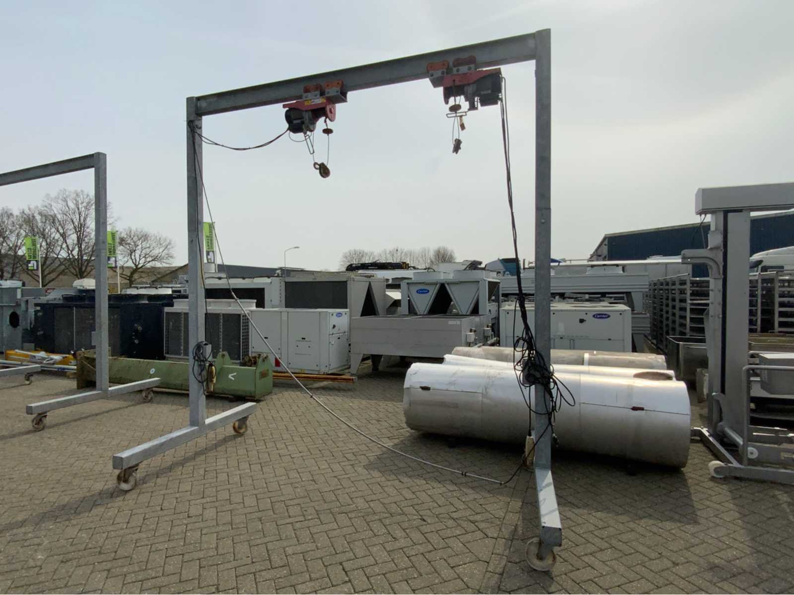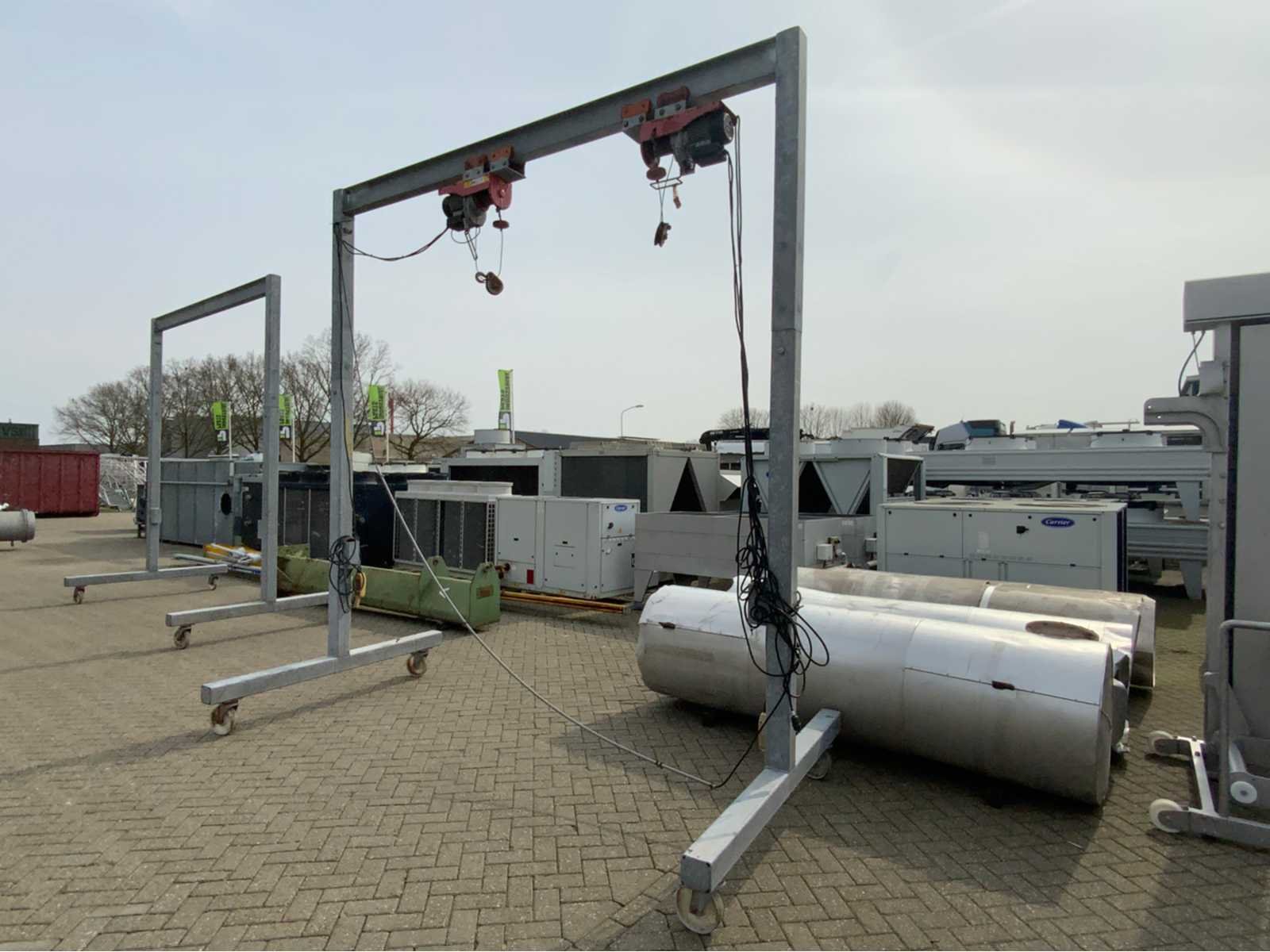 Maximale hijs hoogte: 4000mm. Voorzien van 2x elektrische kettingtakels capaciteit 500kg en 1000kg. Reeds gedemonteerd voor transport. Totale afmeting L: 2000mm Totale afmeting Breedte: 3800mm Totale afmeting Hoogte: 4000mm