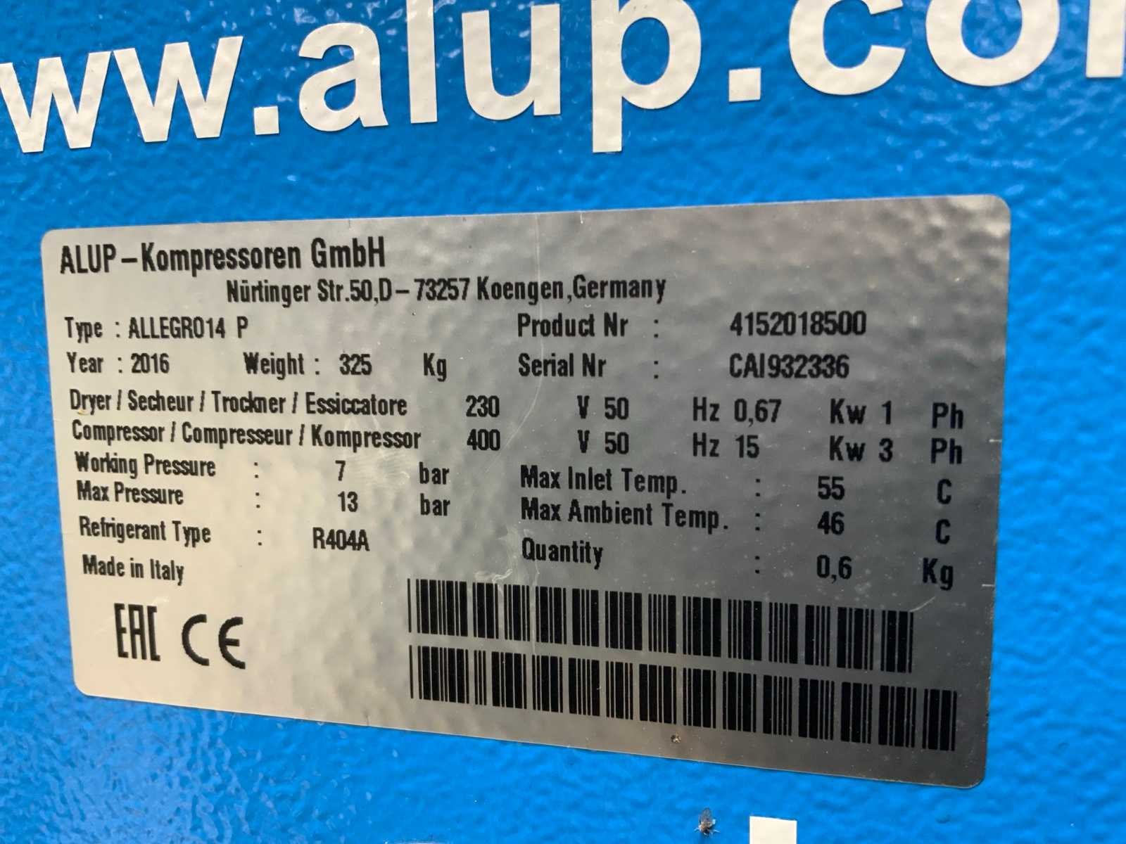 Merk: Alup Type: Allegro14P Bouwjaar: 2016 Capaciteit.: 13bar Luchtdroger: true Aansluiting: 230V Eigen gewicht: 325kg