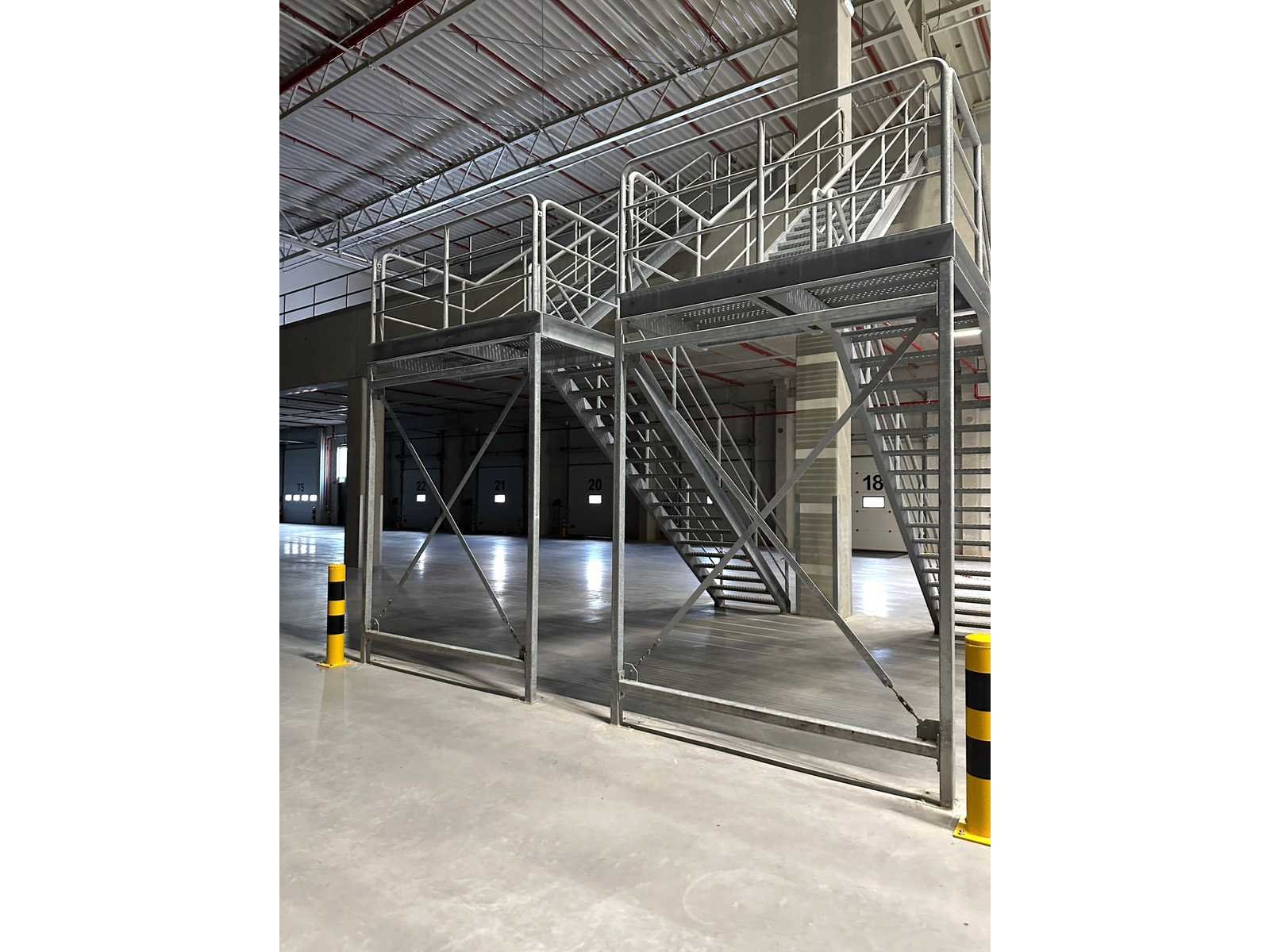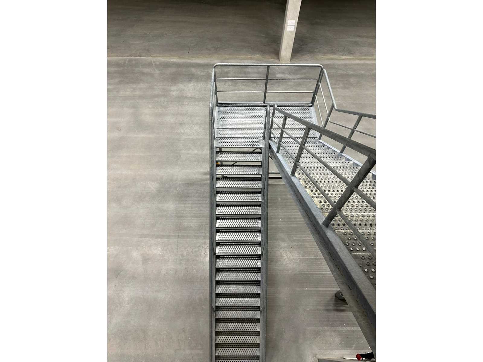 Totale trap hoogte: ca 750cm. Reeds gedemonteerd voor transport. Bestaand uit: gegalvaniseerd trap (rechter dubbeletrap van foto) Materiaal: Gegalvaniseerd Staal
