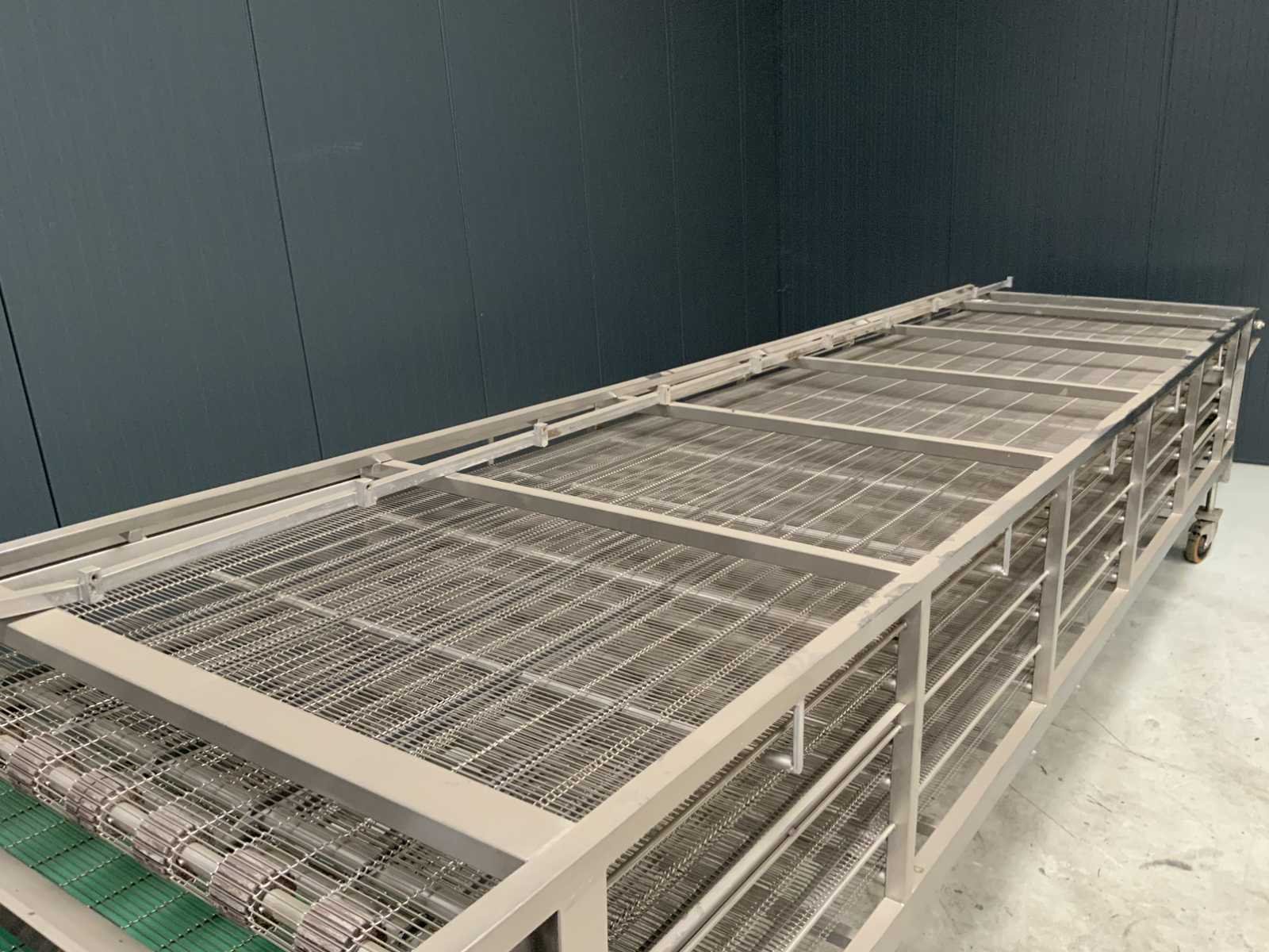 Drie laags rvs koelband. Compleet met aandrijving en geleiding rails. Verrijdbaar. Band afmetingen: 7000x1360mm. Merk: Alfa-Laval Koppens Type: KT3G 5500/1350 Totale afmeting L: 7000mm Totale afmeting Breedte: 1500mm Totale afmeting Hoogte: 1800mm