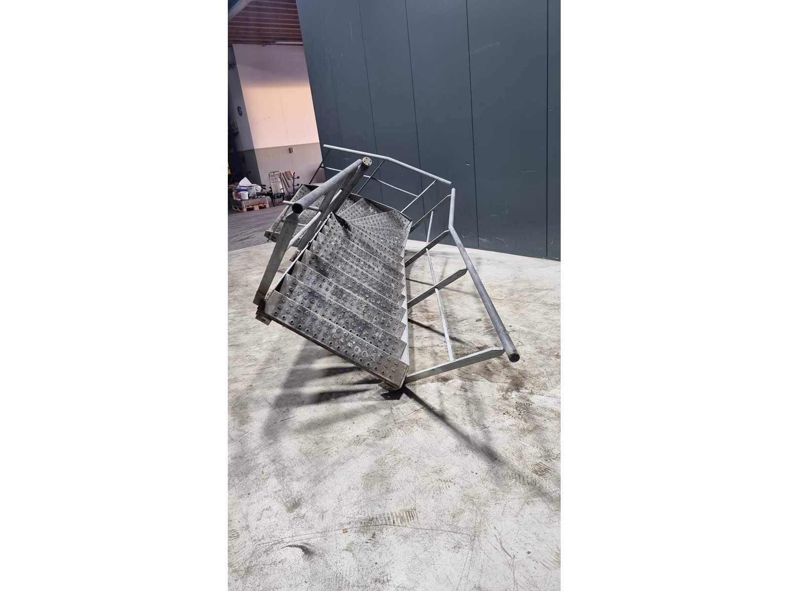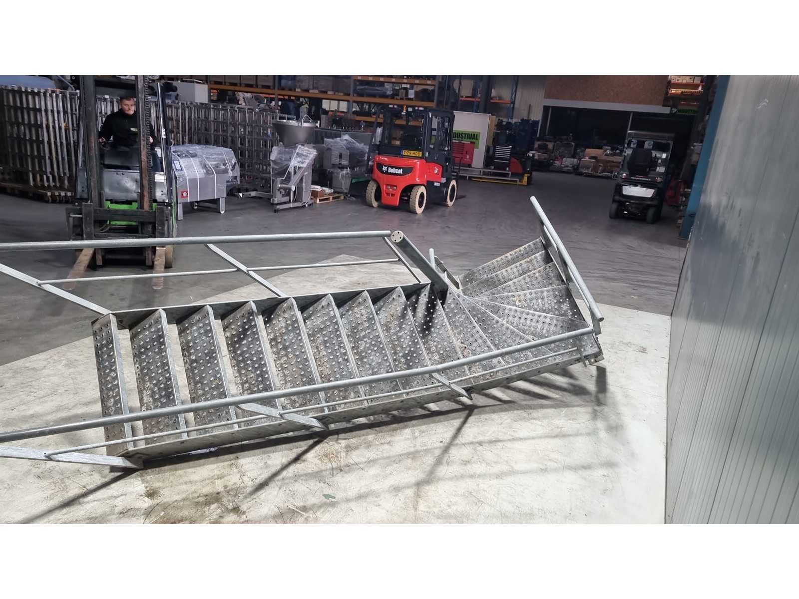 Aantal tredes: 16. Trap hoogte: ca 3500mm. Rechtsdraaiend 90 graden. Lengte: 5000cm Breedte: 2000cm Hoogte: 1400cm Materiaal: Gegalvaniseerd Staal