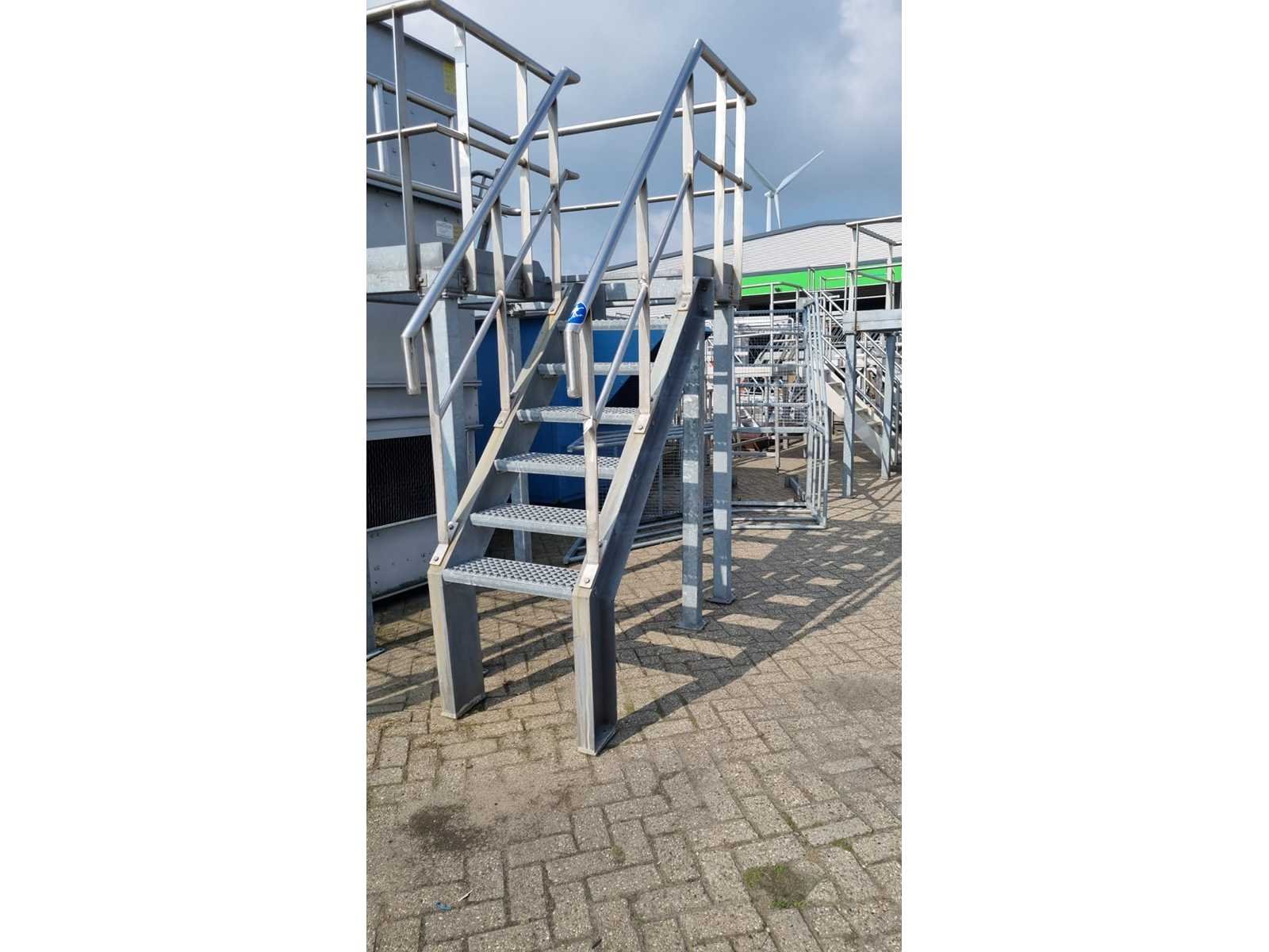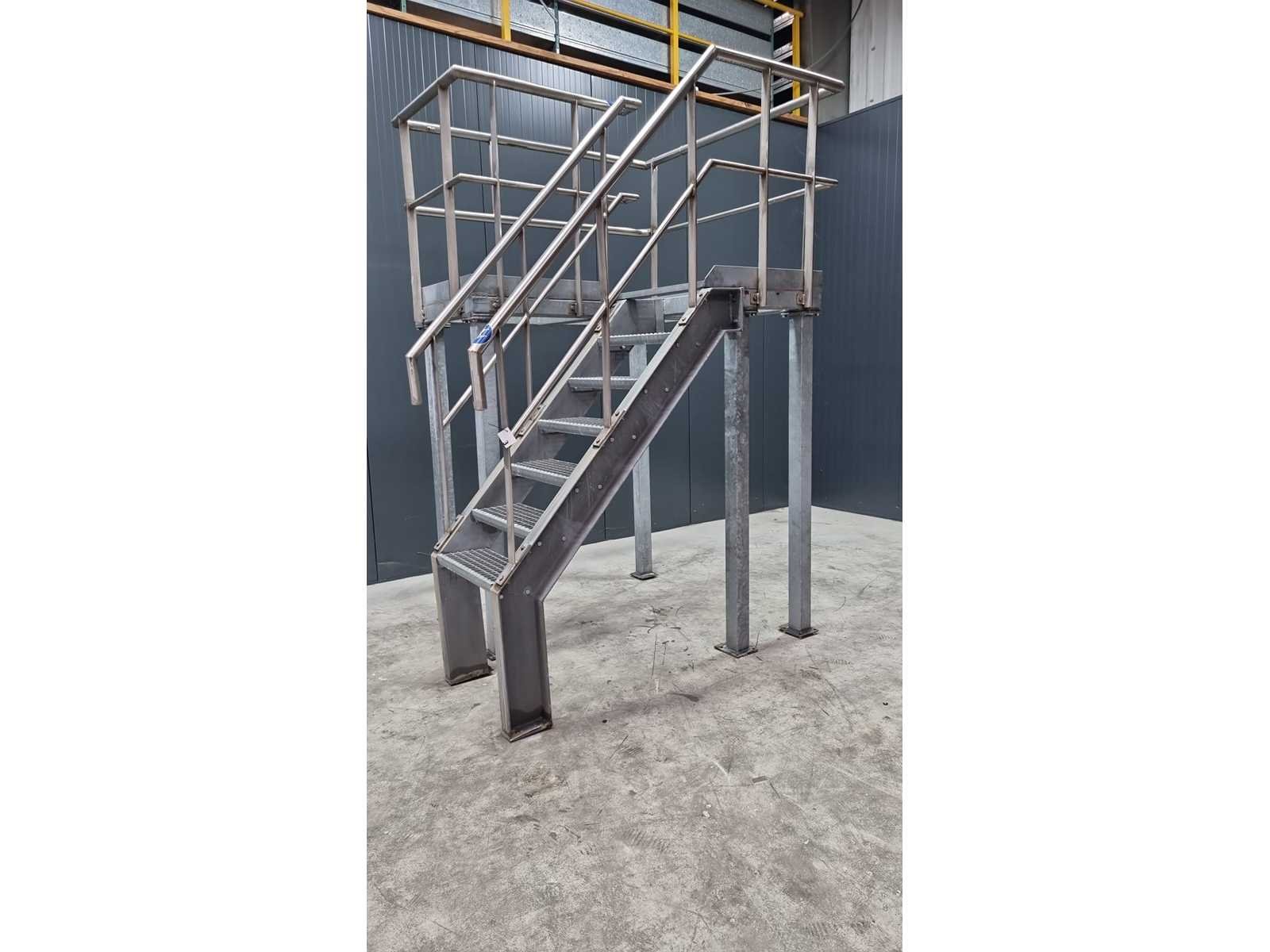 Gegalvaniseerd staal bordes met rvs leuning. Hoogte bordes: 1900mm. Lengte: 2000cm Breedte: 1420cm Hoogte: 2900cm Materiaal: Gegalvaniseerd staal