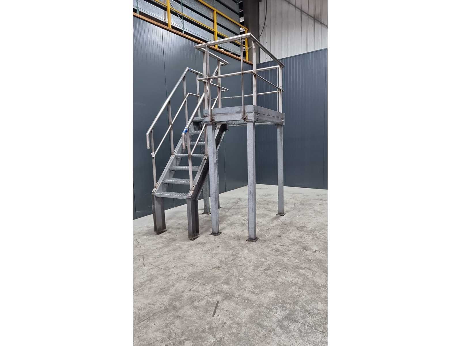 Gegalvaniseerd staal bordes met rvs leuning. Hoogte bordes: 1900mm. Lengte: 2000cm Breedte: 1420cm Hoogte: 2900cm Materiaal: Gegalvaniseerd staal