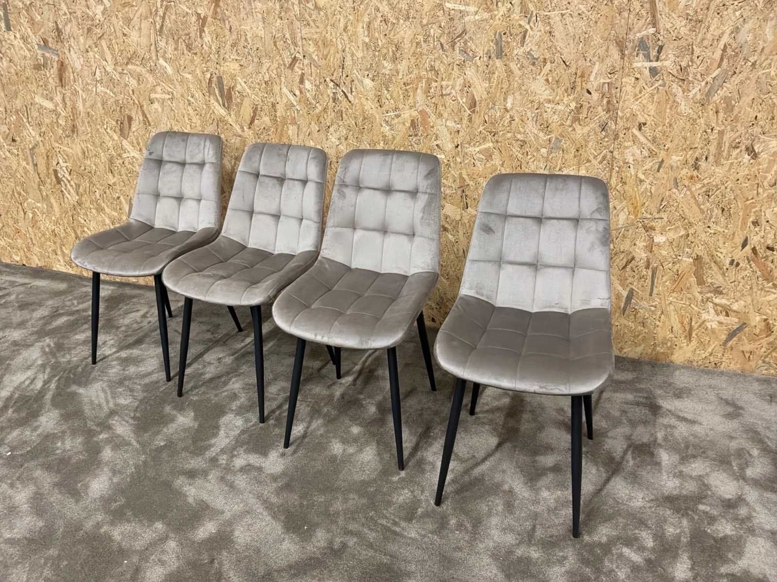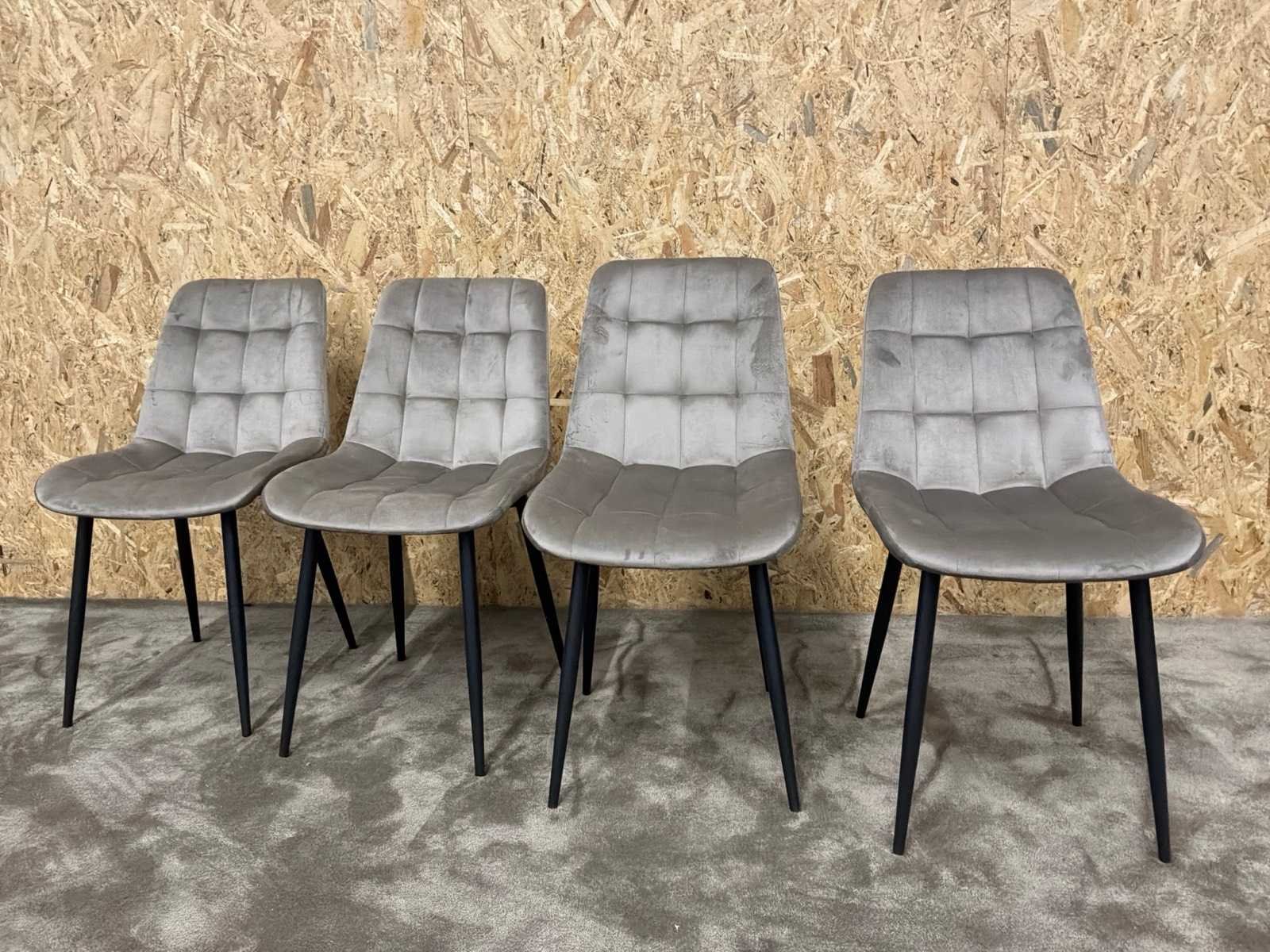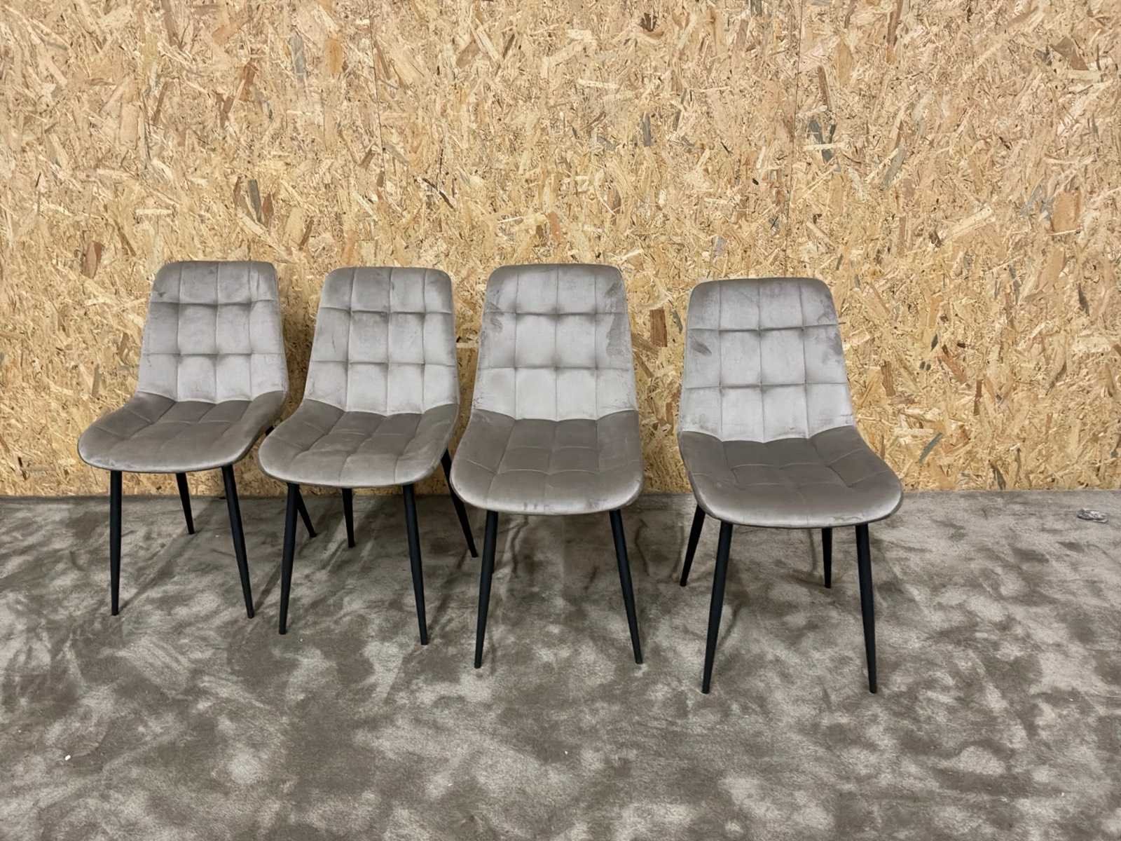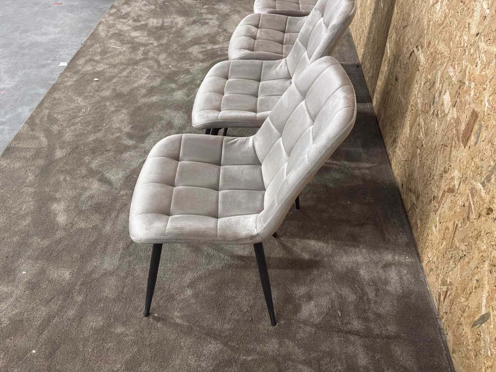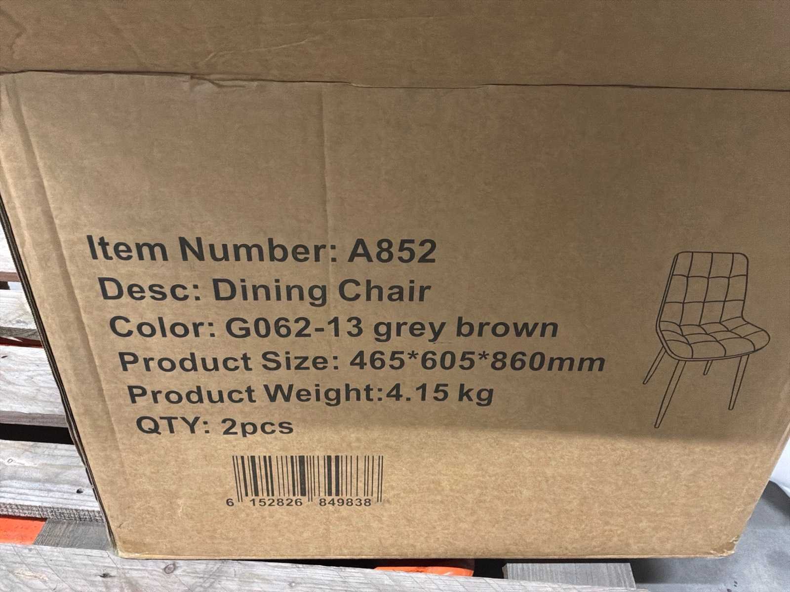 Eetkamerstoelen bevinden zich in doos. 2 per doos, totaal 3 dozen. Model: Raven Kleur: Grijs-bruin Lengte: 47cm Breedte: 61cm Hoogte: 86cm Materiaal: Stof