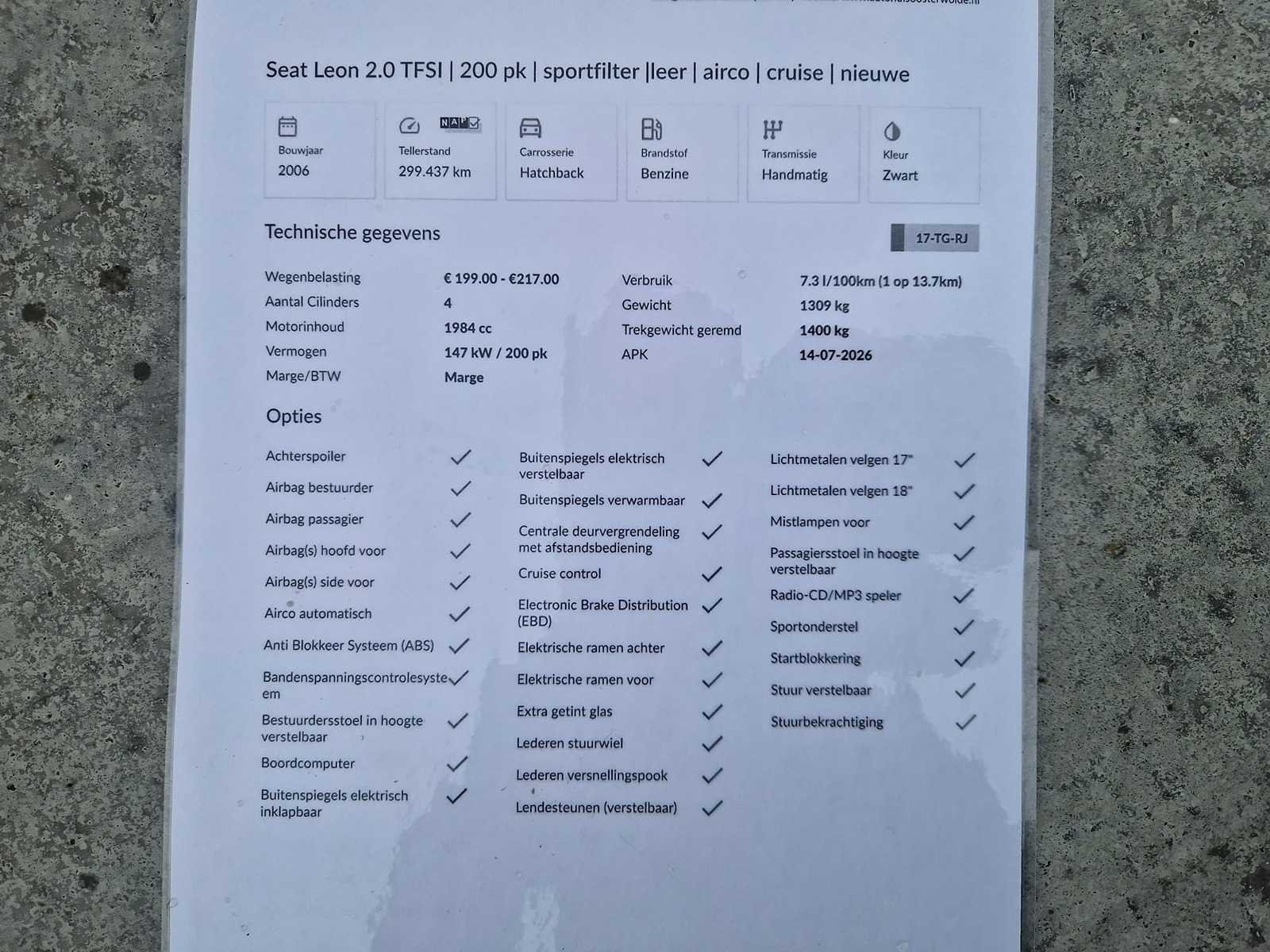 Kenteken: 17-TG-RJ Merk: SEAT Model: Leon Type: 2.0 TFSI FR Bouwjaar: 2006 Afgelezen kilometerstand: 299477km Cilinderinhoud: 1984cc Vermogen (kW): 147kW Brandstof: Benzine Chassisnummer: VSSZZZ1PZ7R013605 Datum eerste toelating: 2006-09-01 APK vervaldatum: 2026-07-14 Vermogen (pk): 197hp Aandrijving: Voorwiel Aantal zitplaatsen: 5 Maximaal trekgewicht ongeremd: 700kg Maximaal trekgewicht geremd: 1400kg Kleur: zwart Transmissie: Handgeschakeld (6) Emissieklasse: 4 Aantal deuren: 4 Ledig gewicht: 1309kg Bruto BPM (NL): 7638€ Rest BPM: 0€ Aantal cilinders: 4 Carrosserie: MPV Carfax Link: https://was.carfax.eu/v0/api/ccdid/5100016408/svc/201/vinreg/17TGRJ/checksum/eyJhbGciOiJIUzI1NiIsInR5cCI6IkpXVCJ9.eyJleHAiOjE3ODE4NTM5MjN9.I6RZtnXk55XmzcpZBptF-Ch99iJdnn1Vgs_H7WHih6U