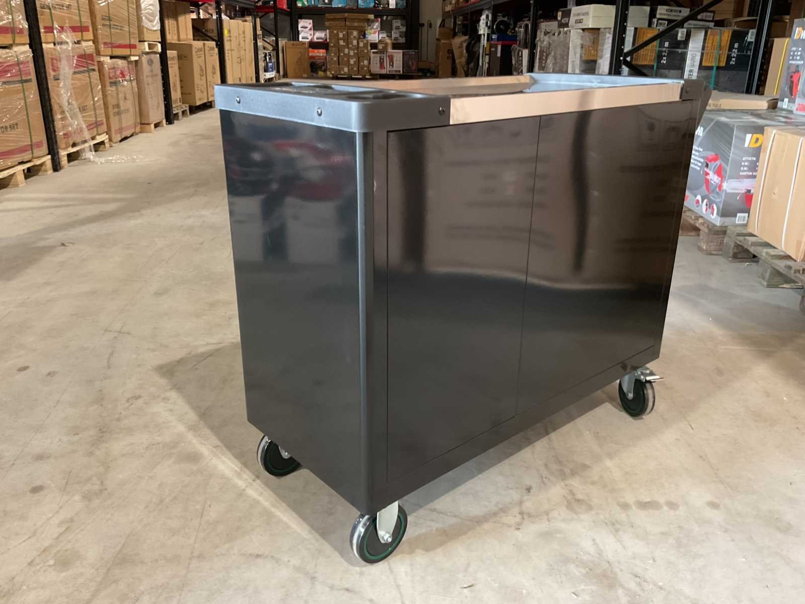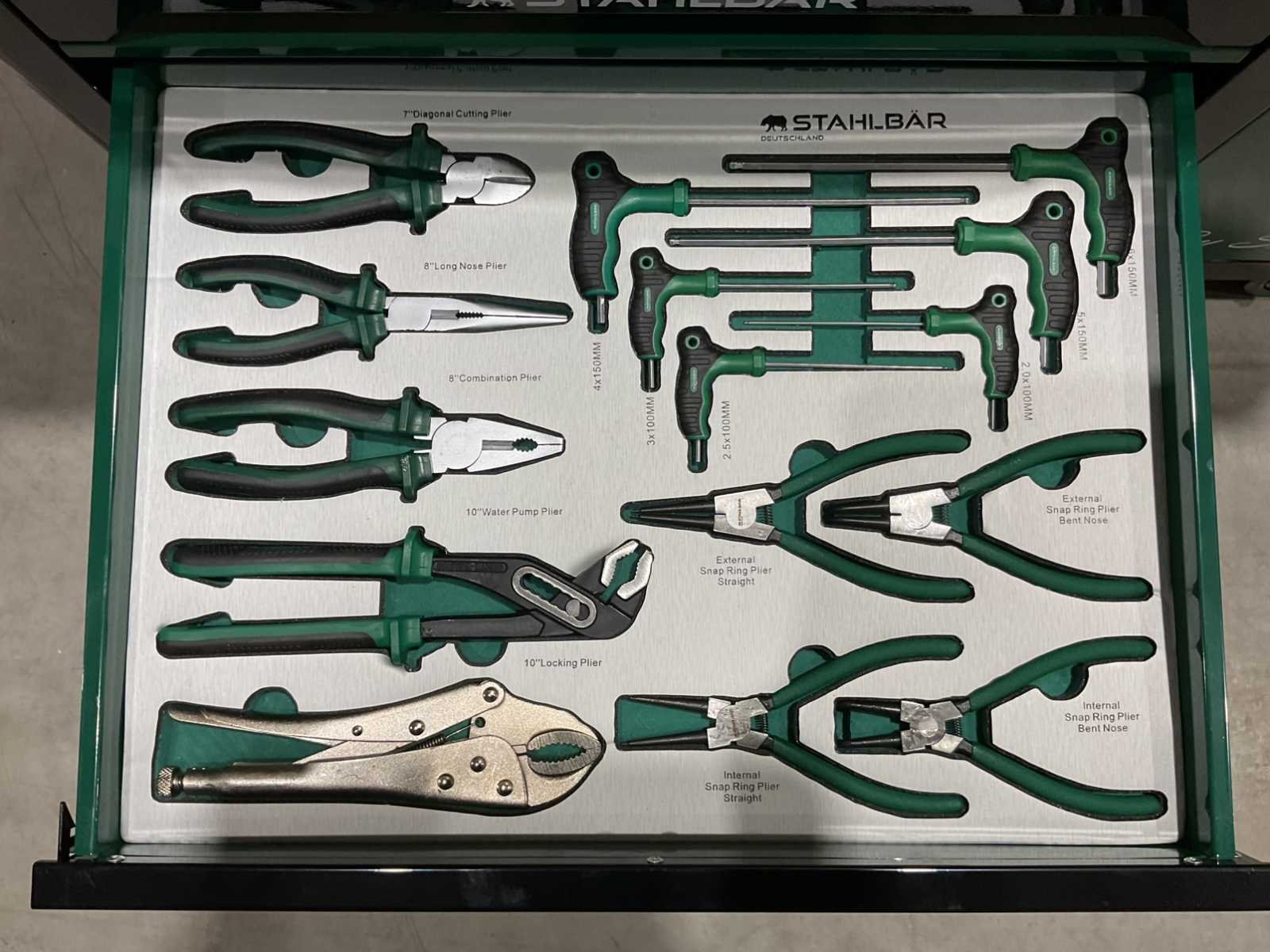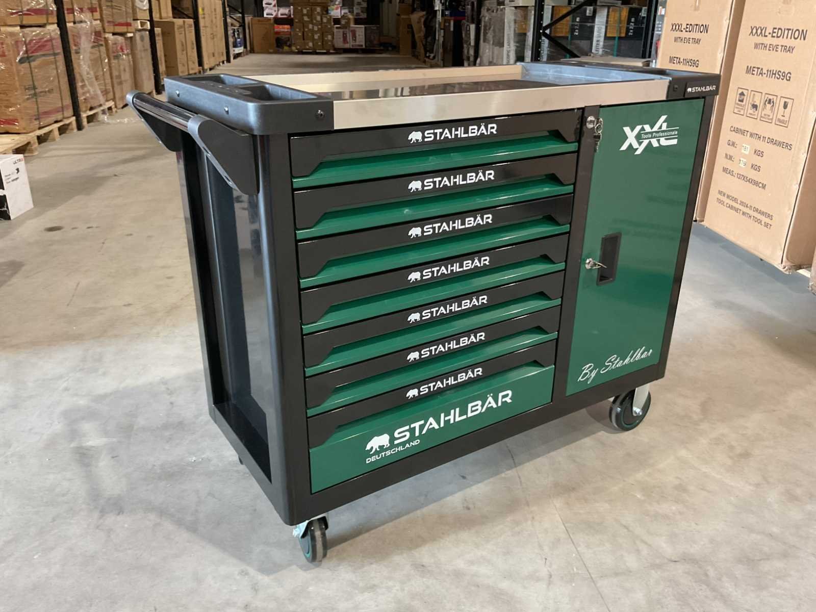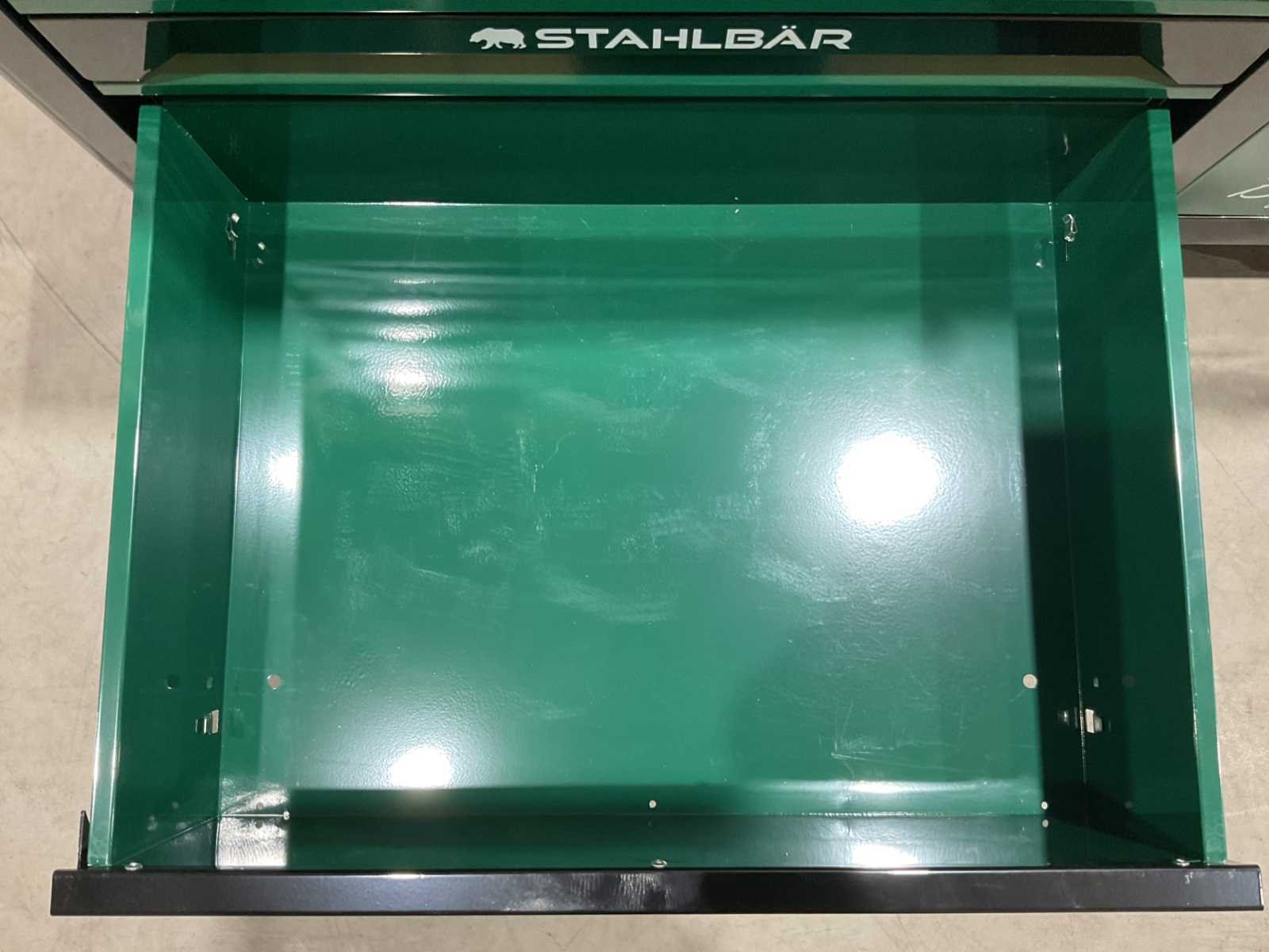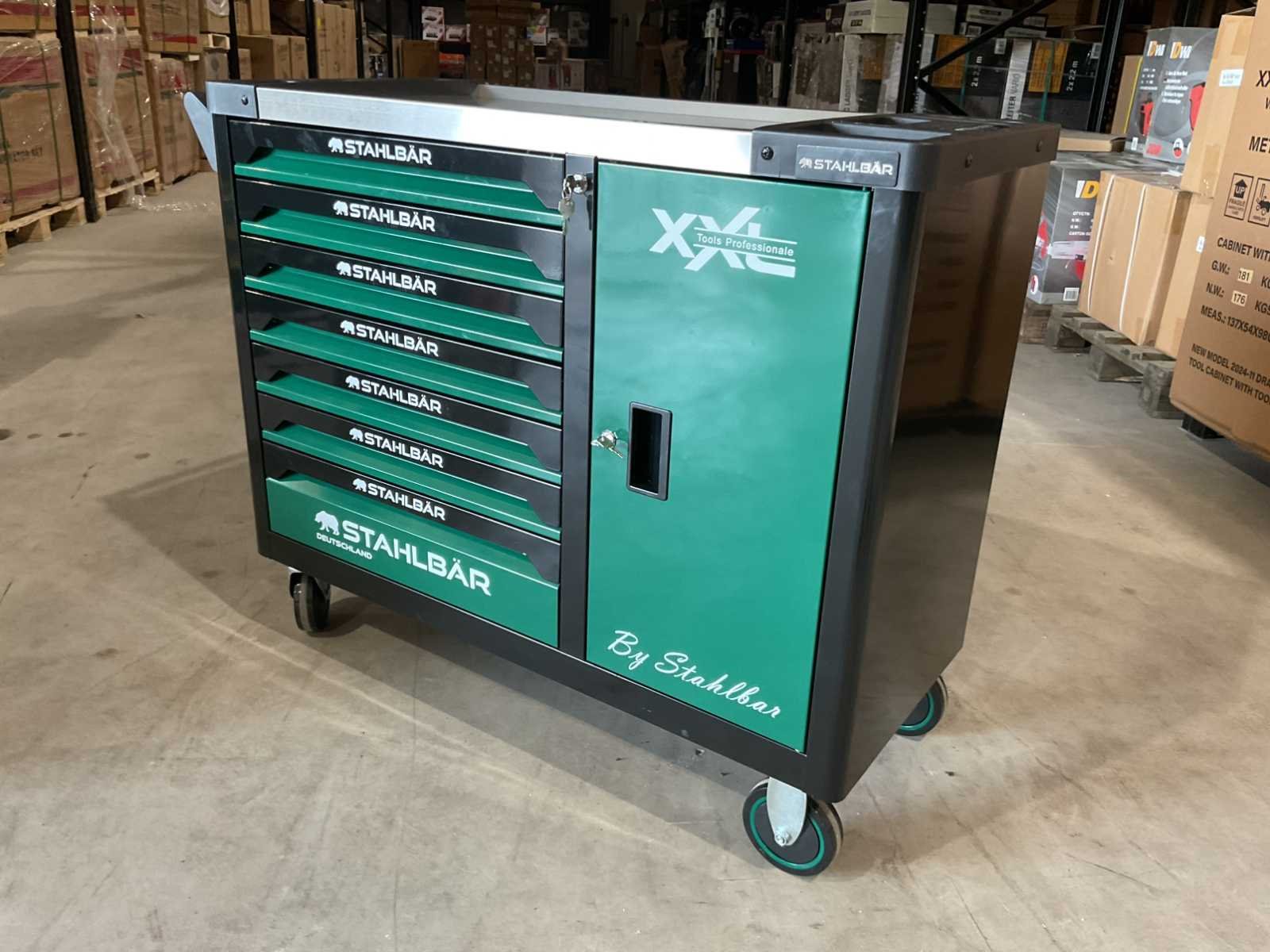 Voorzien van 7 lades waarvan 7 gevuld met gereedschap; zijdeur; professioneel chroom-vanadium gereedschap; heavy duty gereedschapswagen; 4 wielen; stevig handvat; ongebruikt in doos (transport afmetingen 110x50x80 cm) Merk: Stahlbär Type: Deutschland jumbo Bouwjaar: 2025 Aantal laden: 7 Met inhoud: true Eigen gewicht: 75kg Totale afmeting L: 1100mm Totale afmeting Breedte: 500mm Totale afmeting Hoogte: 800mm