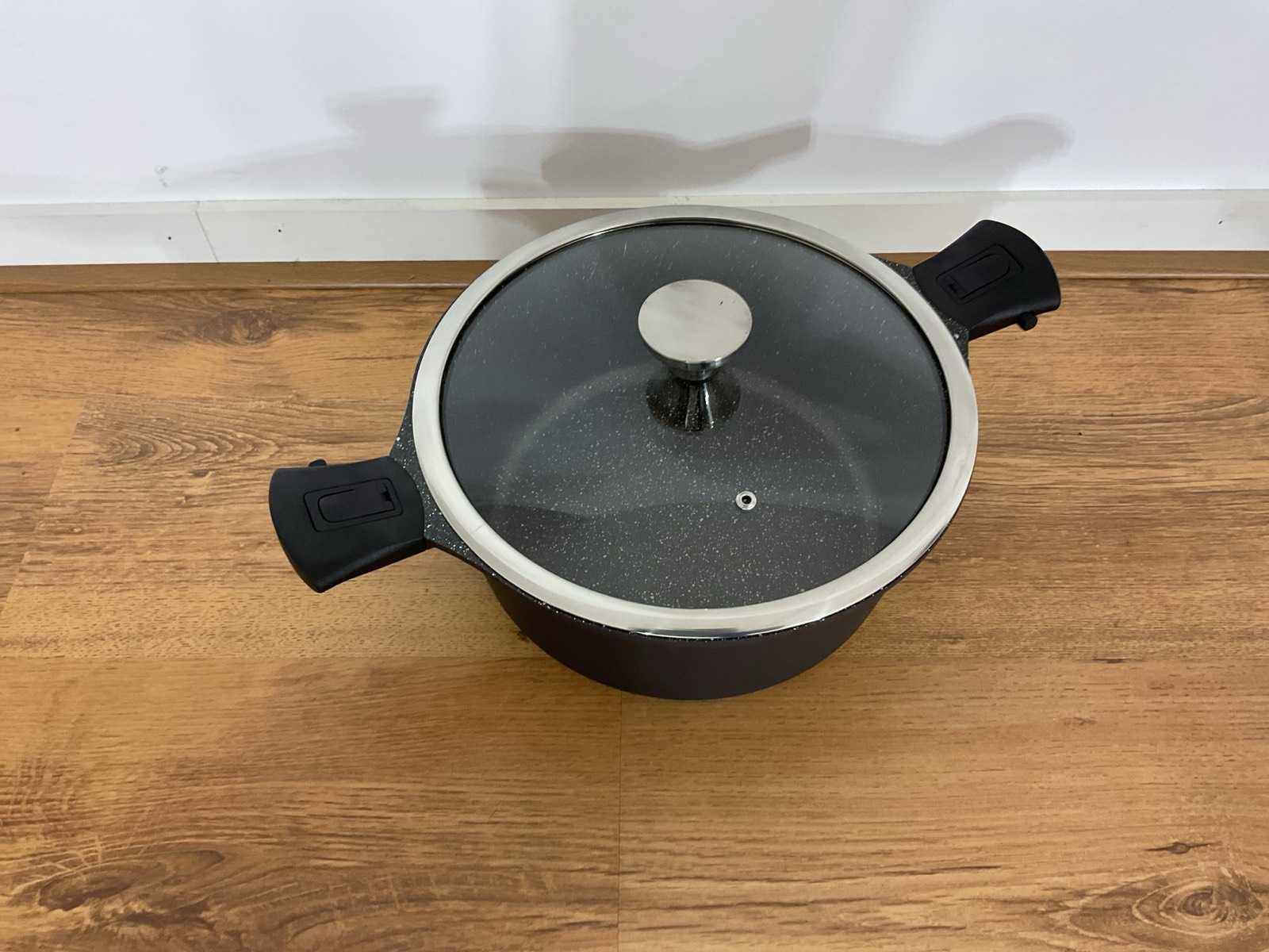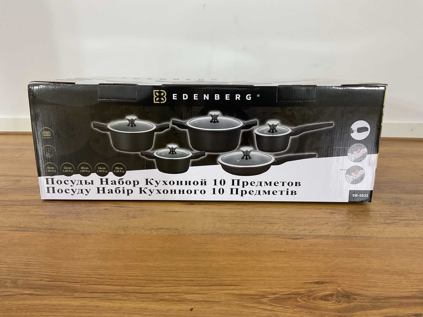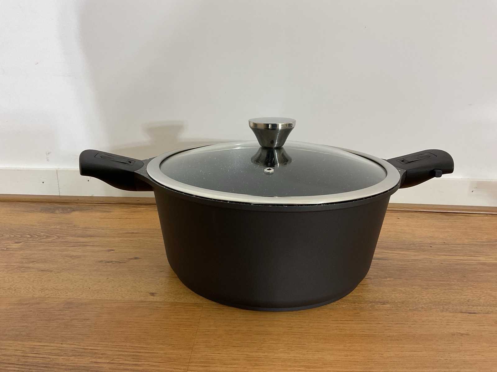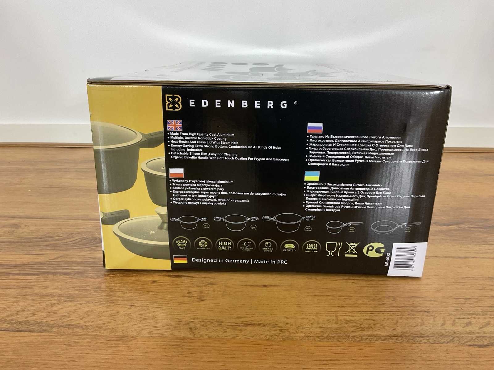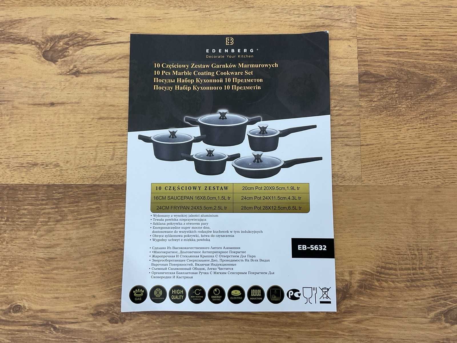 Merk: Edenberg Type: EB-5632 Serie: Premium Line Aantal delen: 10-delig Toepassing: Dagelijks koken / professioneel gebruik Materiaal: Gesmeed aluminium Coating: 3-laags marmer / keramische antiaanbaklaag Bodem: Inductie sandwichbodem (optimale warmteverdeling) Handgrepen: Ergonomisch, hittebestendig Deksel: Gehard glas met RVS rand Antiaanbaklaag: Ja (slijtvast en duurzaam) Vetarm koken mogelijk: Ja Geschikt voor alle warmtebronnen: Ja (gas, elektrisch, keramisch, inductie) Kookpan Ø20 cm – ca. 2,0 liter Kookpan Ø24 cm – ca. 4,0 liter Kookpan Ø28 cm – ca. 6,5 liter Steelpan Ø16 cm – ca. 1,5 liter Hapjespan / braadpan Ø24 cm – ca. 2,5 liter Inclusief bijpassende glazen deksels Vaatwasserbestendig: Ja Krasbestendig: Ja nieuw in verpakking Merk: Edenberg Model: EB-5632