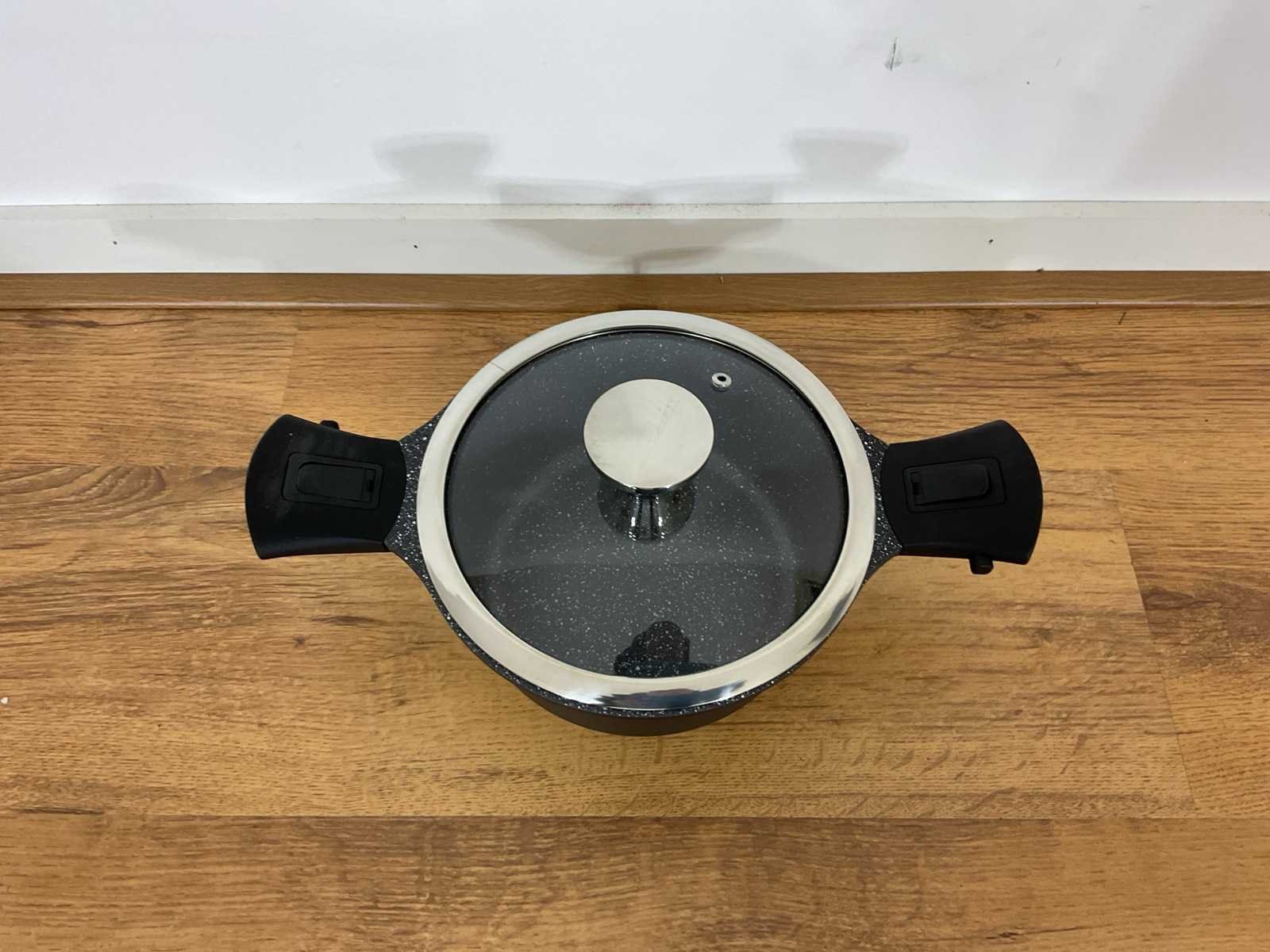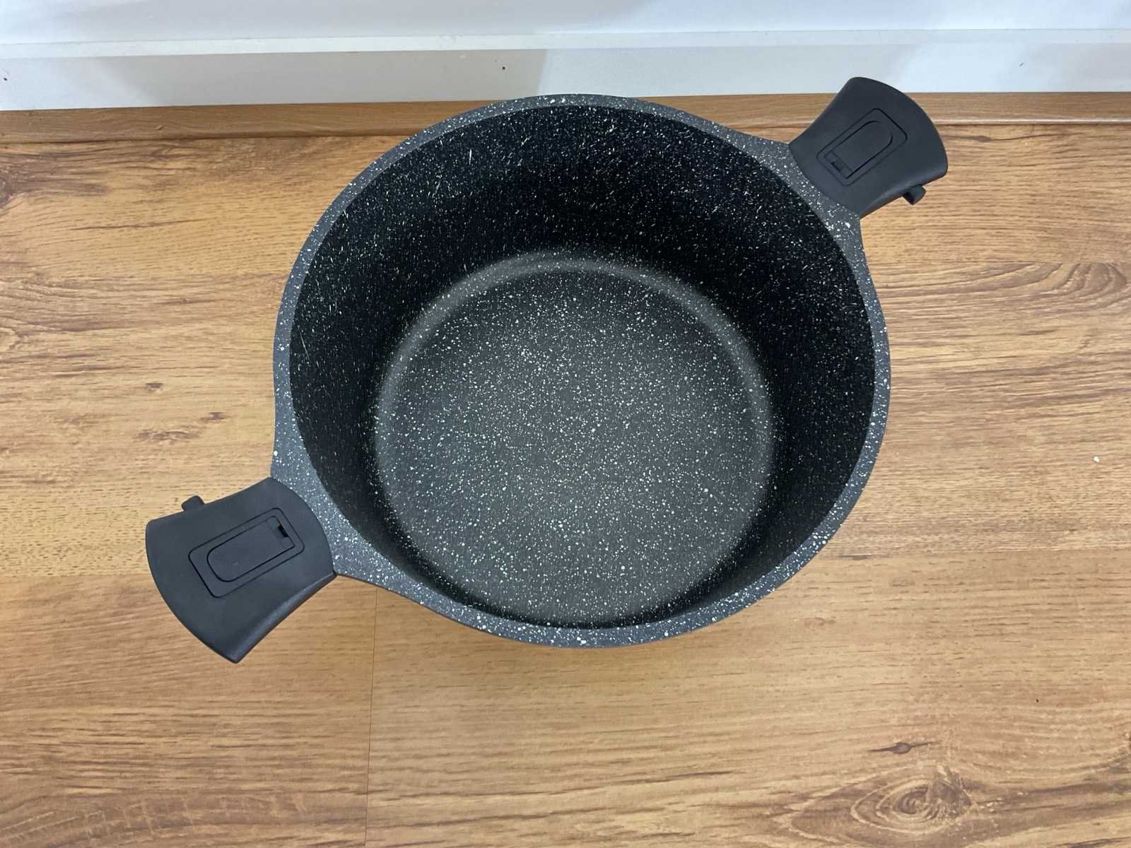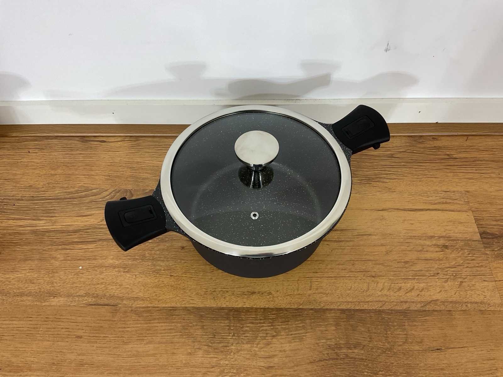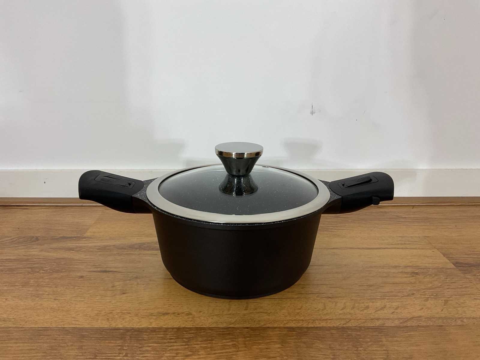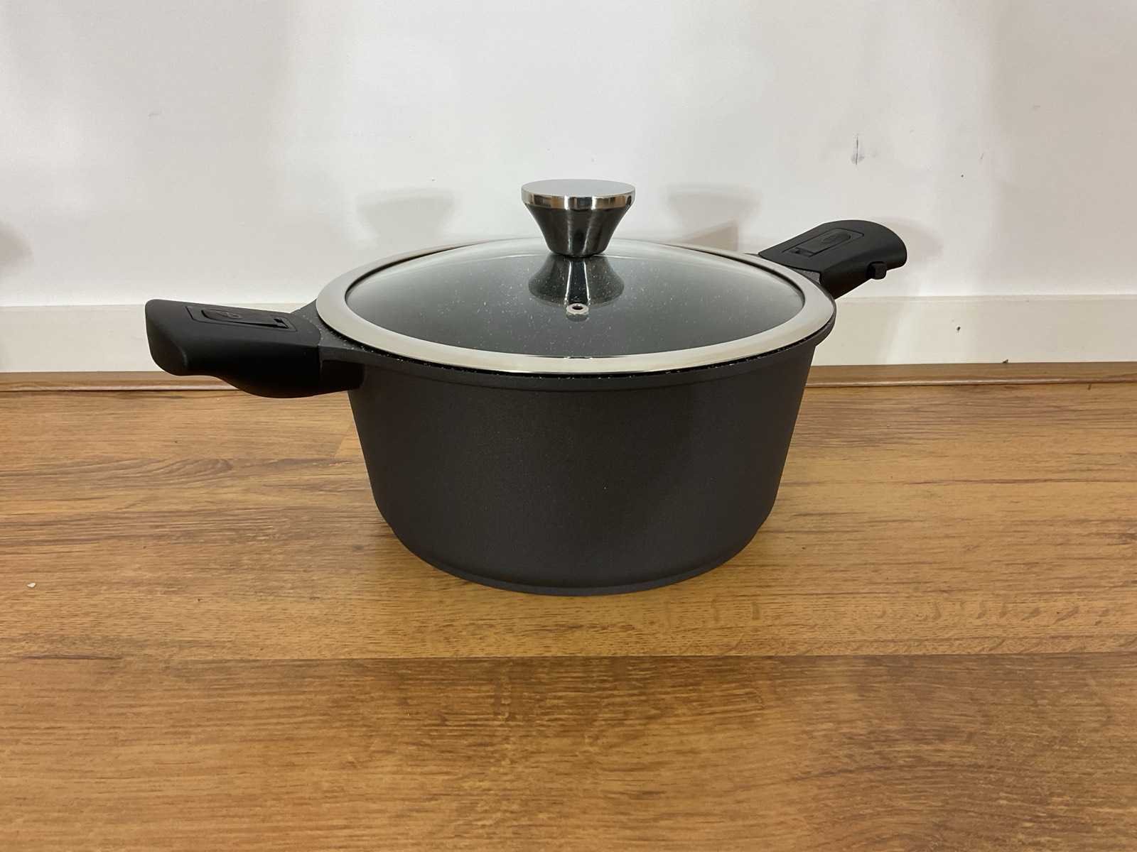 Merk: Edenberg Type: EB-5632 Serie: Premium Line Aantal delen: 10-delig Toepassing: Dagelijks koken / professioneel gebruik Materiaal: Gesmeed aluminium Coating: 3-laags marmer / keramische antiaanbaklaag Bodem: Inductie sandwichbodem (optimale warmteverdeling) Handgrepen: Ergonomisch, hittebestendig Deksel: Gehard glas met RVS rand Antiaanbaklaag: Ja (slijtvast en duurzaam) Vetarm koken mogelijk: Ja Geschikt voor alle warmtebronnen: Ja (gas, elektrisch, keramisch, inductie) Kookpan Ø20 cm – ca. 2,0 liter Kookpan Ø24 cm – ca. 4,0 liter Kookpan Ø28 cm – ca. 6,5 liter Steelpan Ø16 cm – ca. 1,5 liter Hapjespan / braadpan Ø24 cm – ca. 2,5 liter Inclusief bijpassende glazen deksels Vaatwasserbestendig: Ja Krasbestendig: Ja nieuw in verpakking Merk: Edenberg Model: EB-5632
