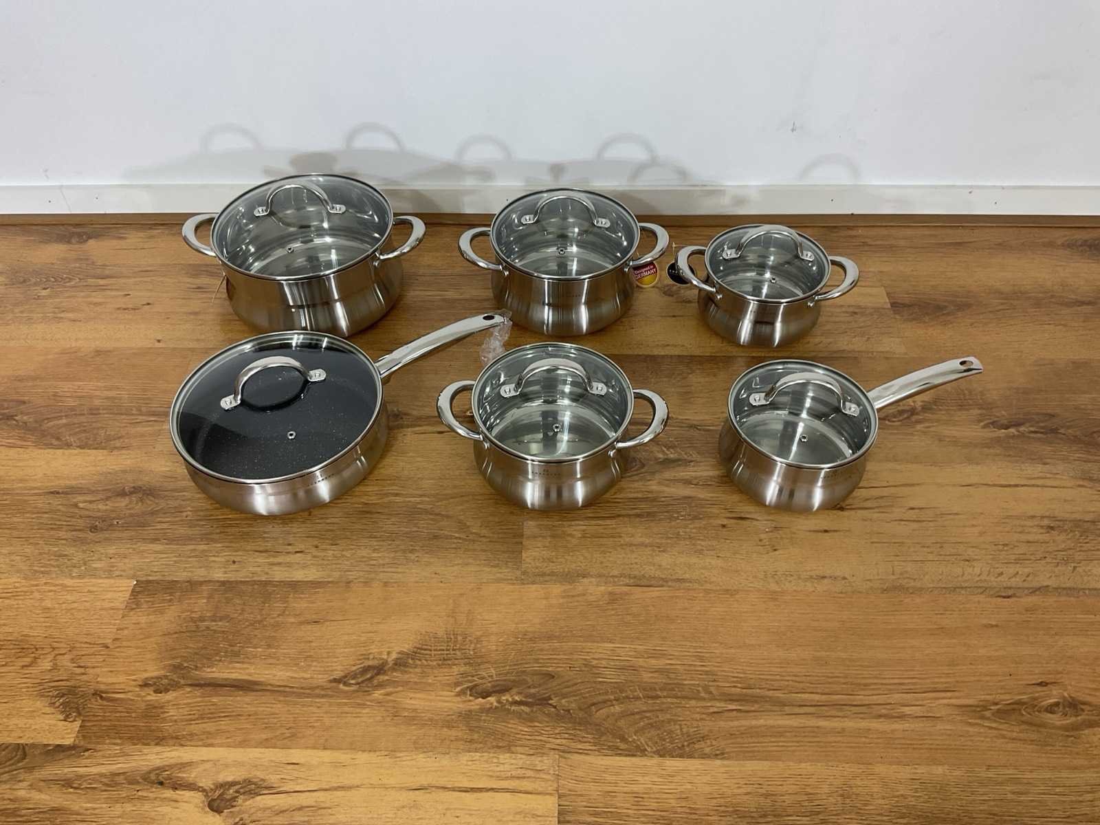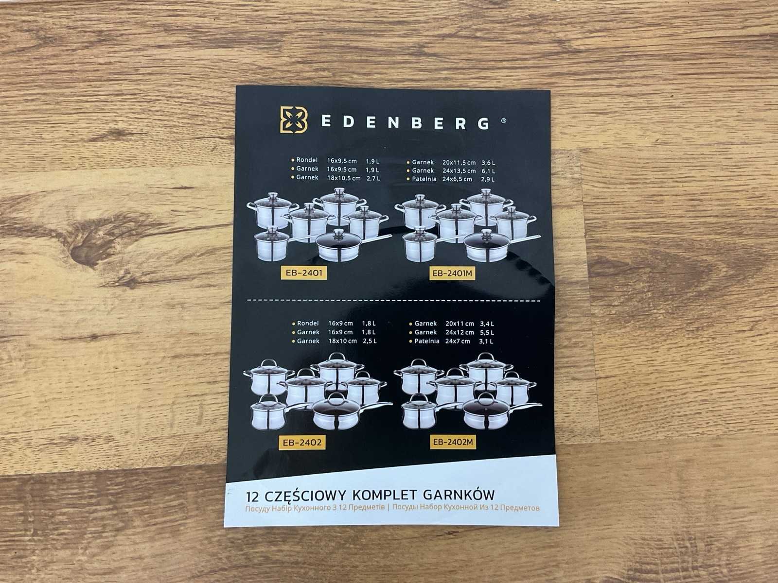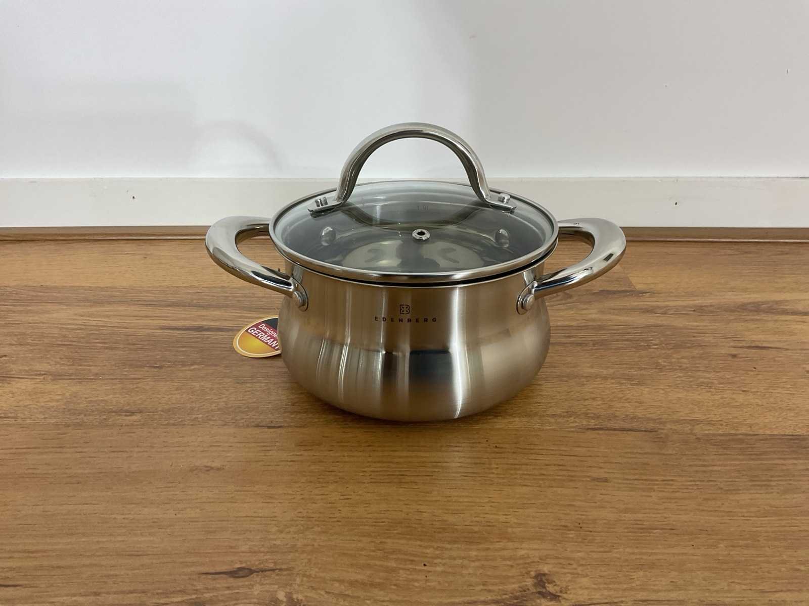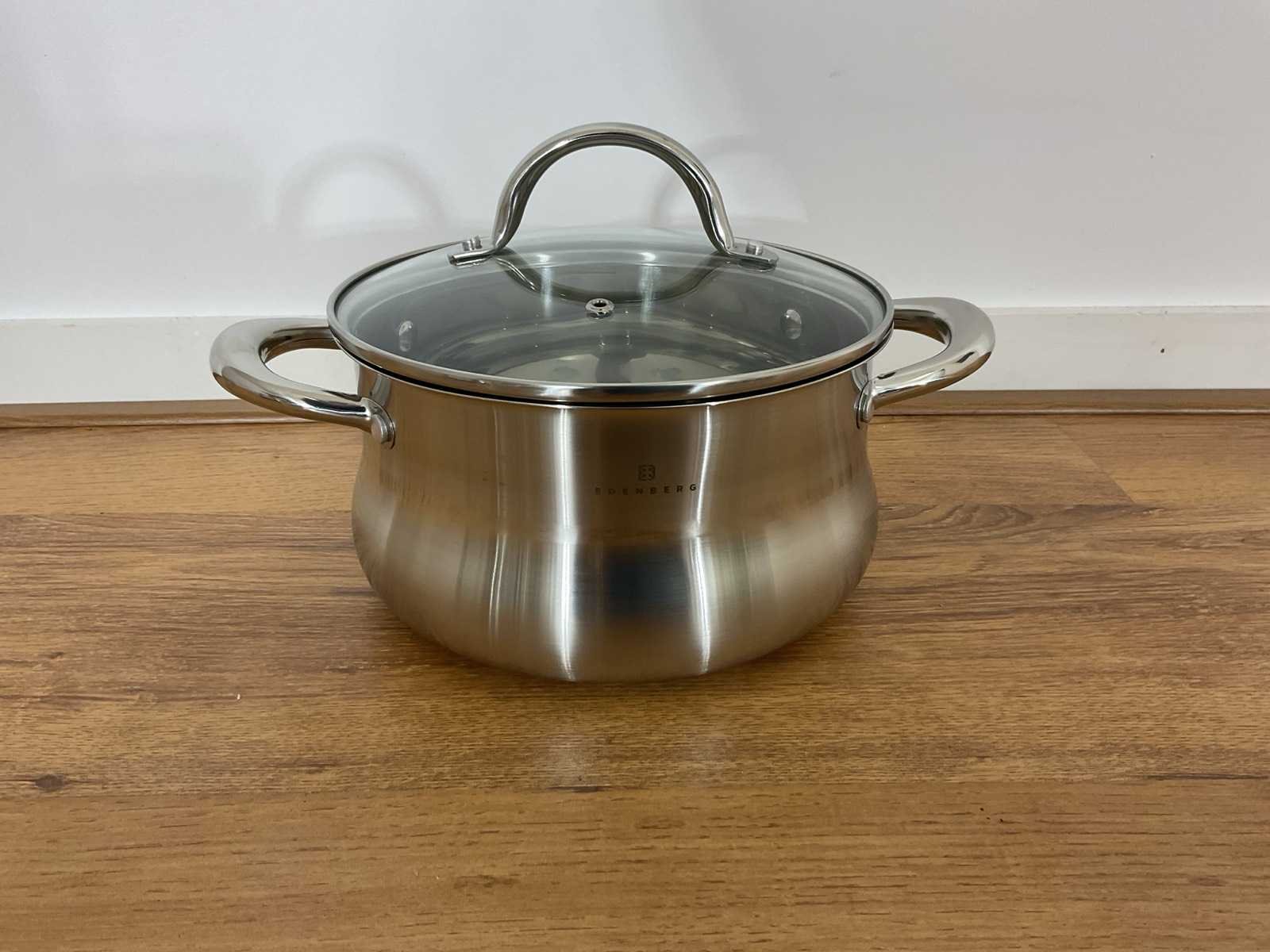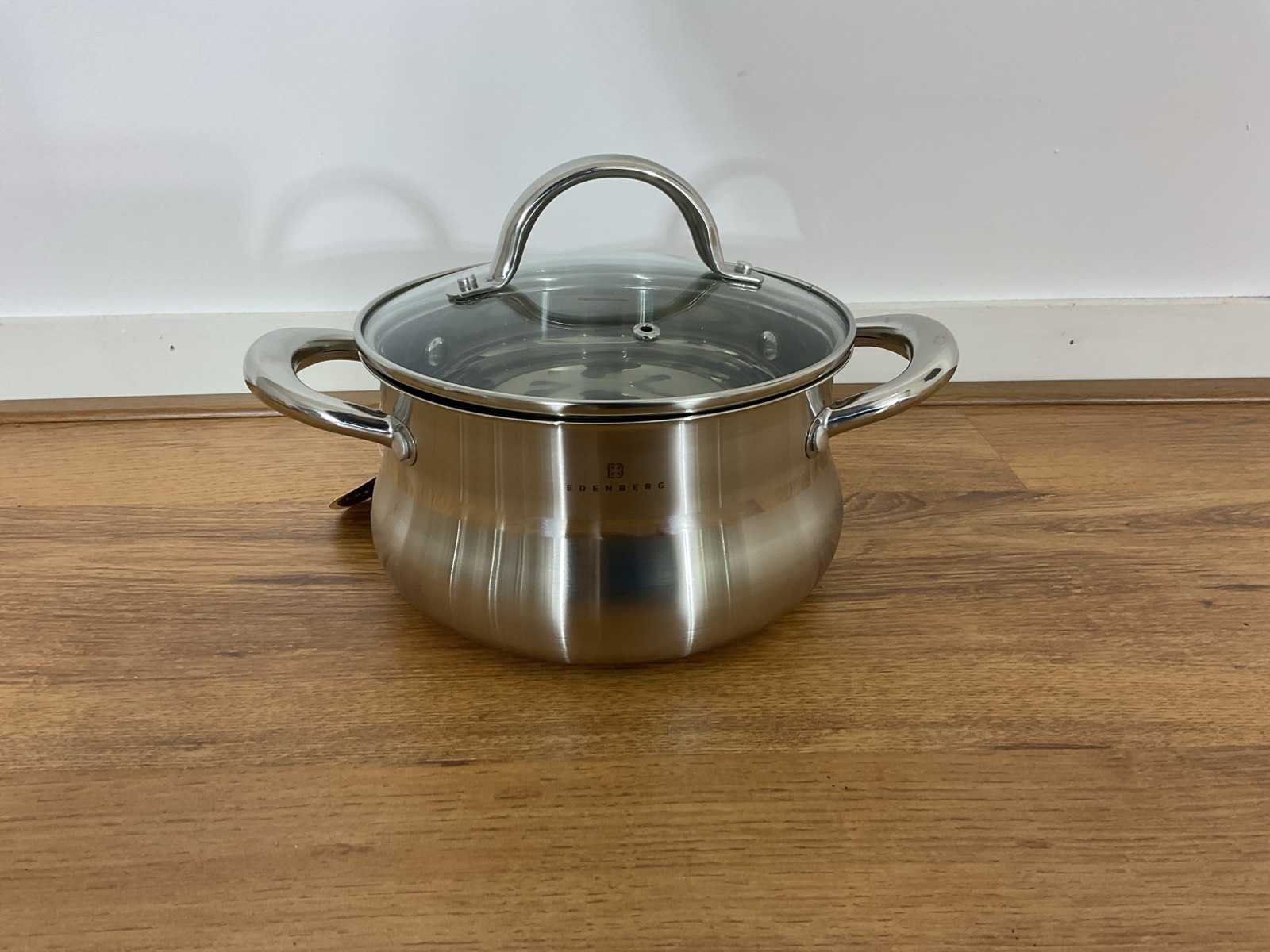 Merk: Edenberg Type: EB-2420M Serie: Classic Line Aantal delen: 12-delig Toepassing: Dagelijks koken / compleet keukenpakket Materiaal: Hoogwaardig roestvrij staal (RVS) Bodem: Sandwichbodem (snelle en gelijkmatige warmteverdeling) Handgrepen: RVS, hittebestendig Deksel: Gehard glas met stoomventiel Warmteverdeling: Snel en gelijkmatig Warmtebehoud: Hoog Geschikt voor alle warmtebronnen: Ja (gas, elektrisch, keramisch, inductie) Energiezuinig koken: Ja Steelpan Ø16 cm – ca. 1,8 liter Kookpan Ø16 cm – ca. 1,8 liter Kookpan Ø18 cm – ca. 2,5 liter Kookpan Ø20 cm – ca. 3,4 liter Kookpan Ø24 cm – ca. 5,5 liter Hapjespan Ø24 cm – ca. 3,1 liter Inclusief glazen deksels Interne maatverdeling: Ja Druipvrije rand: Ja Vaatwasserbestendig: Ja Onderhoud: Eenvoudig te reinigen nieuw in doos Merk: Edenberg Model: EB-2420M