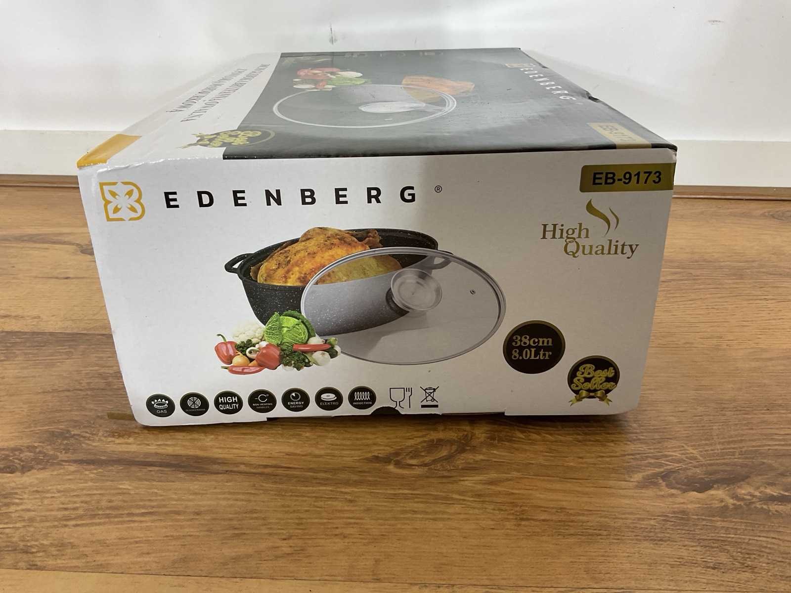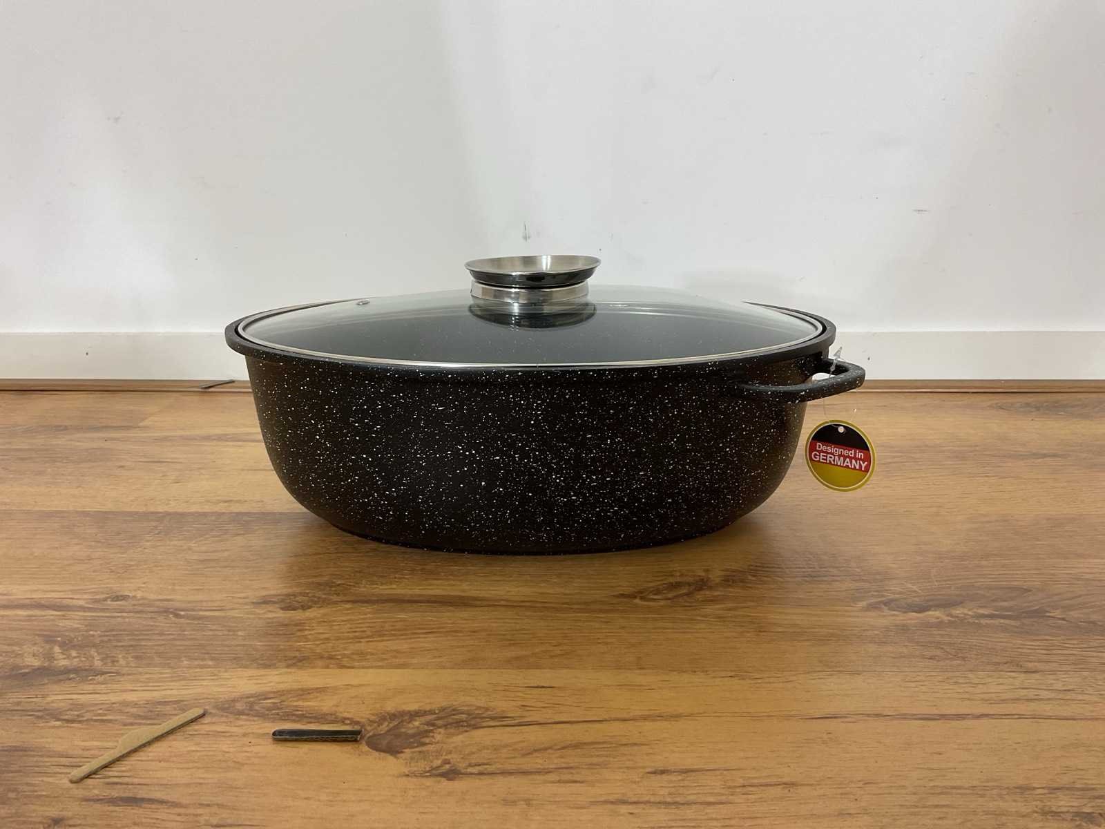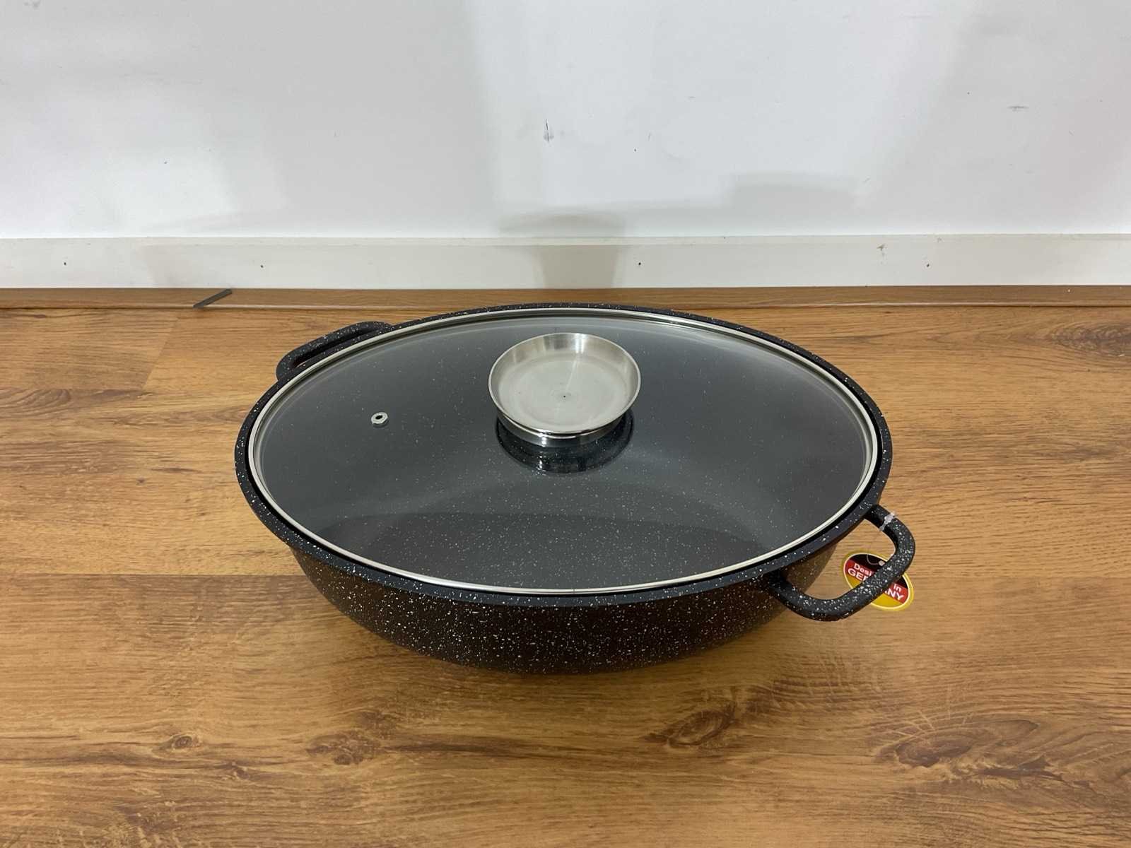 Geschikt voor alle warmtebronnen Inclusief deksel: Ja Kleur: Zwart Materiaal: Gietaluminium Vorm: Ovaal Materiaal deksel: Glas Diameter: 38 cm Product hoogte: 13 cm Volume in liters: 8.0 Type anti-aanbaklaag: Keramisch Type handgreep: Ergonomisch Type pan bodem: Antiaanbaklaag Diameter pan onderzijde: 34 cm Vaatwasserbestendig: Ja PFAS-vrij: ja Nieuw in doos Merk: Edenberg Model: EB-9173