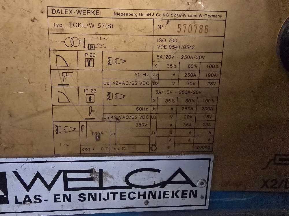 Merk: Dalex Type: TGKL W 57 Inschakelduur: 60% Max. lasvermogen: 250A Aansluiting: 400V