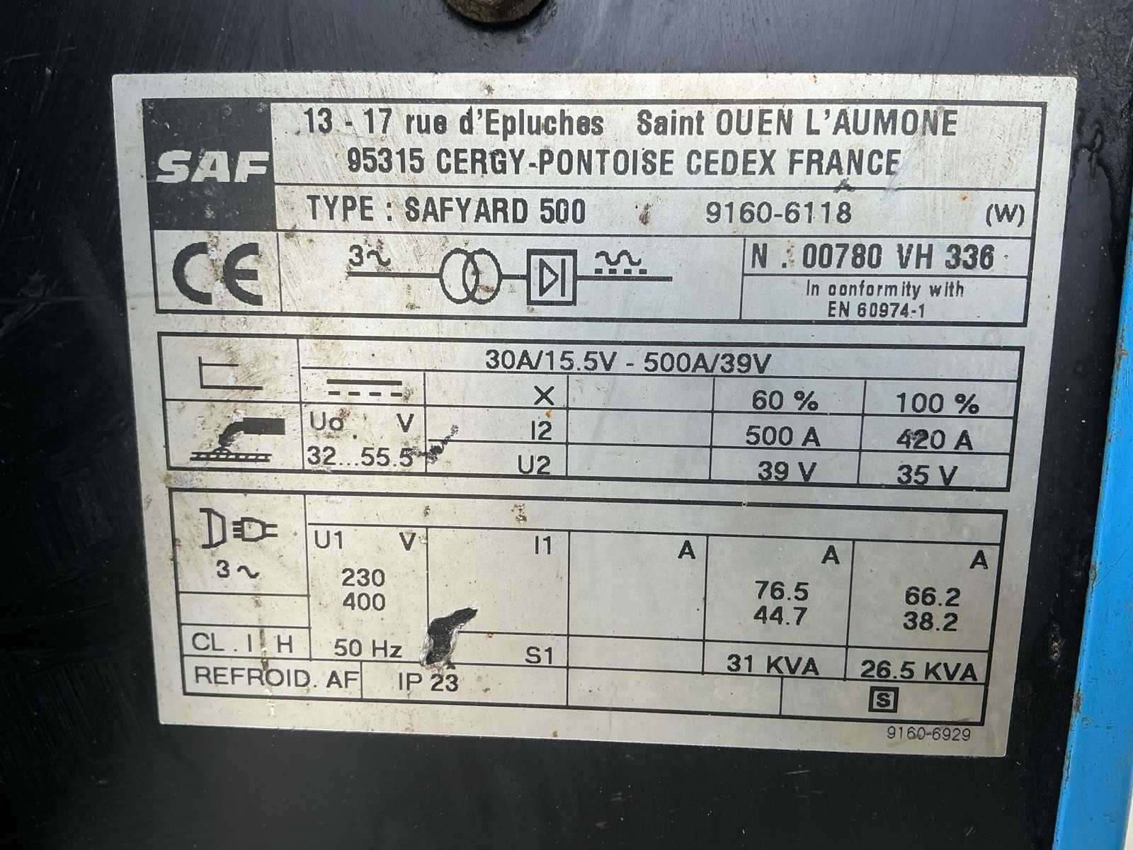 Merk: SAF Type: Safyard 500 Mig type: true Ampère belasting: 500A Draadaanvoerunit: true Digitale uitlezing: true Aansluiting: 400V