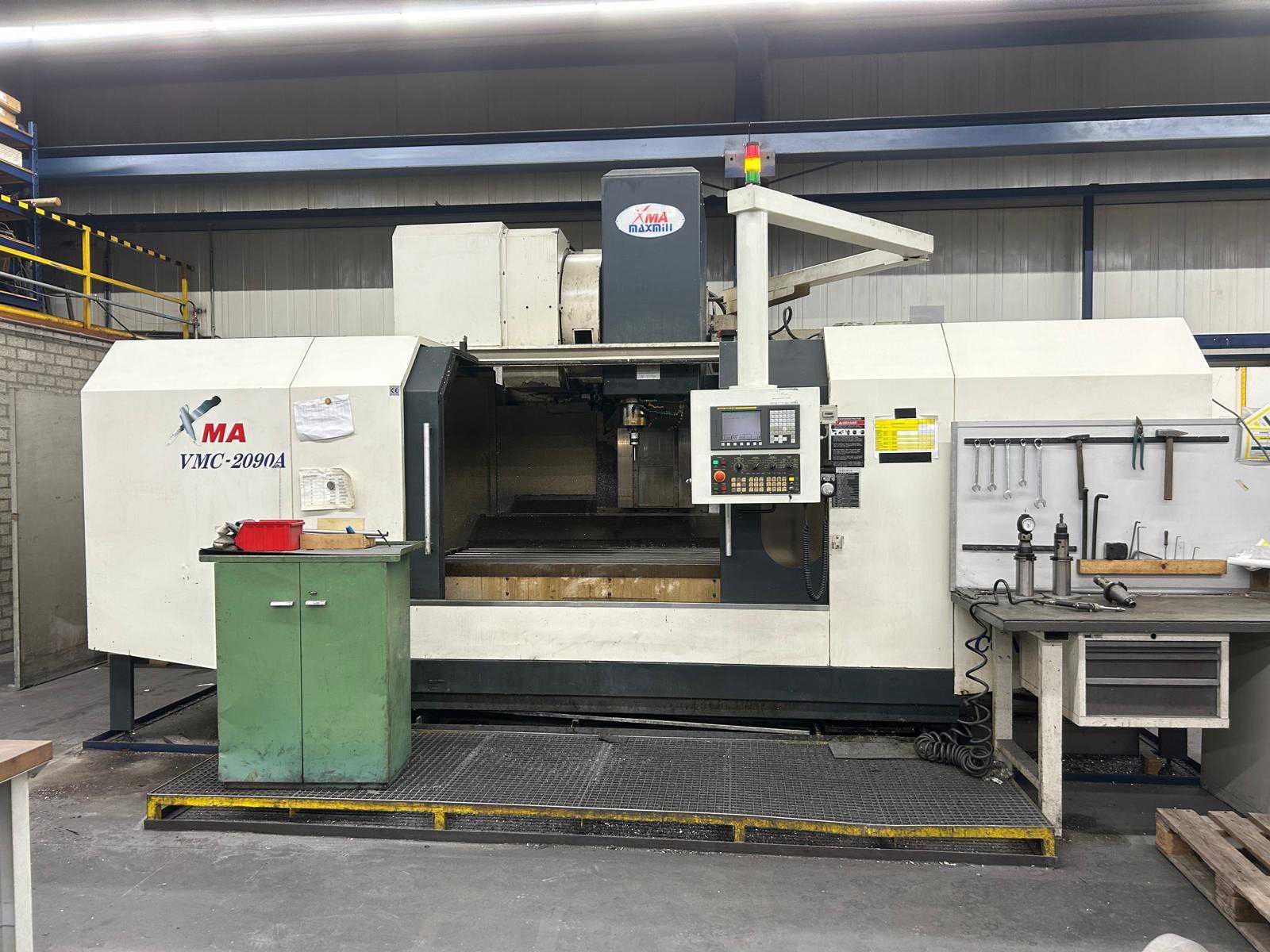 4E AS!! De machine is uitgerust met: - 4e as - doorspoelkoelmiddel - oliekoeler - chiptransporteur - Renishaw-sondesysteem Merk: MaxMill Type: VMC-2090A Bouwjaar: 2007 Serienummer: V20-028 Verplaatsing x-as: 2000mm Verplaatsing y-as: 900mm Verplaatsing z-as: 700mm Snelheid tot n =: 10000rpm Afgelezen urenstand: 5150 CNC-besturing, merk, type: Fanuc Series 0i-MC Spanentransporteur: true Koelmiddelpomp: true Werkstuk gewicht max.: 2800kg T-gleuf opspantafelafmeting B: 970mm T-gleuf opspantafelafmeting L: 2300mm -assig: 4 Motorvermogen (kW): 18.5kW Handboek aanwezig: true Aansluiting: 400V Totale afmeting Hoogte: 3310mm Totale afmeting Breedte: 3580mm Totale afmeting L: 5630mm Machinegewicht: 20000kg