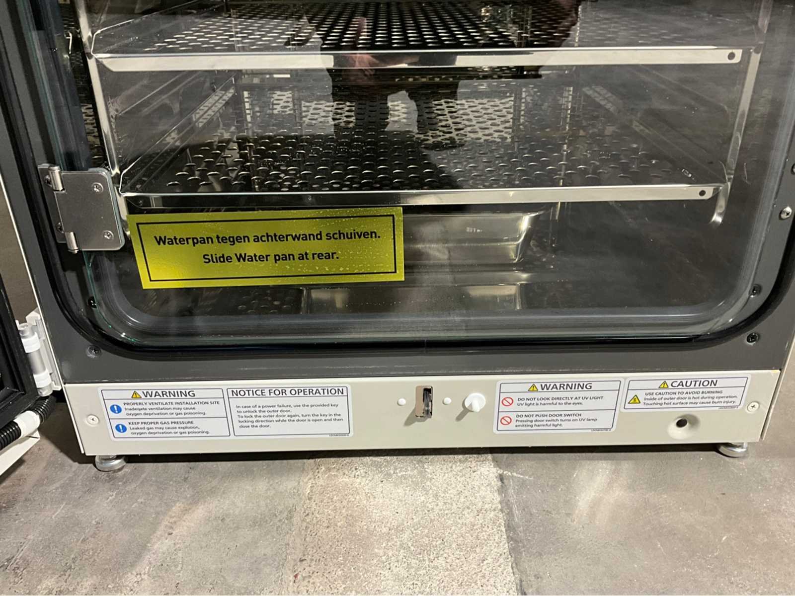 Kamervolume: 165 L (5,8 cu. ft.) Interne afmetingen: 500 mm B x 400 mm D x 830 mm H (19,7 inch x 15,7 in x 32,7 in) Externe afmetingen: 540 mm B x 625 mm D x 910 mm H (21,3 inch x 24,6 in x 35,8 in) Laadcapaciteit van de plank: 15 kg/plank (33 lbs/plank) Aantal planken: 4 (standaard; maximaal 10) CO2-controlebereik: 0 tot 20% (IR-sensor, ±0,15% nauwkeurigheid) CO2-sensor: Infrarood (IR) Temperatuurcontrolebereik: Omgevingsbereik +5°C tot 50°C (41°F tot 122°F) (±0,1°C gelijkmatigheid bij 37°C) Temperatuuruniformiteit: ±0,1°C bij 37°C Vochtigheidscontrole: 95% RH (natuurlijke verdamping) Vochtigheidsuniformiteit: ±3% RH bij 37°C Decontaminatie: UV-lamp (254 nm golflengte) voor automatische cyclus; optionele H2O2-damp (UVHL-variant) UV-cyclustijd: 48 minuten (volledige ontsmetting) UV-lamp: 15 W, UVC (254 nm) Deurtype: Dubbele deur (binnenglas, buitenste gehard) met magnetische pakking Binnendeur: Gehard glas met verwarming Veiligheidsvoorzieningen: CO2-filter leeg alarm, overtemperatuuralarm, deur op een kier, UV-lamp storing alarm Alarmen: Hoorbaar en visueel (LED-display) Display: LCD met touchpaneel voor temperatuur, CO2, luchtvochtigheid en cyclusstatus Data logging: USB-poort voor data-export (temperatuur-/CO2-logs) Toepassing: Celkweek in biomedisch onderzoek, farmaceutische industrie en weefseltechnologie; ideaal voor gevoelige culturen die een besmettingsvrije omgeving vereisen Merk: PHCbi Type: Mco-170AICUVD-PE Bouwjaar: 2018 Rvs: true Staand model: true Max. temperatuur: 50°c Aansluiting: 230V Eigen gewicht: 80kg Totale afmeting L: 730mm Totale afmeting Breedte: 620mm Totale afmeting Hoogte: 905mm