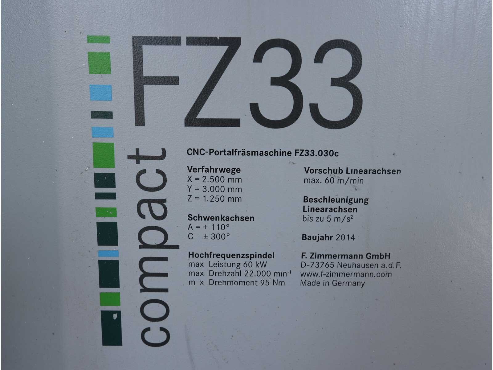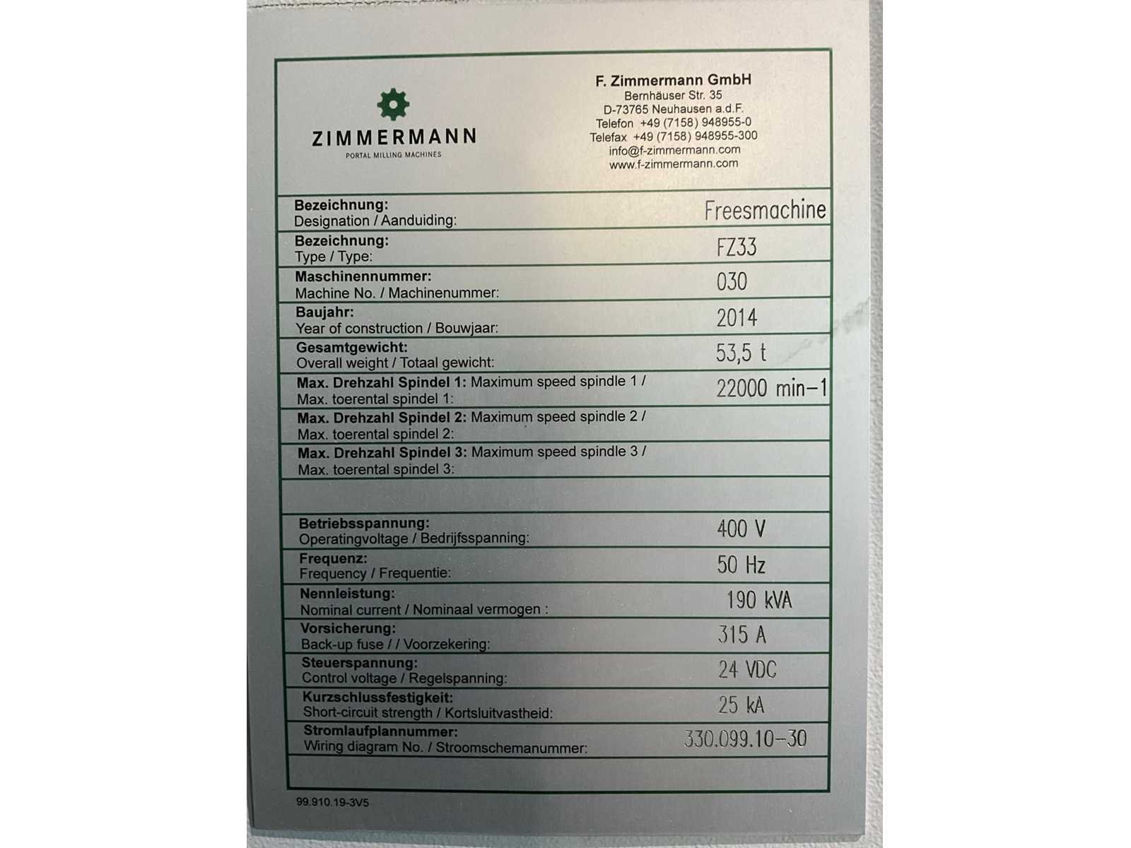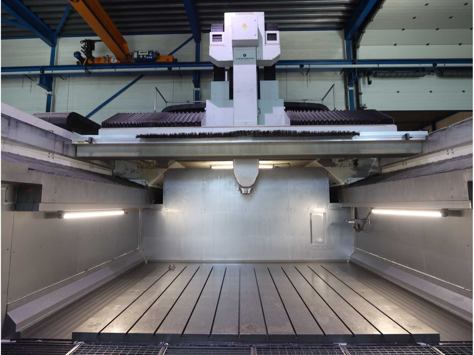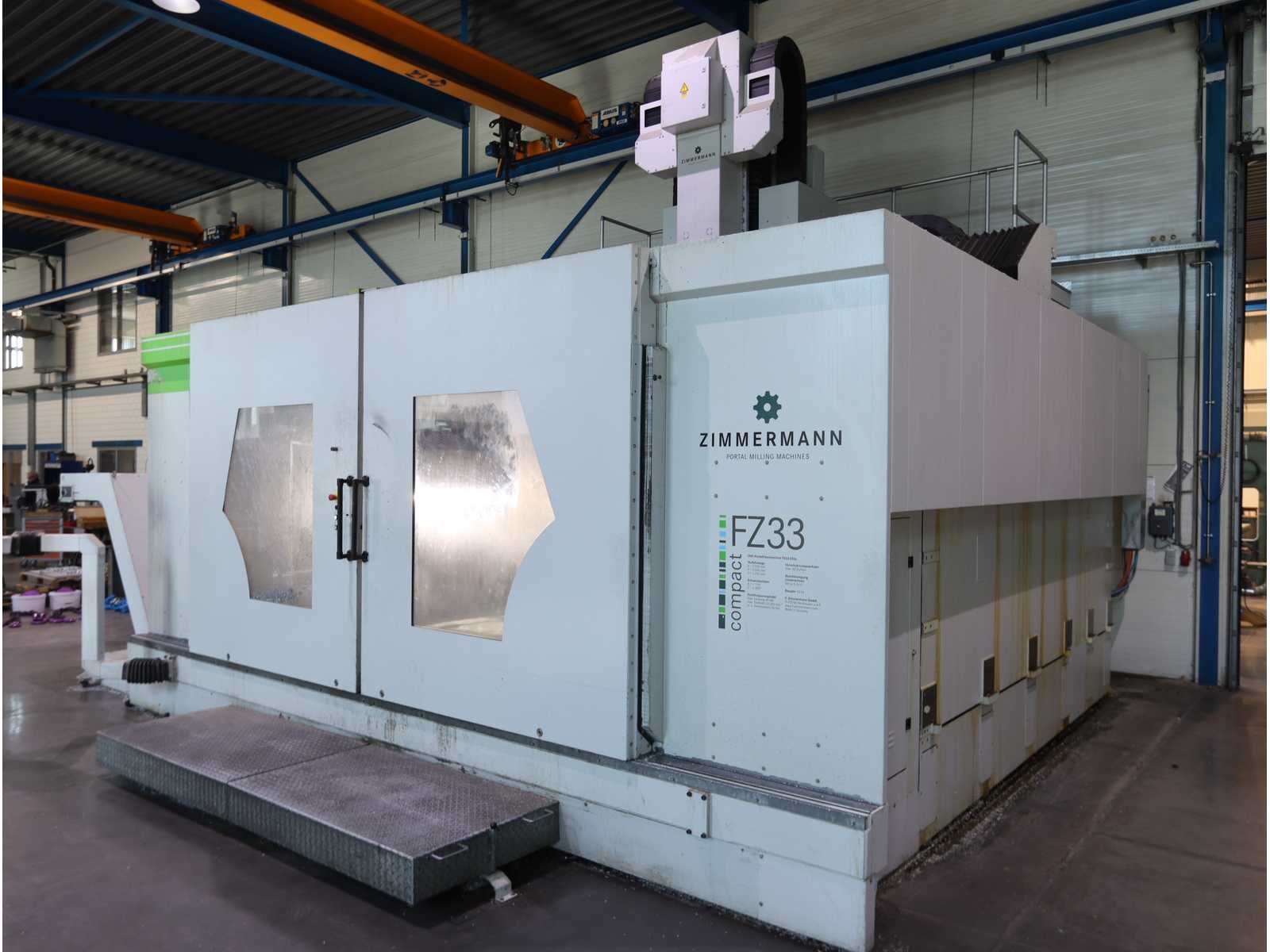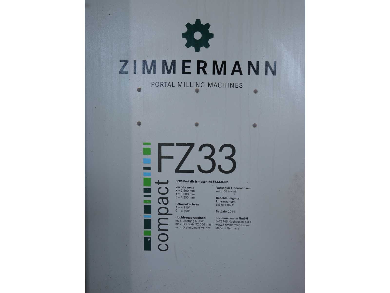 Afgelezen machine-urenstand ca. 80.276 uur, spindelurenstand ca. 23.414 uur. Voorzien van: 5-assige freeskop type VH30 met A- en C-as (A-as ±110°, C-as 360°), geschikt voor simultaan 5-assig frezen. Uitgerust met hogefrequentiespindel met opname HSK 63A, max. toerental 22.000 min⁻¹, vermogen 60 kW (constant vanaf ca. 6000 min⁻¹) en max. koppel ca. 95 Nm. Automatische gereedschapswisselaar KTC Handlingstechnik, type: ATC 60/HSK-A63 (60 posities) met carrouselmagazijn. Inclusief spaanafvoer en randapparatuur bestaande uit: (1x) KÜMA koelmiddel-/filtersysteem type KF1/515WB, (1x) KÜMA filterunit type BF Gr.3, (1x) KÜMA pompunit type FA10/03, (1x) H.I.B Systemtechnik industriële chiller type RKH/W-14300 (R134a), (1x) LTA Industrial Air Cleaning olienevelafzuiging type AC 2000 H Solid. Geschikt voor hogesnelheidsbewerking van onder andere aluminium en composiet. Merk: Zimmerman Type: FZ33.030c Bouwjaar: 2014 Serienummer: 030 Verplaatsing x-as: 2500mm Verplaatsing y-as: 3000mm Verplaatsing z-as: 1250mm Opname: HSK 63A Snelheid tot n =: 22000rpm T-gleuf opspantafelafmeting L: 3250mm T-gleuf opspantafelafmeting B: 2500mm Werkstuk gewicht max.: 8000kg Besturing, merk, type: Heidenhain iTNC530 HSCI Afgelezen urenstand: 80266 Motorvermogen (kW): 60kW Aansluiting: 400V Machinegewicht: 54000kg Afmeting l: 8900mm Afmeting b: 11500mm Afmeting h: 5630mm
