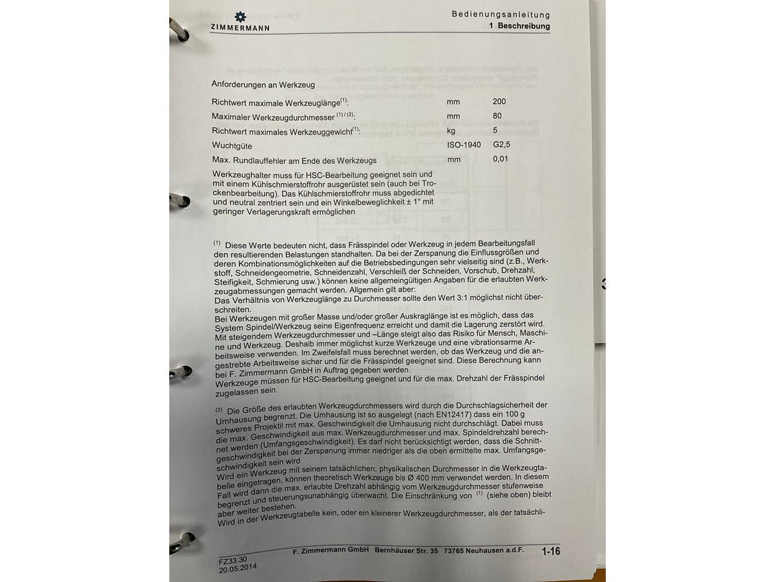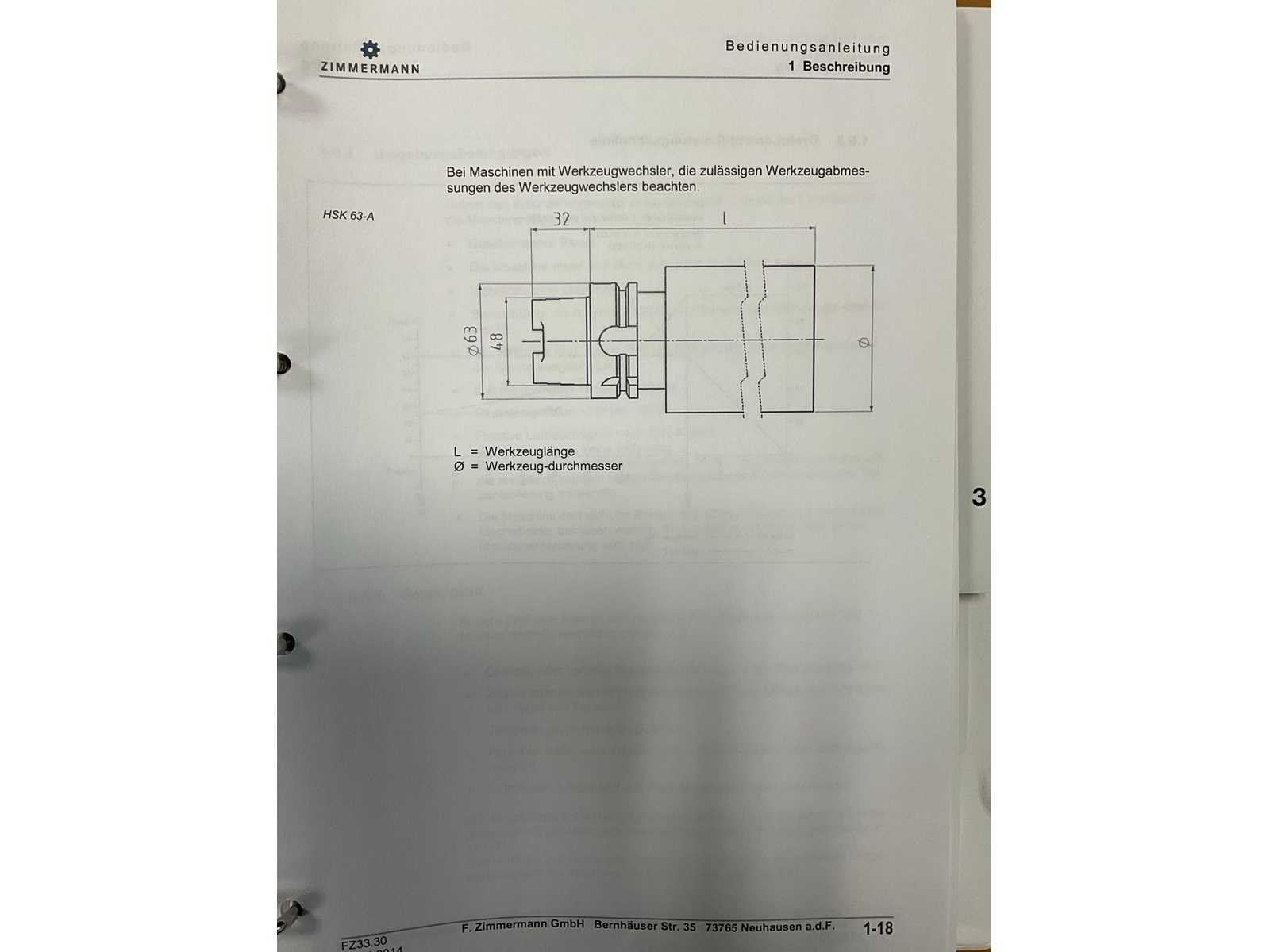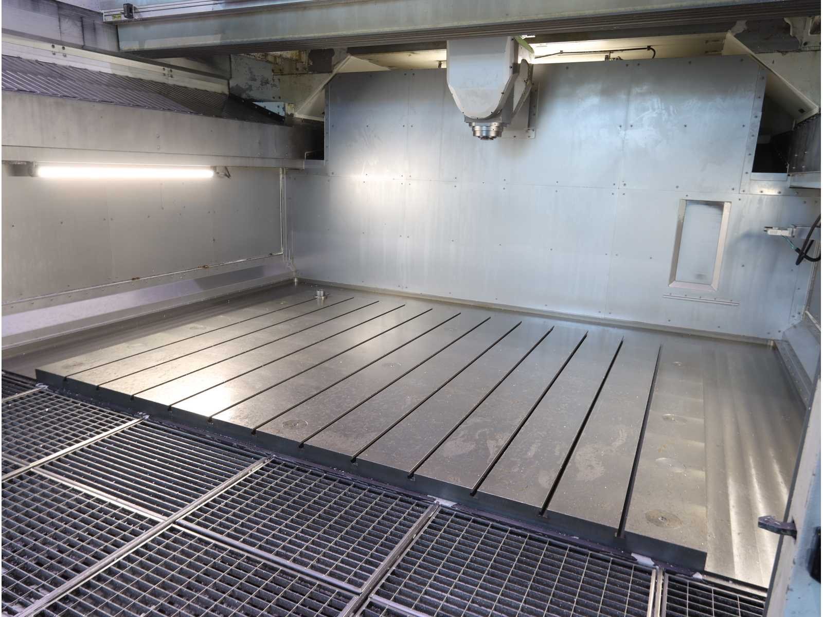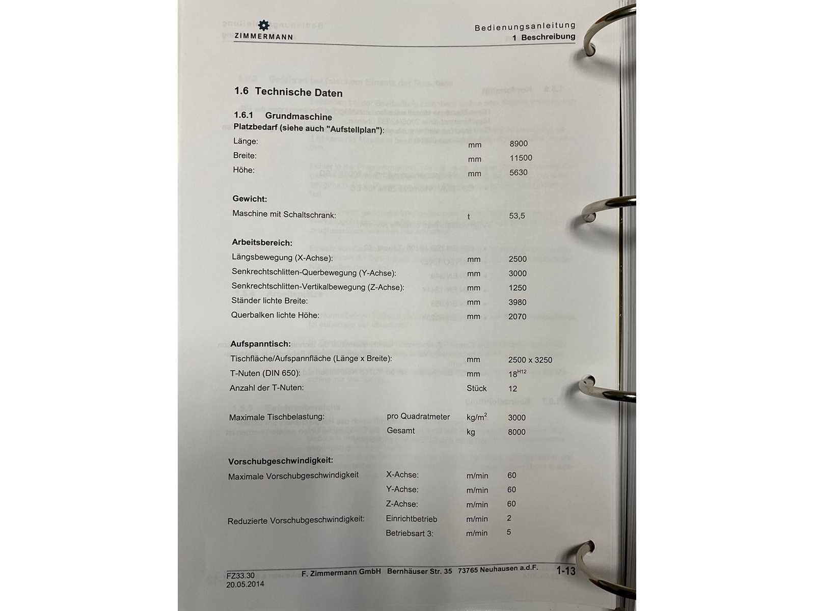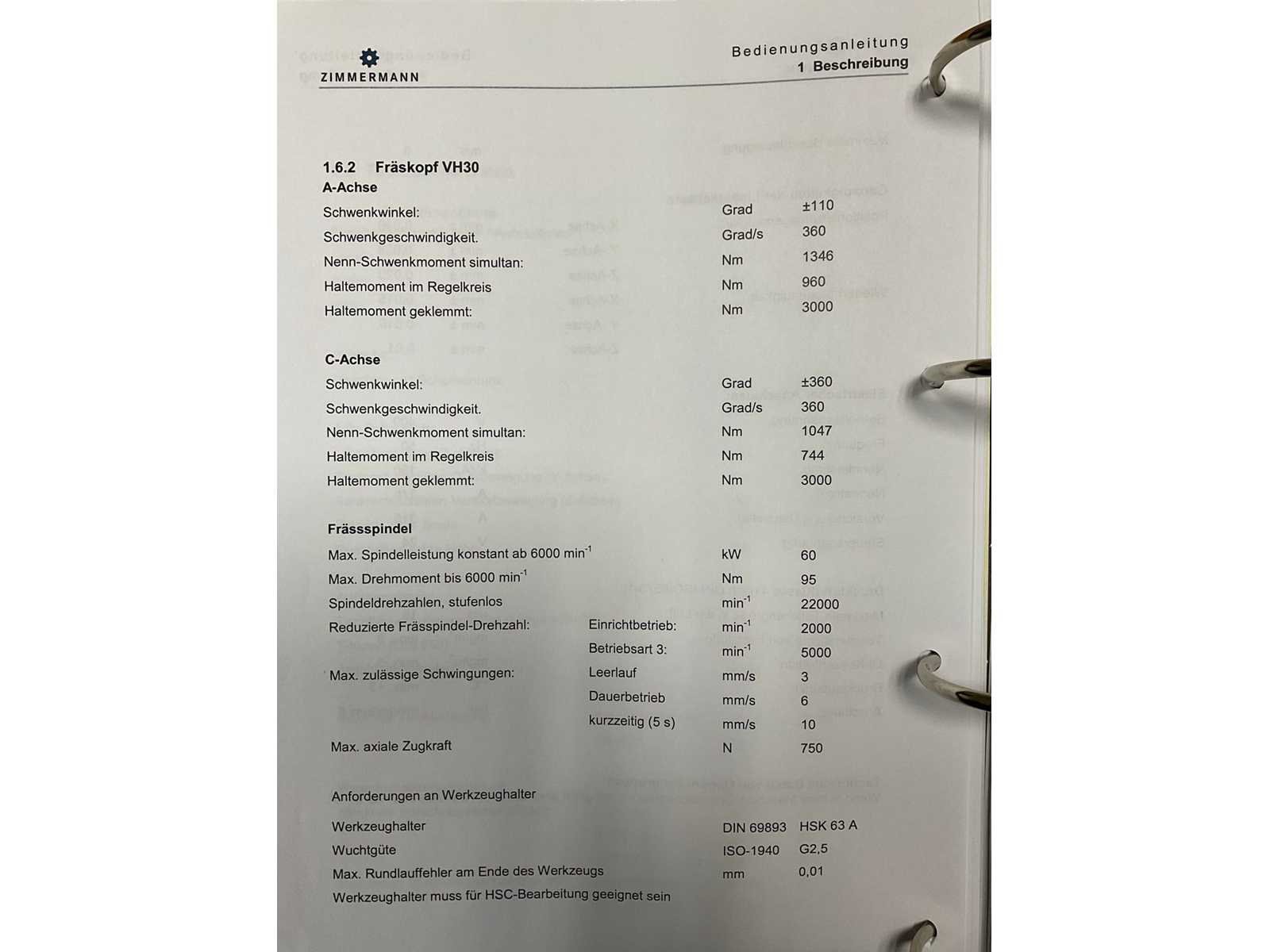 Afgelezen machine-urenstand ca. 80.276 uur, spindelurenstand ca. 23.414 uur. Voorzien van: 5-assige freeskop type VH30 met A- en C-as (A-as ±110°, C-as 360°), geschikt voor simultaan 5-assig frezen. Uitgerust met hogefrequentiespindel met opname HSK 63A, max. toerental 22.000 min⁻¹, vermogen 60 kW (constant vanaf ca. 6000 min⁻¹) en max. koppel ca. 95 Nm. Automatische gereedschapswisselaar KTC Handlingstechnik, type: ATC 60/HSK-A63 (60 posities) met carrouselmagazijn. Inclusief spaanafvoer en randapparatuur bestaande uit: (1x) KÜMA koelmiddel-/filtersysteem type KF1/515WB, (1x) KÜMA filterunit type BF Gr.3, (1x) KÜMA pompunit type FA10/03, (1x) H.I.B Systemtechnik industriële chiller type RKH/W-14300 (R134a), (1x) LTA Industrial Air Cleaning olienevelafzuiging type AC 2000 H Solid. Geschikt voor hogesnelheidsbewerking van onder andere aluminium en composiet. Merk: Zimmerman Type: FZ33.030c Bouwjaar: 2014 Serienummer: 030 Verplaatsing x-as: 2500mm Verplaatsing y-as: 3000mm Verplaatsing z-as: 1250mm Opname: HSK 63A Snelheid tot n =: 22000rpm T-gleuf opspantafelafmeting L: 3250mm T-gleuf opspantafelafmeting B: 2500mm Werkstuk gewicht max.: 8000kg Besturing, merk, type: Heidenhain iTNC530 HSCI Afgelezen urenstand: 80266 Motorvermogen (kW): 60kW Aansluiting: 400V Machinegewicht: 54000kg Afmeting l: 8900mm Afmeting b: 11500mm Afmeting h: 5630mm