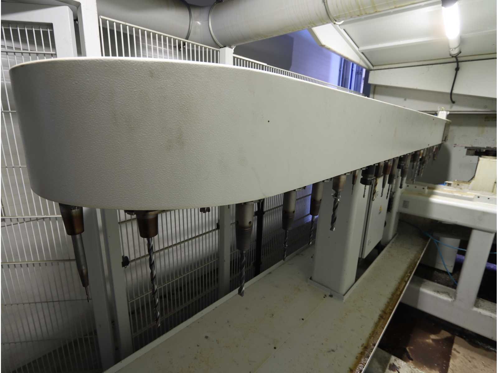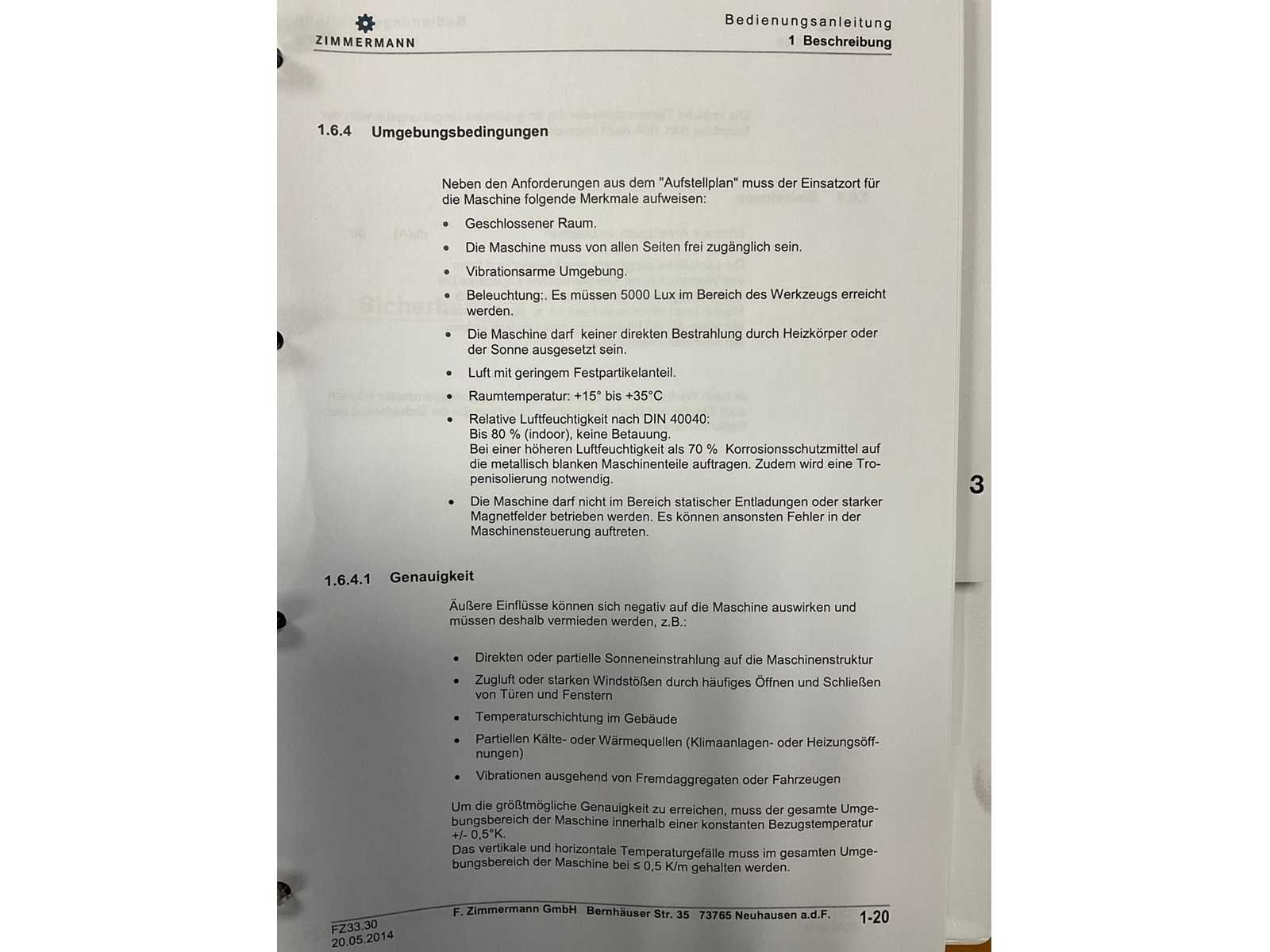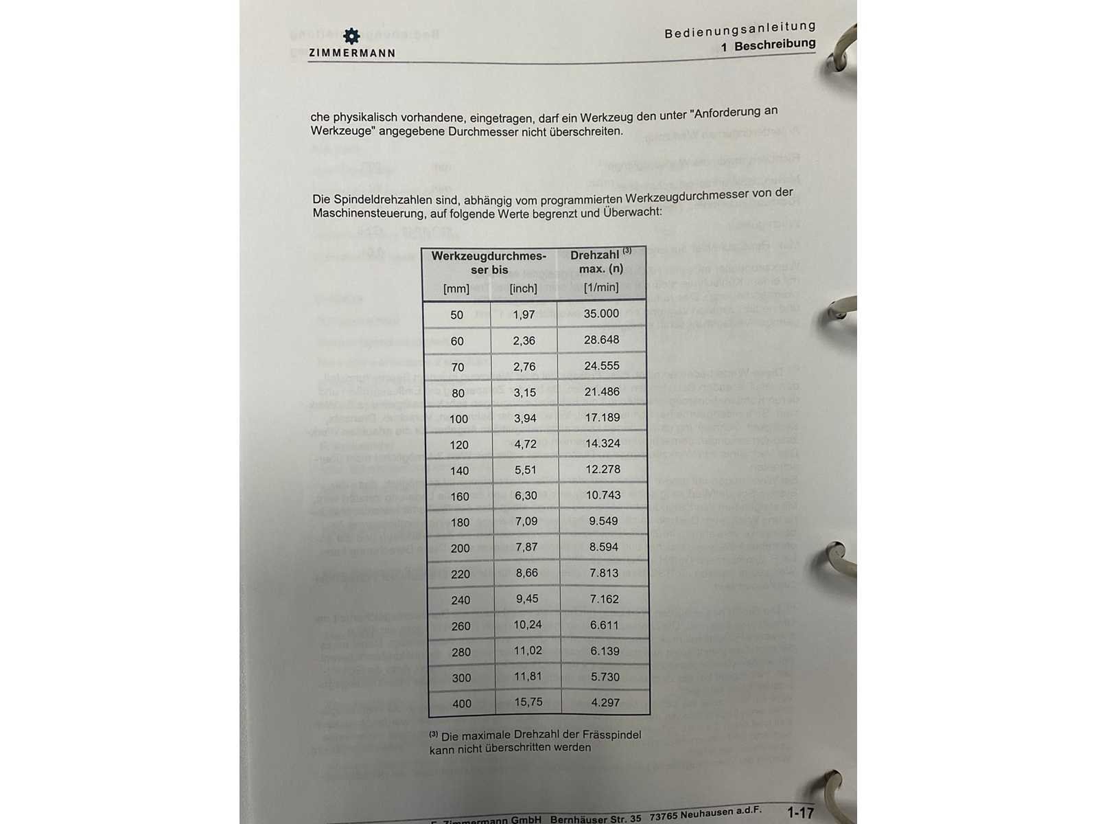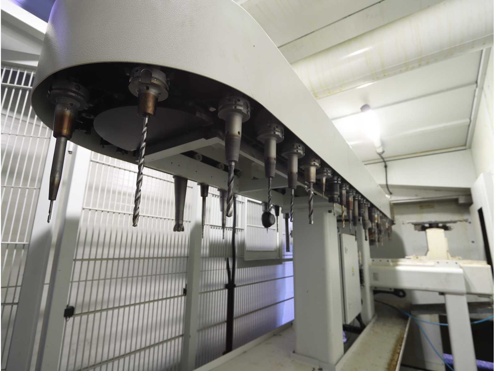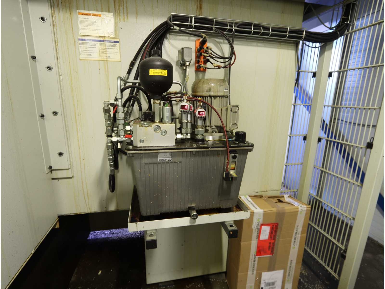 Afgelezen machine-urenstand ca. 80.276 uur, spindelurenstand ca. 23.414 uur. Voorzien van: 5-assige freeskop type VH30 met A- en C-as (A-as ±110°, C-as 360°), geschikt voor simultaan 5-assig frezen. Uitgerust met hogefrequentiespindel met opname HSK 63A, max. toerental 22.000 min⁻¹, vermogen 60 kW (constant vanaf ca. 6000 min⁻¹) en max. koppel ca. 95 Nm. Automatische gereedschapswisselaar KTC Handlingstechnik, type: ATC 60/HSK-A63 (60 posities) met carrouselmagazijn. Inclusief spaanafvoer en randapparatuur bestaande uit: (1x) KÜMA koelmiddel-/filtersysteem type KF1/515WB, (1x) KÜMA filterunit type BF Gr.3, (1x) KÜMA pompunit type FA10/03, (1x) H.I.B Systemtechnik industriële chiller type RKH/W-14300 (R134a), (1x) LTA Industrial Air Cleaning olienevelafzuiging type AC 2000 H Solid. Geschikt voor hogesnelheidsbewerking van onder andere aluminium en composiet. Merk: Zimmerman Type: FZ33.030c Bouwjaar: 2014 Serienummer: 030 Verplaatsing x-as: 2500mm Verplaatsing y-as: 3000mm Verplaatsing z-as: 1250mm Opname: HSK 63A Snelheid tot n =: 22000rpm T-gleuf opspantafelafmeting L: 3250mm T-gleuf opspantafelafmeting B: 2500mm Werkstuk gewicht max.: 8000kg Besturing, merk, type: Heidenhain iTNC530 HSCI Afgelezen urenstand: 80266 Motorvermogen (kW): 60kW Aansluiting: 400V Machinegewicht: 54000kg Afmeting l: 8900mm Afmeting b: 11500mm Afmeting h: 5630mm