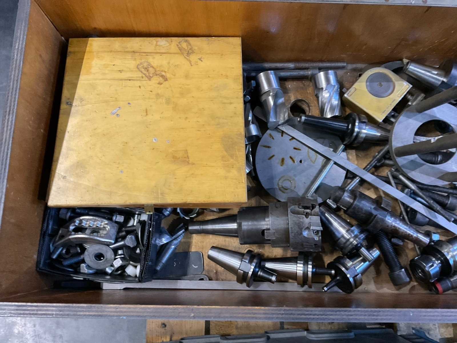 Houten kist met diverse machinegereedschappen en toebehoren, waaronder frezen, tandwielen, opspanmiddelen en diverse losse onderdelen.