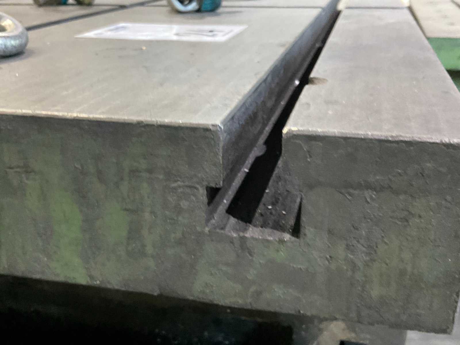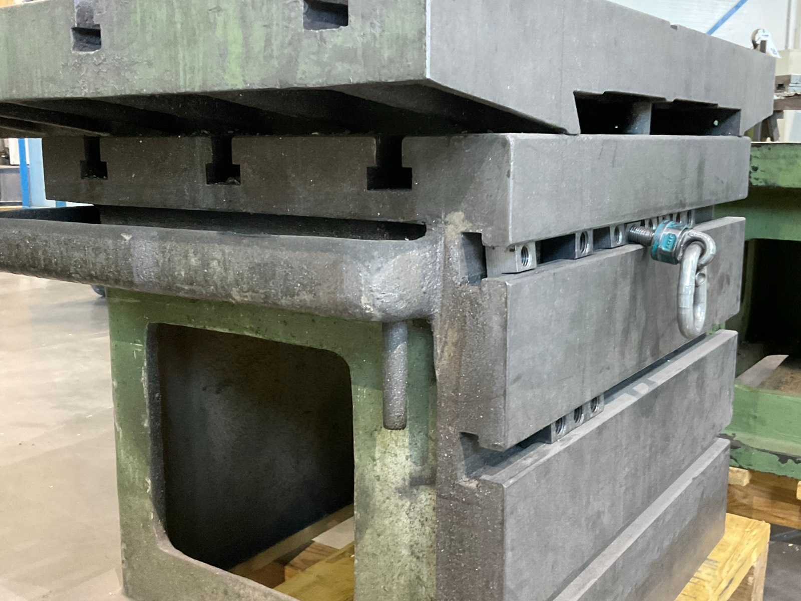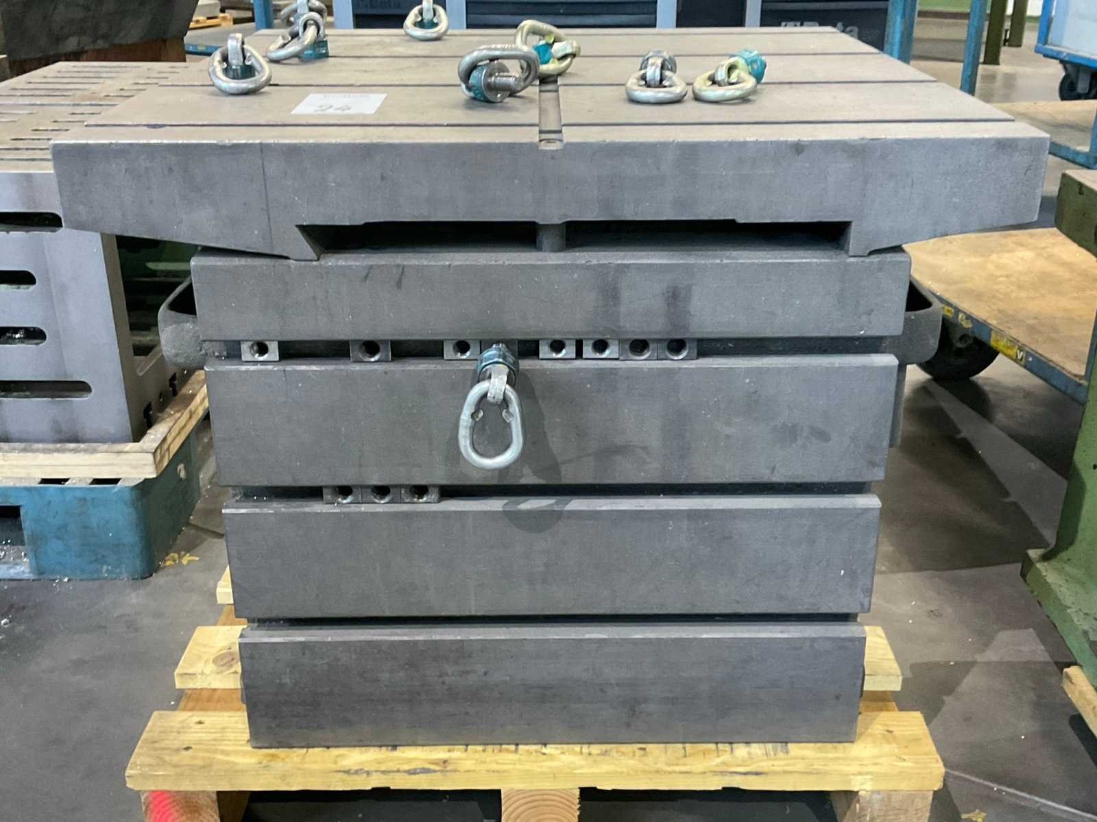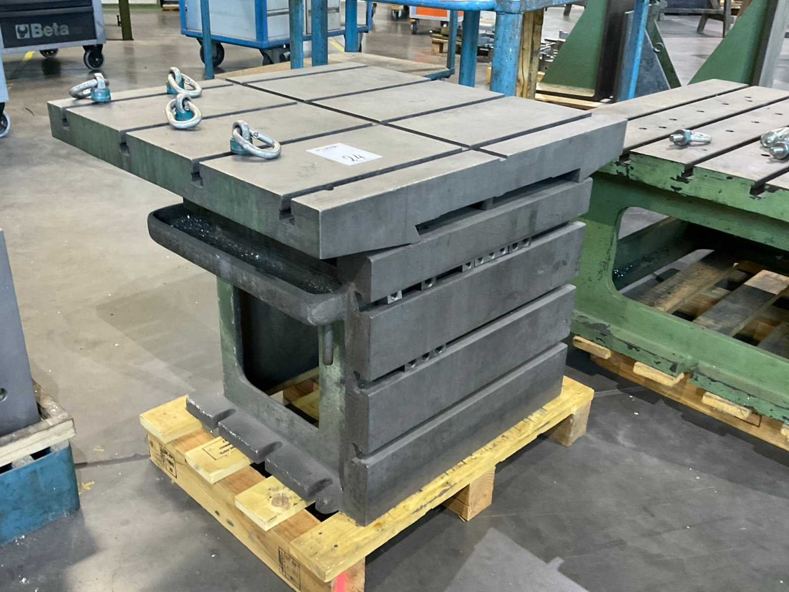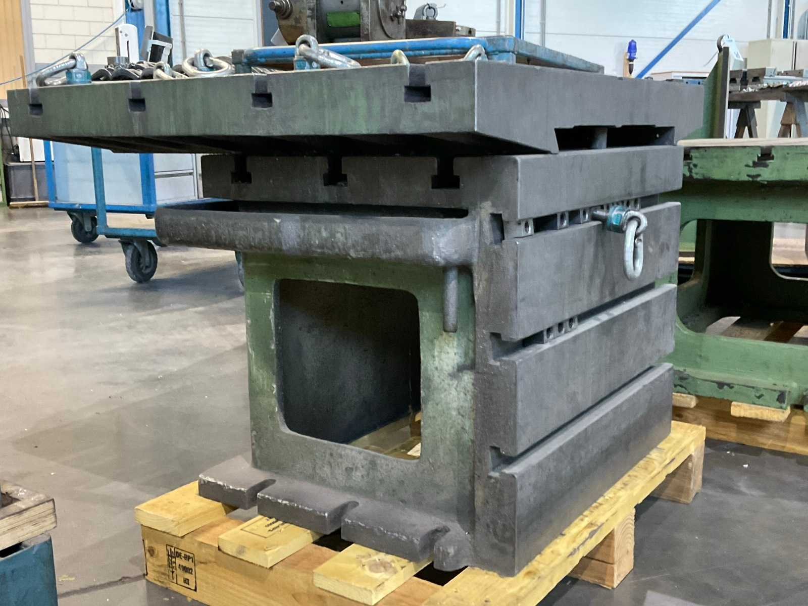 Zware machinetafel / opspantafel met T-sleuven en hijsogen, geschikt voor opspannen van werkstukken op freesmachine of bewerkingscentrum. Formaat: 800x800x600mm.