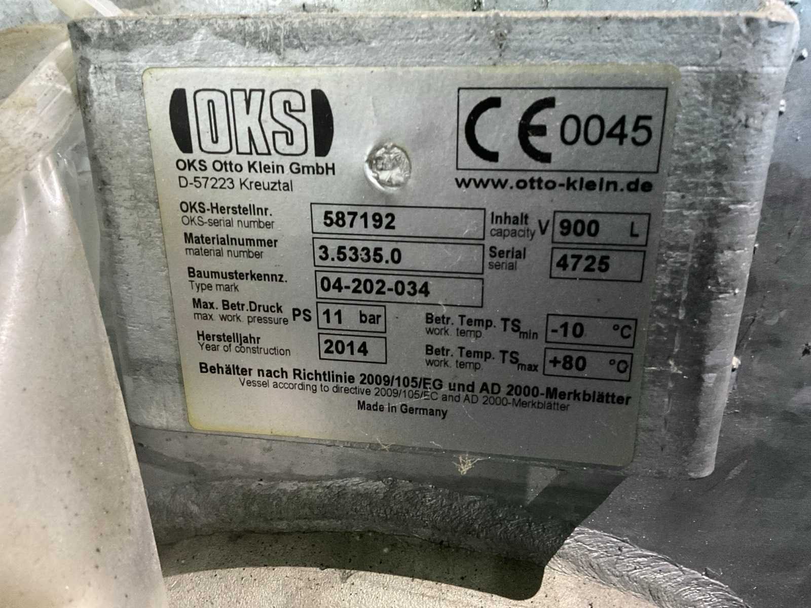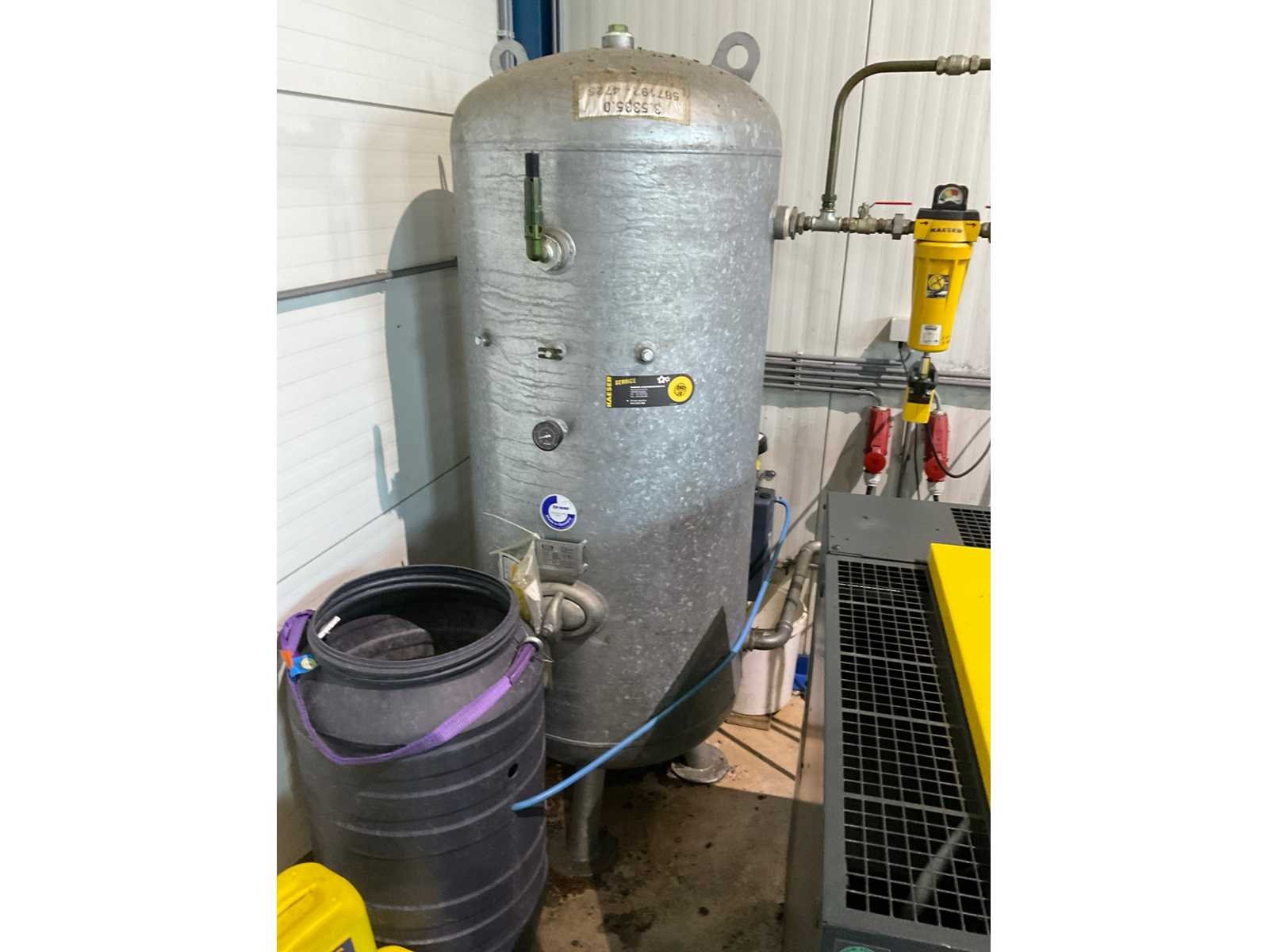 Inclusief: (1x) OKS verticaal drukvat, Inhoud: 900 liter, 11 bar, Bouwjaar: 2014. Merk: Kaeser Type: SK22T Bouwjaar: 2014 Serienummer: 1143 Capaciteit.: 11bar Vermogen: 11kW Buffertank inhoud: 900l Afgelezen urenstand: 42160 Aansluiting: 400V Totale afmeting L: 700mm Totale afmeting Breedte: 1200mm Totale afmeting Hoogte: 1250mm