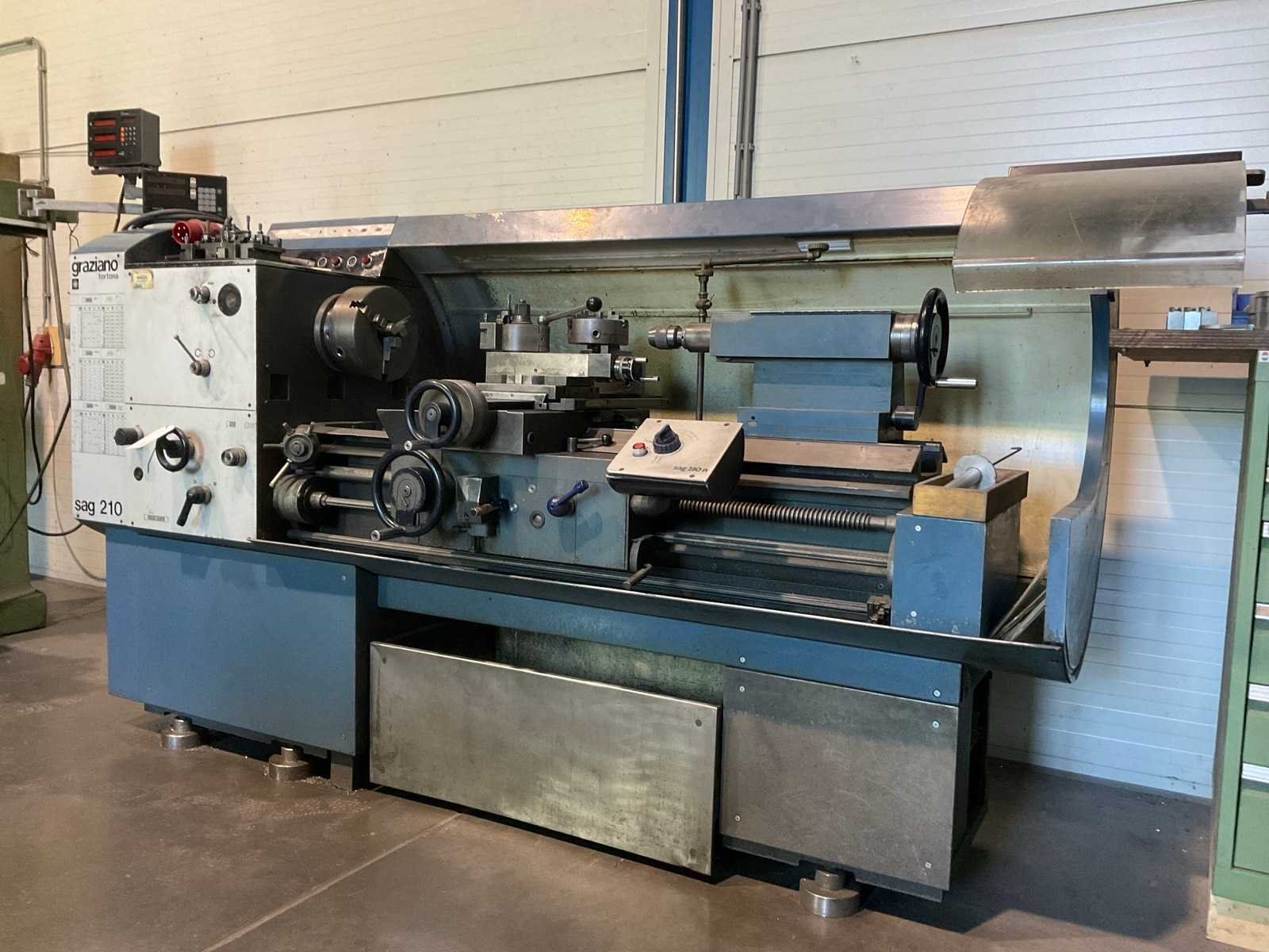 Spilneus: Camlock D1-6, Machine voorzien van: (1x) Sony digitale uitlezing, Type: LG10-2 met X en Y uitlezing, (3x) klauwplaat, (1x) losse kop. Merk: Graziano Type: SAG 210 N Draailengte: 1250mm Draai: 420mm Holle spil Ø: 57mm Aantal snelheden: 24 Snelheid van n =: 38rpm Snelheid tot n =: 2000rpm Koelmiddelpomp: true Aansluiting: 400V Machinegewicht: 2100kg Afmeting l: 2600mm Afmeting b: 900mm Afmeting h: 1610mm