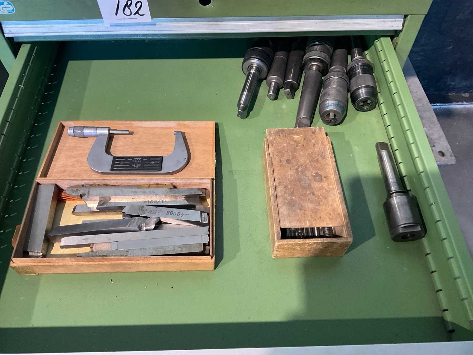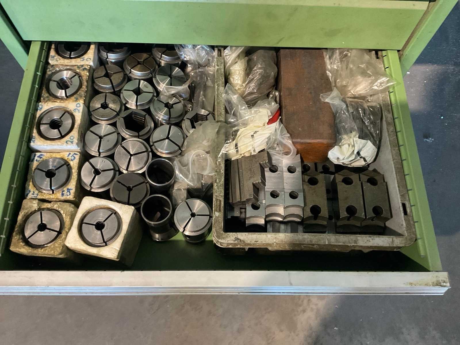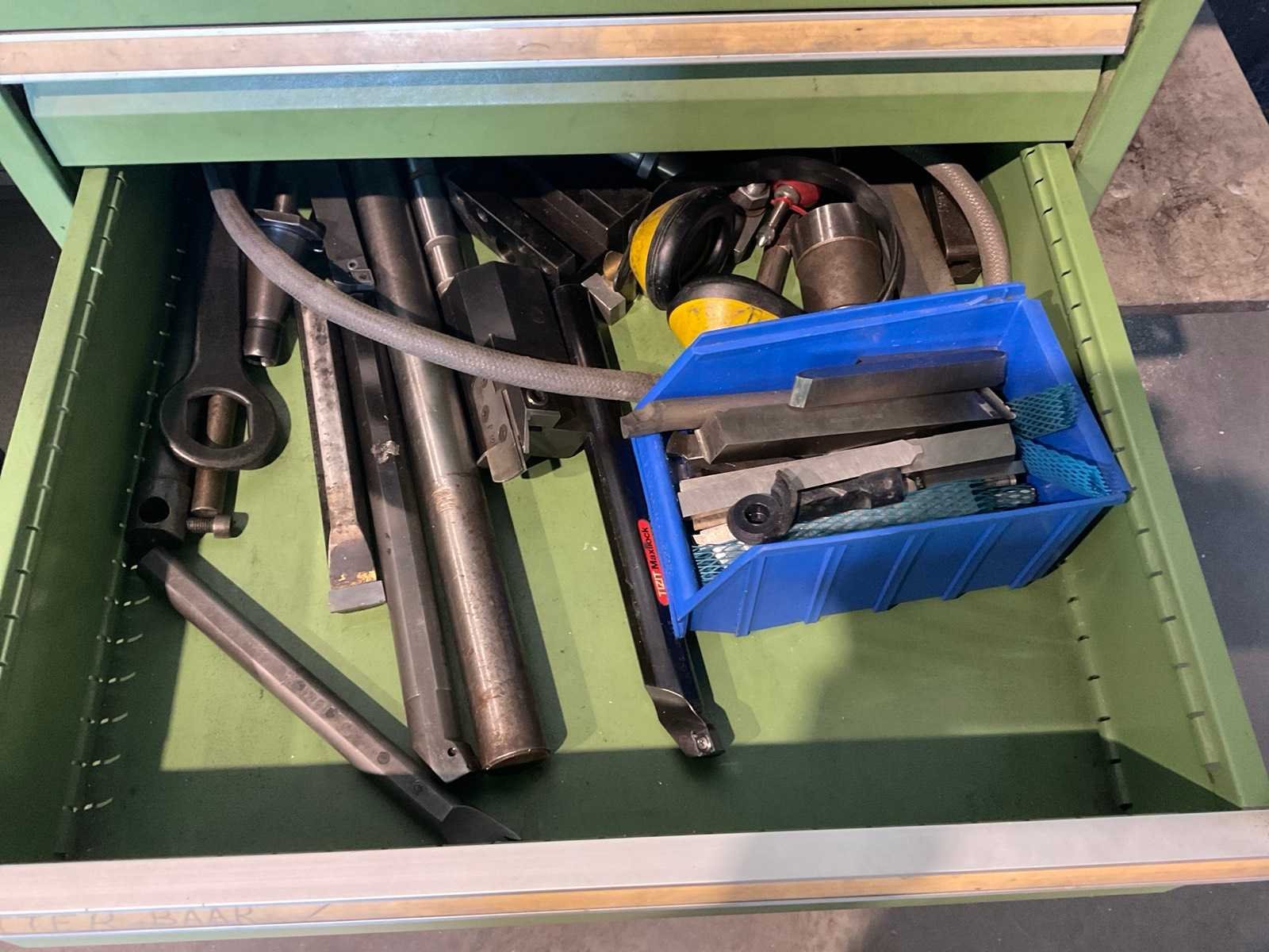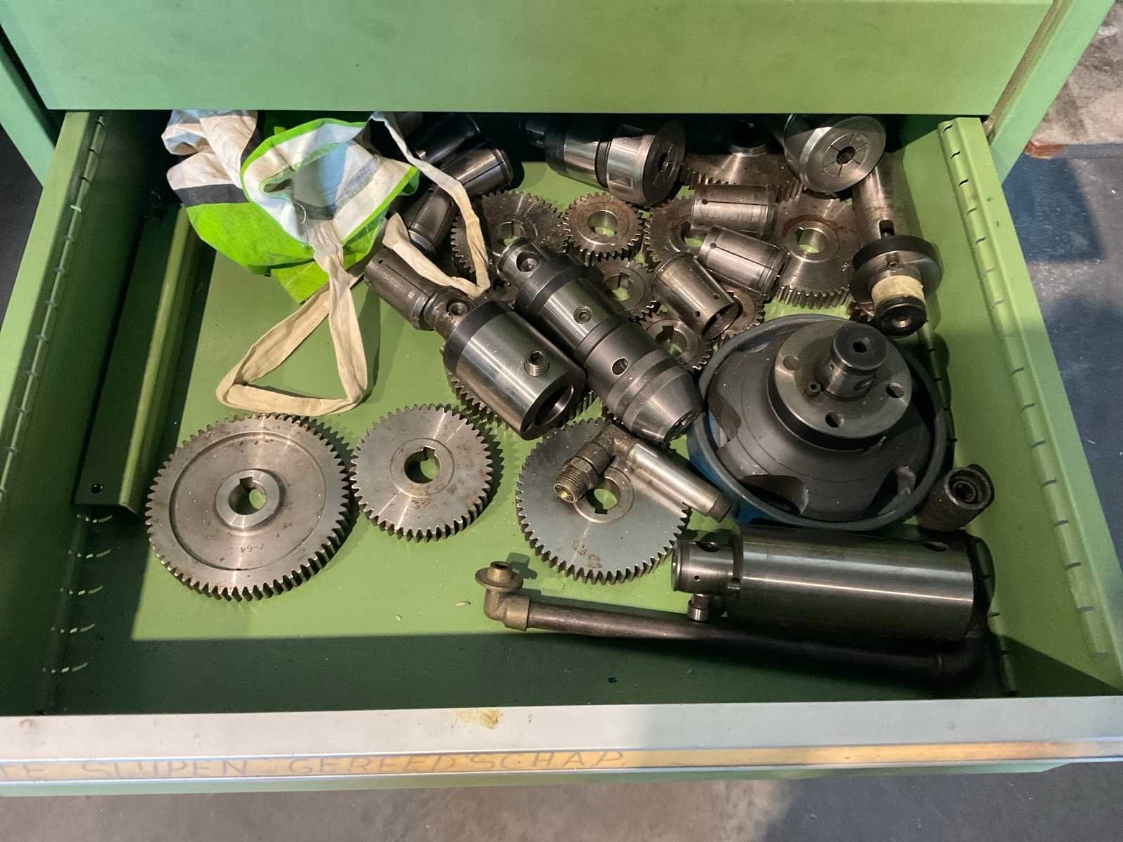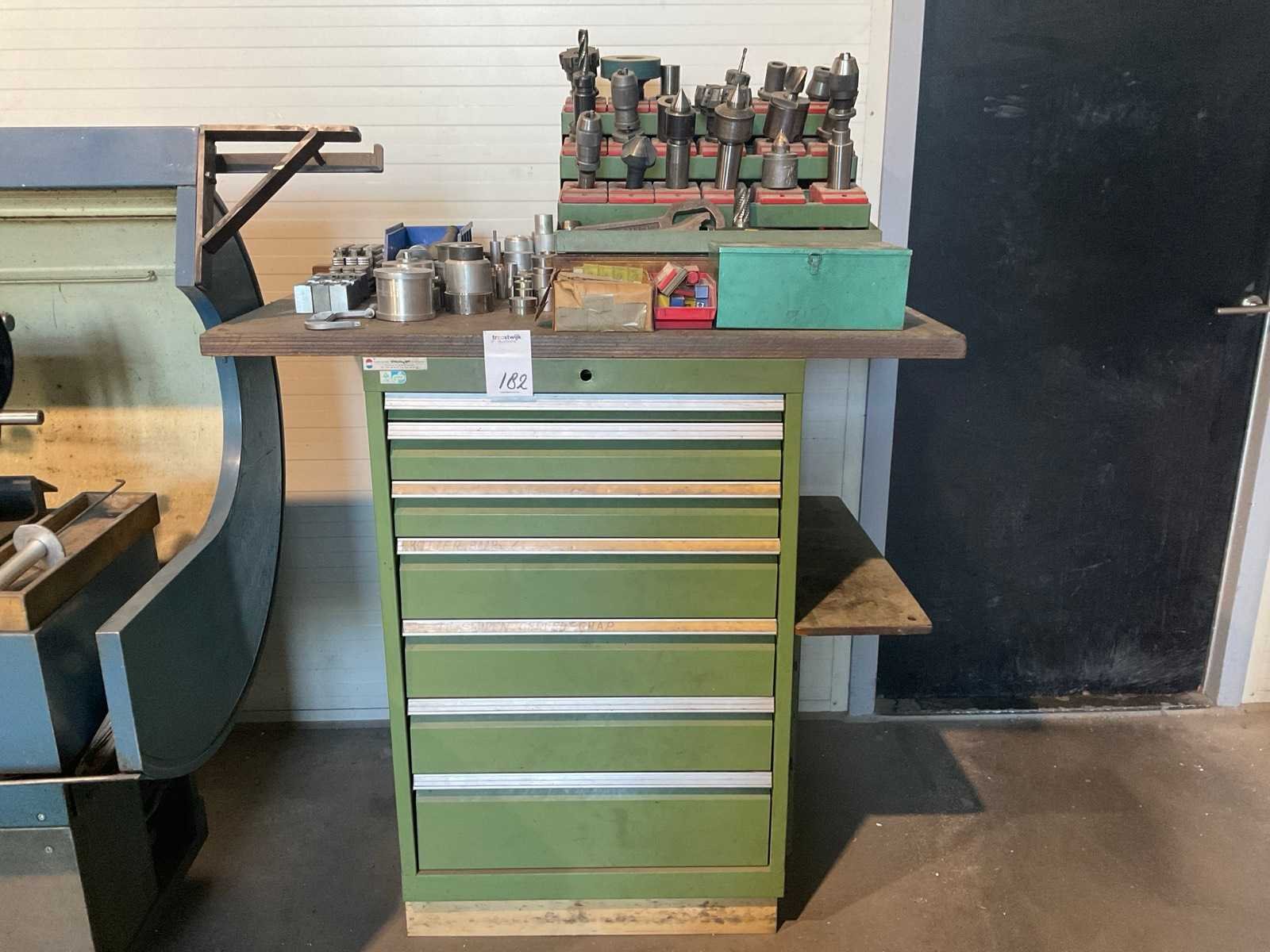 Voorzien van houten werkblad 120x73cm. Inclusief inhoud en machine toebehoren op de kast. Aantal laden: 7 Lengte: 70 Breedte: 73cm Hoogte: 105cm Materiaal: Staal