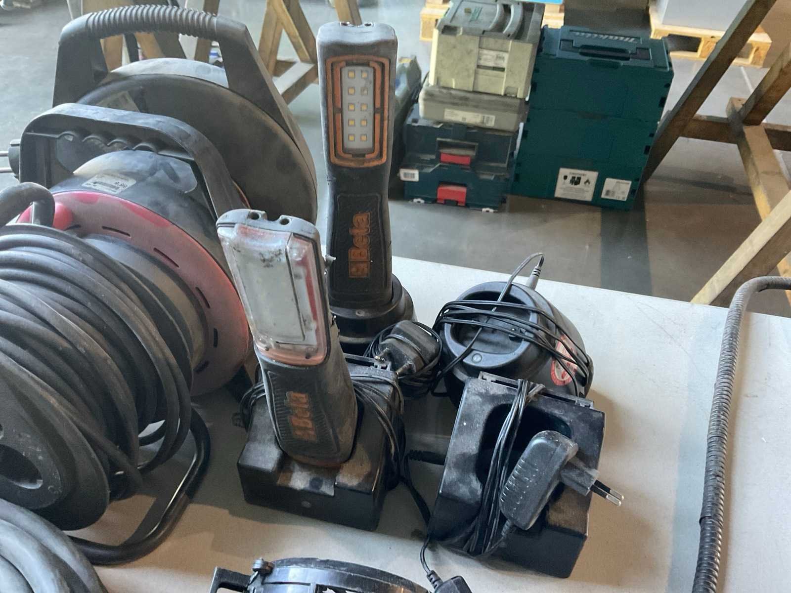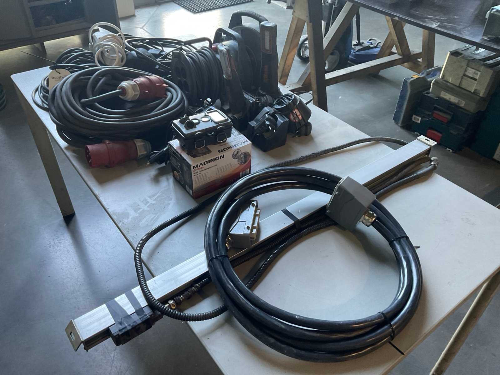 Waaronder: 32A krachtstroom, 3x 230V haspel, machine besturingskabel, 2x Beta accu looplamp, looplamp, 1x Maginon bewakingscamera