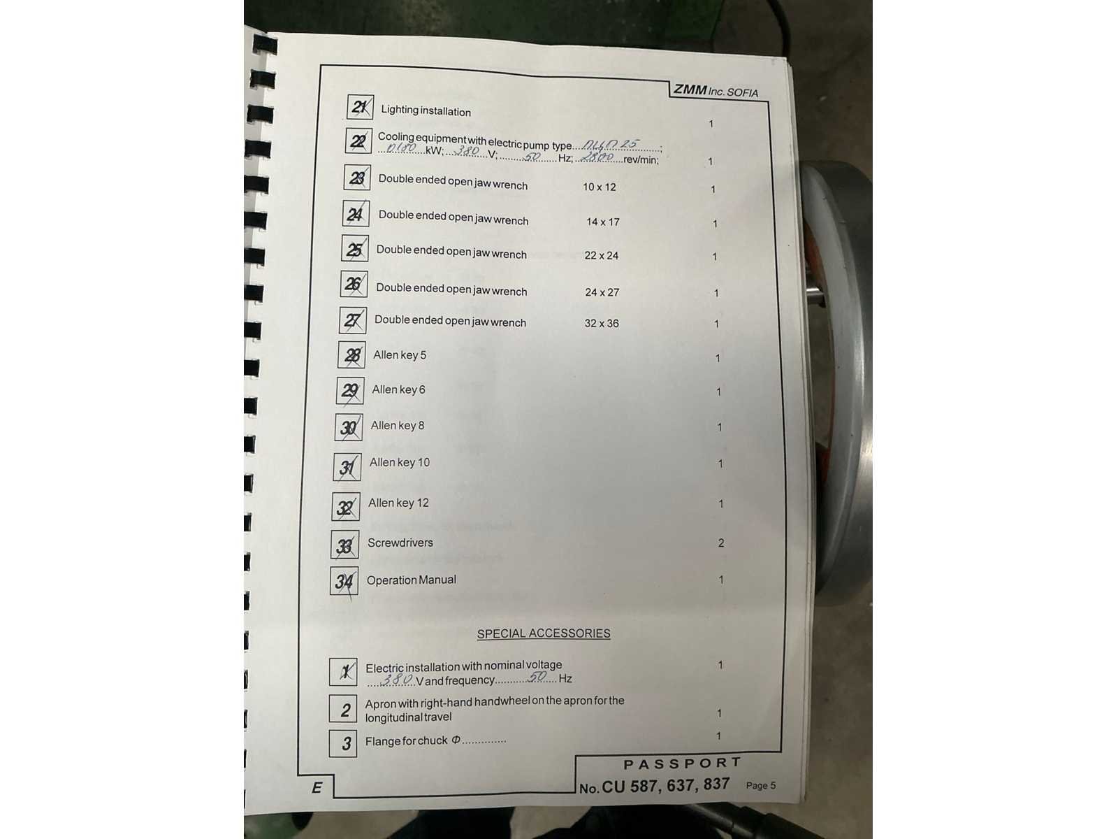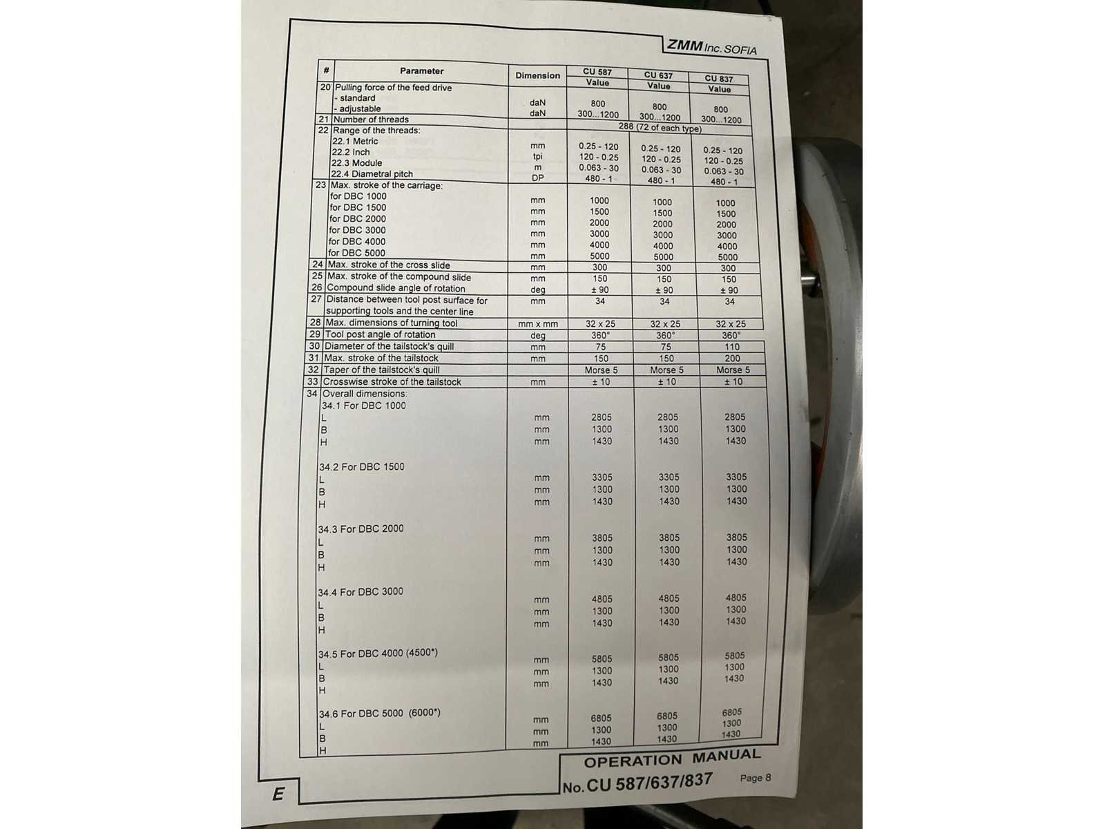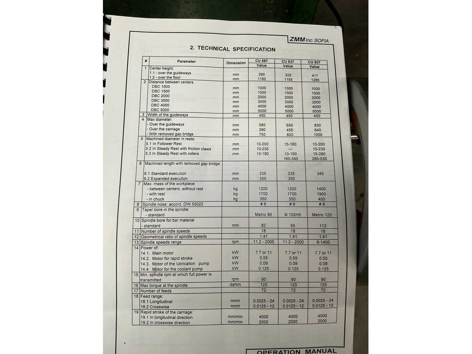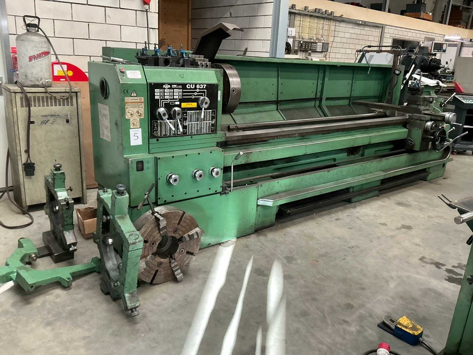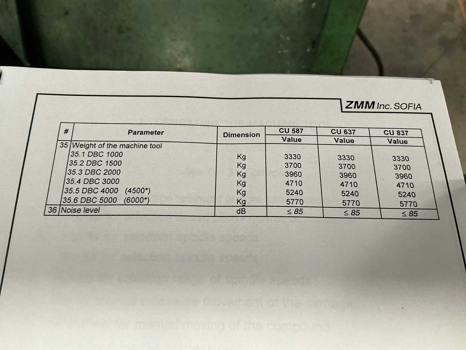 Draaidiameter boven bed 600mm, draaidiameter met uitneembaar deel van bed circa 800mm, max draaidiameter boven slede 430mm. Newall digitale X-Y uitlezing, inclusief diverse beitelhouders, 2 brillen, en vierklauwplaat(500mm). Let op! De beschikbare heftruck kan deze machine niet verladen, neemt u uw eigen geschikte middelen mee Merk: ZMM Type: CU 637 DBC3000 Bouwjaar: 2002 Serienummer: 20050 Draailengte: 3000mm Machinegewicht: 5000kg Afmeting l: 4900mm Afmeting b: 1800mm Afmeting h: 1900mm