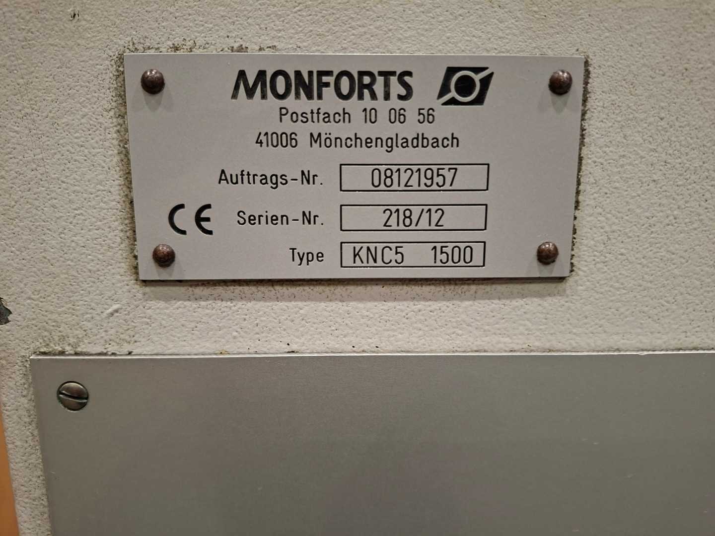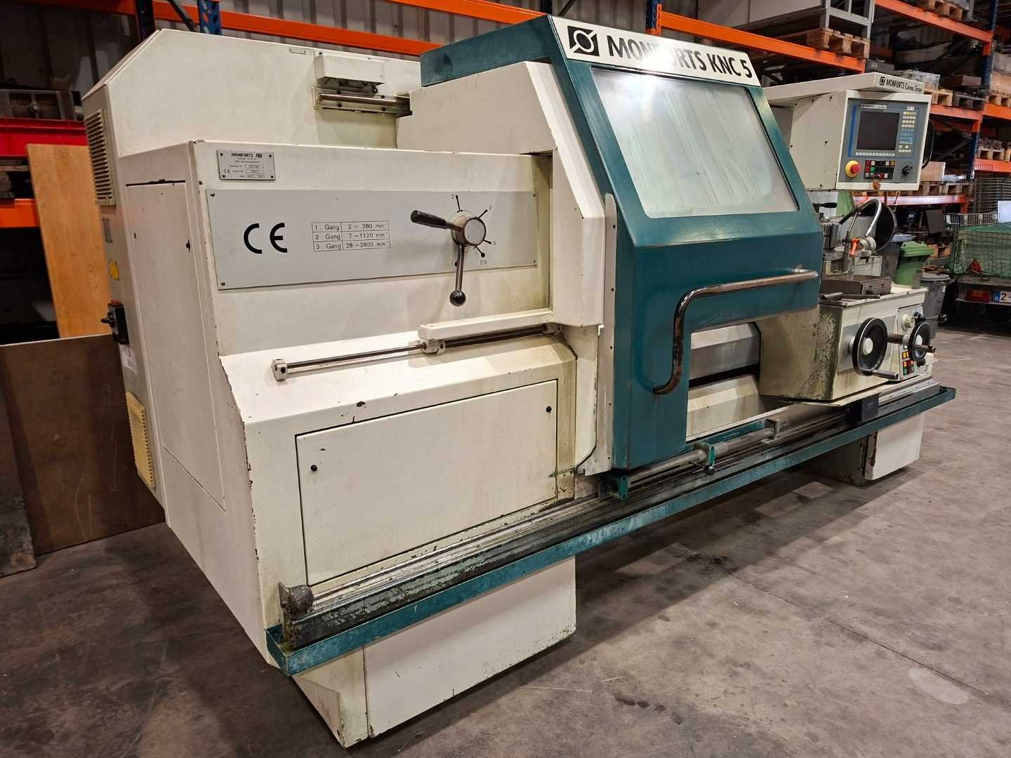 Machineomschrijving van de Monforts , model KNC 5 1500 Maschinenbeschreibung der Monforts KNC 5 1500 Arbeidsbereik / Arbeitsbereich ▪ Afstand tussen centers / Spitzenweite : 1500 mm ▪ Draaidiameter over dwarssupport / Umlaufdurchm. über Planschlitten : Ø 290 mm ▪ Draaidiameter over bed / Umlaufdurchmesser über Bett : Ø 500 mm ▪ Verplaatsing van dwarsslede / Verfahrweg des Planschlittens : 265 mm ▪ Bedbreedte / Bettbreite : 360 mm Spilkop / Spindelstock ▪ Spildiameter in het voorste lager / Spindeldurchm. am vorderen Lager : Ø 100 mm ▪ Spil opname / Spindelaufnahme nach : DIN 55027 Größe 8 ▪ Spindelbohrung 71 mm ▪ Innenkegel der Spindel metrisch 80 Hauptantrieb ▪ Stufenlos regelbarer Drehstromantrieb (100%/40% ED) 11/16,5 kW ▪ Gesamtdrehzahlbereich 2 – 2.800 min-1 ▪ Getriebestufe I 2 - 280 min-1 ▪ Getriebestufe II 7 - 1120 min-1 ▪ Getriebestufe III 28- 2.800 min-1 ▪ Max. Drehmoment 1.681 Nm Vorschubantriebe ▪ Drehstrom-Servoantriebe mit mechanischer Sicherheitskupplung ▪ Vorschubkraft längs/plan 11,3/11,3 kN ▪ Eilganggeschwindigkeit längs/plan 10/5 m/min Gewindeschneidbereich ▪ Längs- und Kegelgewinde, Steigung 0,001 – 500 mm Reitstock ▪ Pinolendurchmesser 80 mm ▪ Pinolenhub 160 mm ▪ Innenkegel MK5 Gewicht ▪ Maschine als Transporteinheit ca. 3.000 kg Merk: Monforts Type: KNC 5 1500 Draailengte: 1500mm Draai: 500mm Holle spil Ø: 71mm Machinegewicht: 3000kg