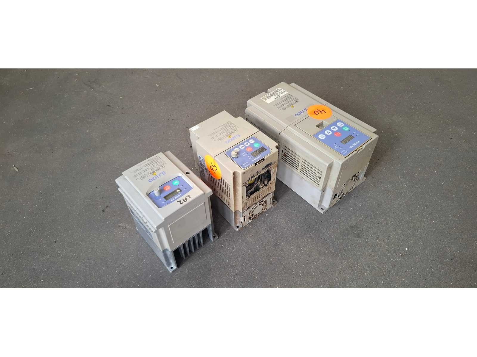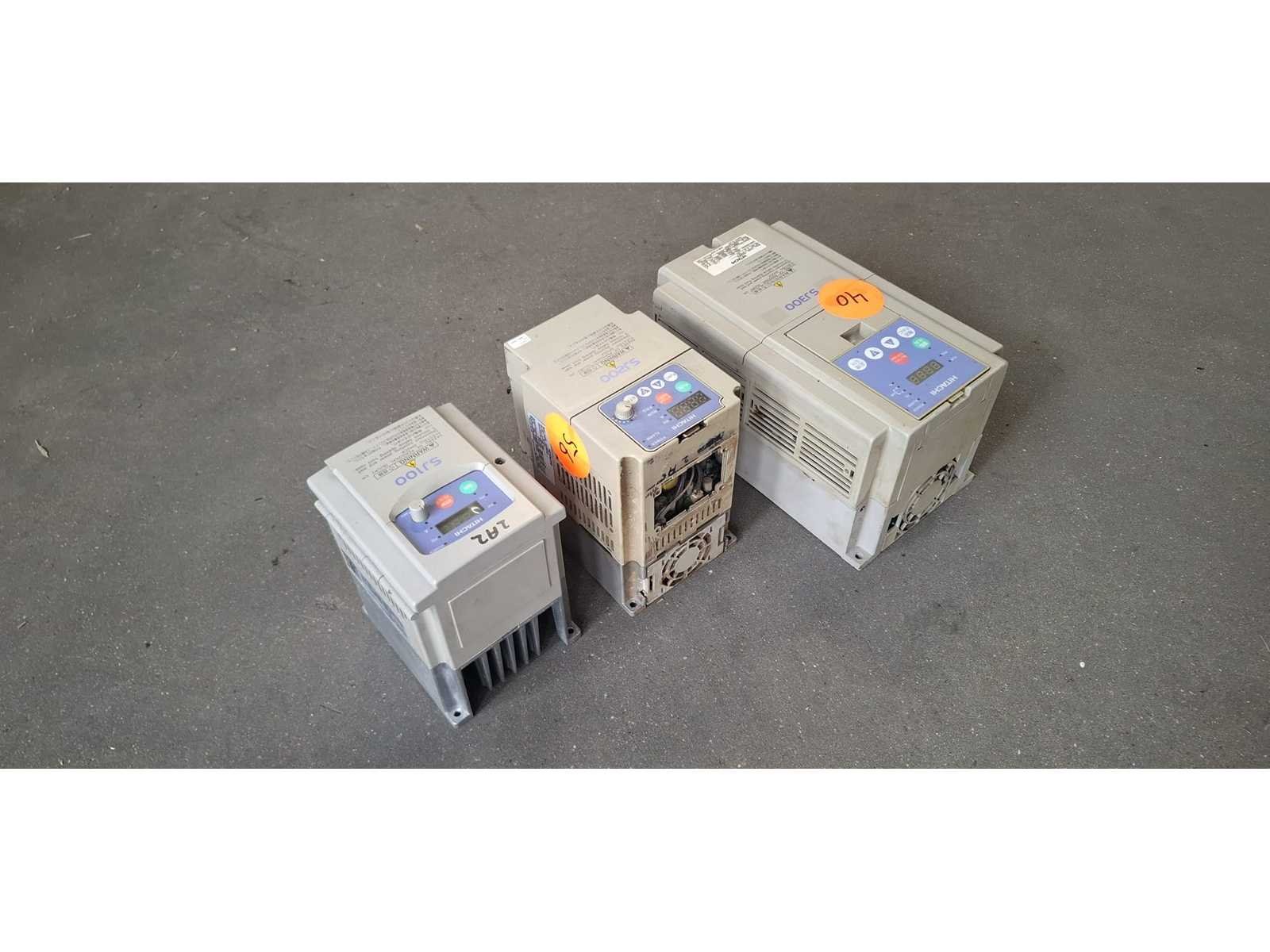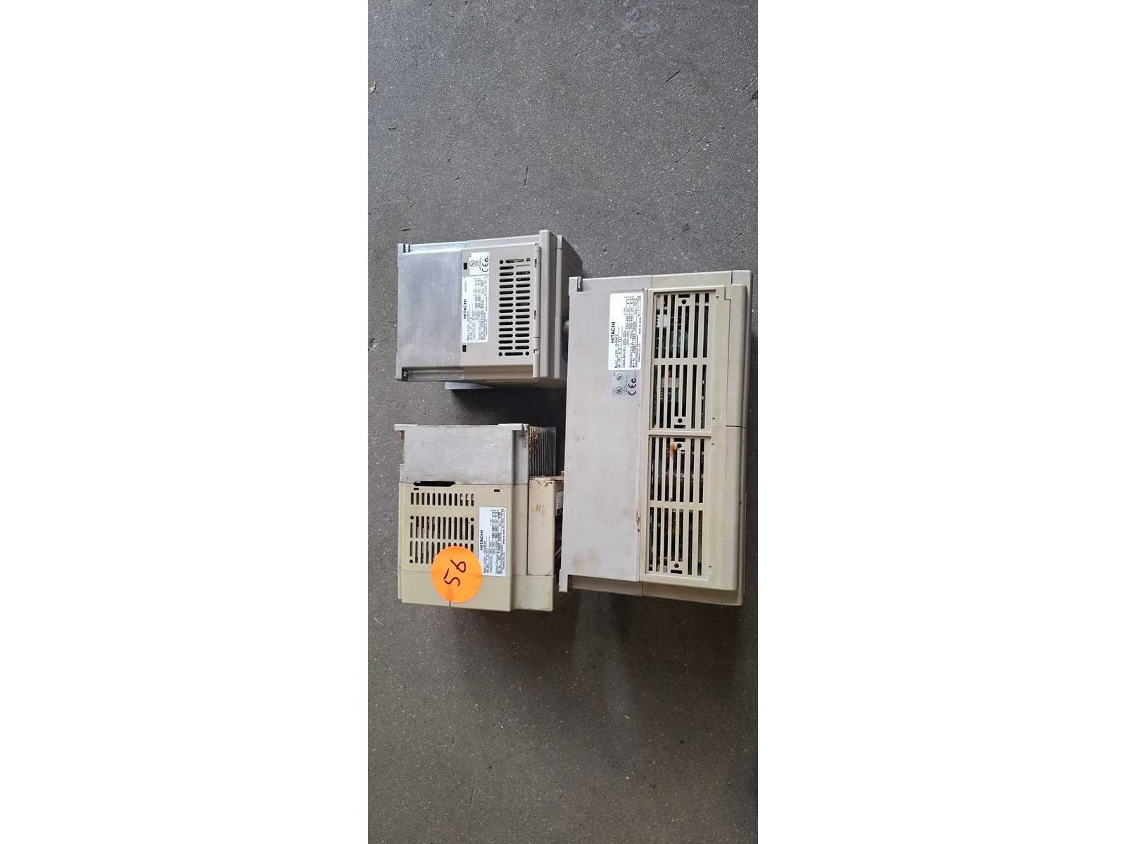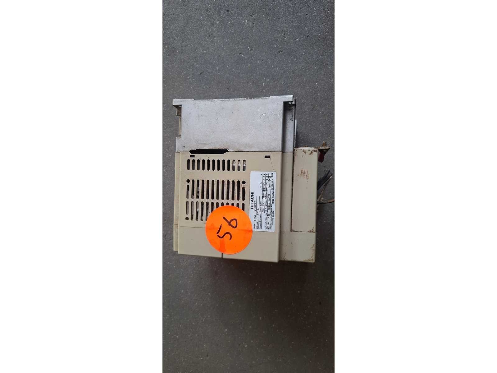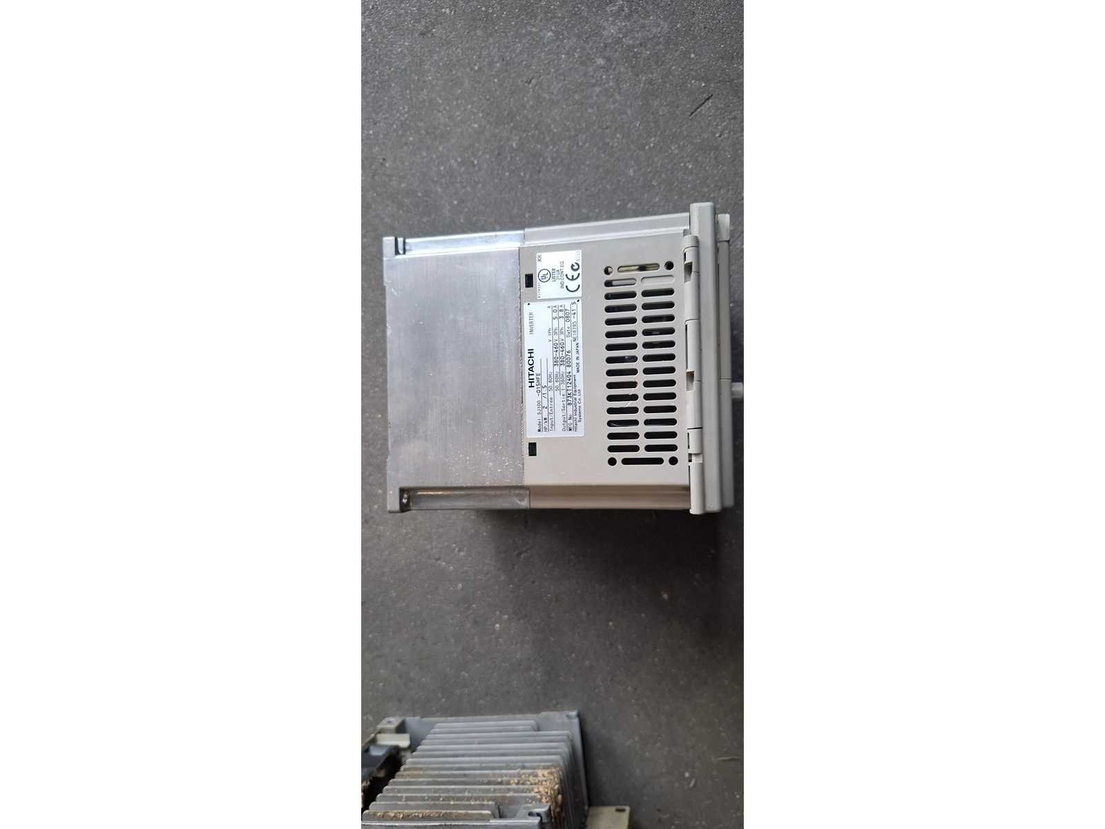 Hitachi SJ300 (Links / sticker 40): Dit is een krachtige flux-vector inverter. Modellen in deze serie, zoals de SJ300-075HFE, zijn geschikt voor vermogens tot 7,5 kW. Hitachi SJ200 (Midden/ sticker 56 ): Een compactere serie. De SJ200-015HFE is bijvoorbeeld een 1,5 kW (2 PK) regelaar die veelvuldig wordt gebruikt voor algemene motorsturingen. Hitachi SJ100 (Rechts / sticker 47): Een model dat vaak wordt ingezet voor diverse industriële toepassingen, met vermogens variërend van 0,4 kW tot 4 kW. Merk: Hitachi
