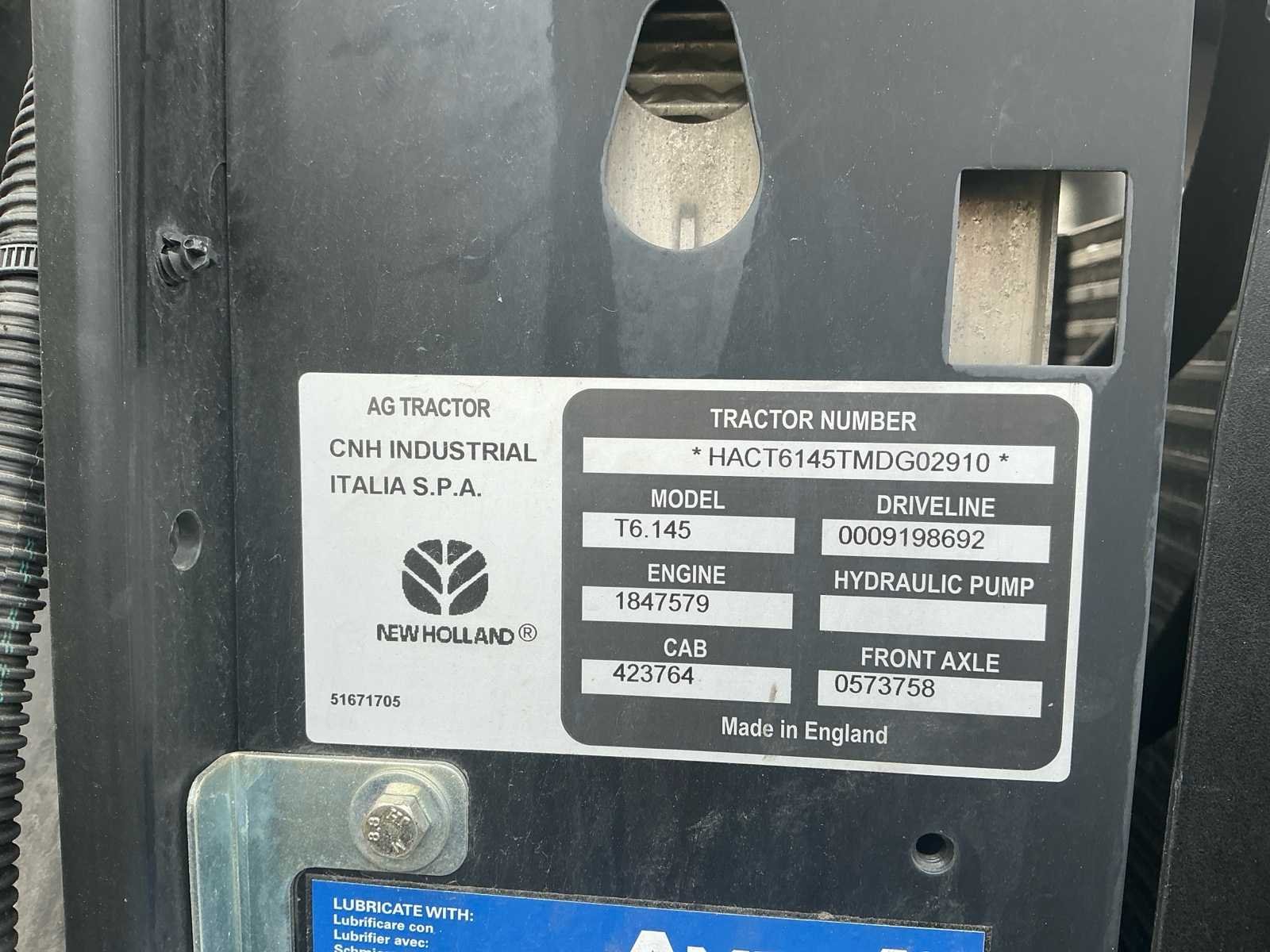 Voorzien van: luchtremmen, lage druk retour, luchtgeveerde stoel, PTO-bediening op spatborden, motorkap verlichting, hoog gemonteerde rijlichten,geveerde cabine, 120Amp dynamo, stage 5, CCLS pomp grote capaciteit, hefcilinders EDC 90mm, CAT 2/3 snelvanghaken, klimaat regeling, joystick 3 knoppen RHS, glijframe aankoppeling 32mm + piton, ruitenwisser met sproeier achter, motortoerental management, KL4 geveerde vooras, aanhanger remventiel 2 leidingen, fronthef, stabilisator hefarmen achter, bijrijdersstoel, zwaailicht, midden gemonteerde ventielenc4MRV (2NC + 2C), multicontroler armleuning, automatische PTO 540/540E/1000 + 21 splines, zwaailat, weg-en werklampen, de luxe-pack, dynamische spatborden voor, 2 telescopische spiegels, brandstoftank 263L, 40Km/uur 17x16 economy, radio met bluetooth, 2 elektr. mid mount ventielen, 8 led-hoog vermogen verlichting,. Merk: New Holland Type: T6.145 Bouwjaar: 2023 Serienummer: HACT6145TMDG02910 Motorvermogen (kW): 86kW Afgelezen urenstand: 342 Versnellingsbaktype: 17x16 Aftakastoerental: 540rpm Aantal hydraulische ventielen achter: 4 Bandenmaat voor: 480/65R20 Bandenmaat achter: 600/65R38 Cabine: true Eigen gewicht: 5500kg Totale afmeting L: 5200mm Totale afmeting Breedte: 2300mm Totale afmeting Hoogte: 2200mm Kentekenpapieren compleet?: true
