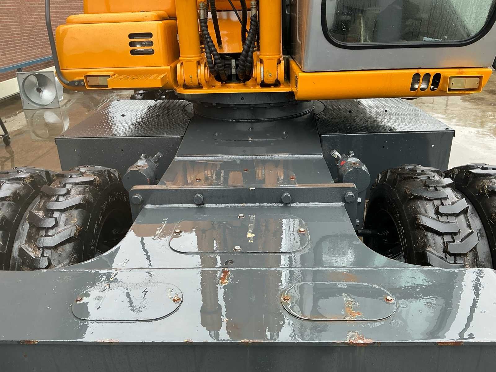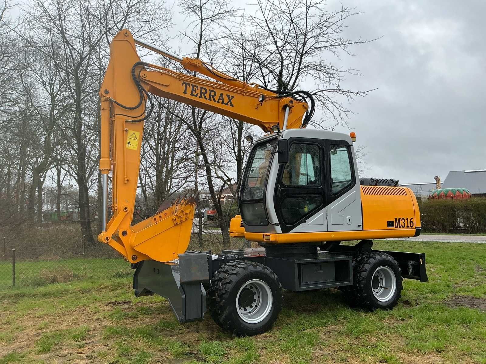 Voorzien van: Iveco motor, luxe cabine met airconditioning, bedrijfsgewicht: 15075 kg, motorvermogen: 87 kW/2000 tpm, maximale graafdiepte: 5640 mm, minimale zwenkradius voorzijde: 2482 mm, framebreedte: 2470 mm, breedte onderstel: 2525 mm, transportlengte: 7772 mm, transportbreedte: 2525 mm, transporthoogte: 3528 mm, hoogte bulldozerblad: 525 mm, rijsnelheid: 33/6,2 km/u, spicer assen, hameraansluiting, extra hydraulische functie, banden dubbele montering, slangbreukbeveiliging, radio, airco, schild, poten, zwaailamp, vaste bak 1000mm met tanden. Merk: Terrax Type: M316 Bouwjaar: 2014 Serienummer: 0809075 Eigen gewicht: 15075kg Aantal assen: 2 Afgelezen urenstand: 41hr Motorvermogen (kW): 93kW