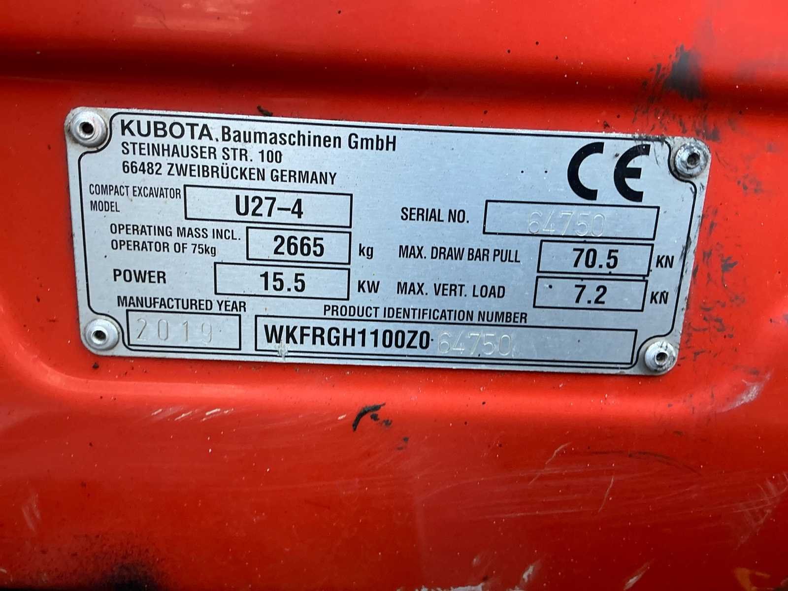 Voorzien van: rode sleutel, 3 graafbakken met omkeeroren (1x40cm, 1x100cm, 1x25cm), 500 uren beurt gehad, accu recent vervangen, rijwerk (tracks, sprockets, rollen) recent vervangen — Urenstand kan licht oplopen! Merk: Kubota Type: U27-4 Bouwjaar: 2019 Serienummer: 64750 Merk motor: Kubota Motorvermogen (kW): 15kW Aantal cilinders: 3 Brandstof: Diesel Bedrijfsgewicht: 2665kg Met graafbak: true Rups breedte: 300mm Cabine: true Afgelezen urenstand: 3911 Totale afmeting L: 3800mm Totale afmeting Breedte: 1550mm Totale afmeting Hoogte: 2600mm