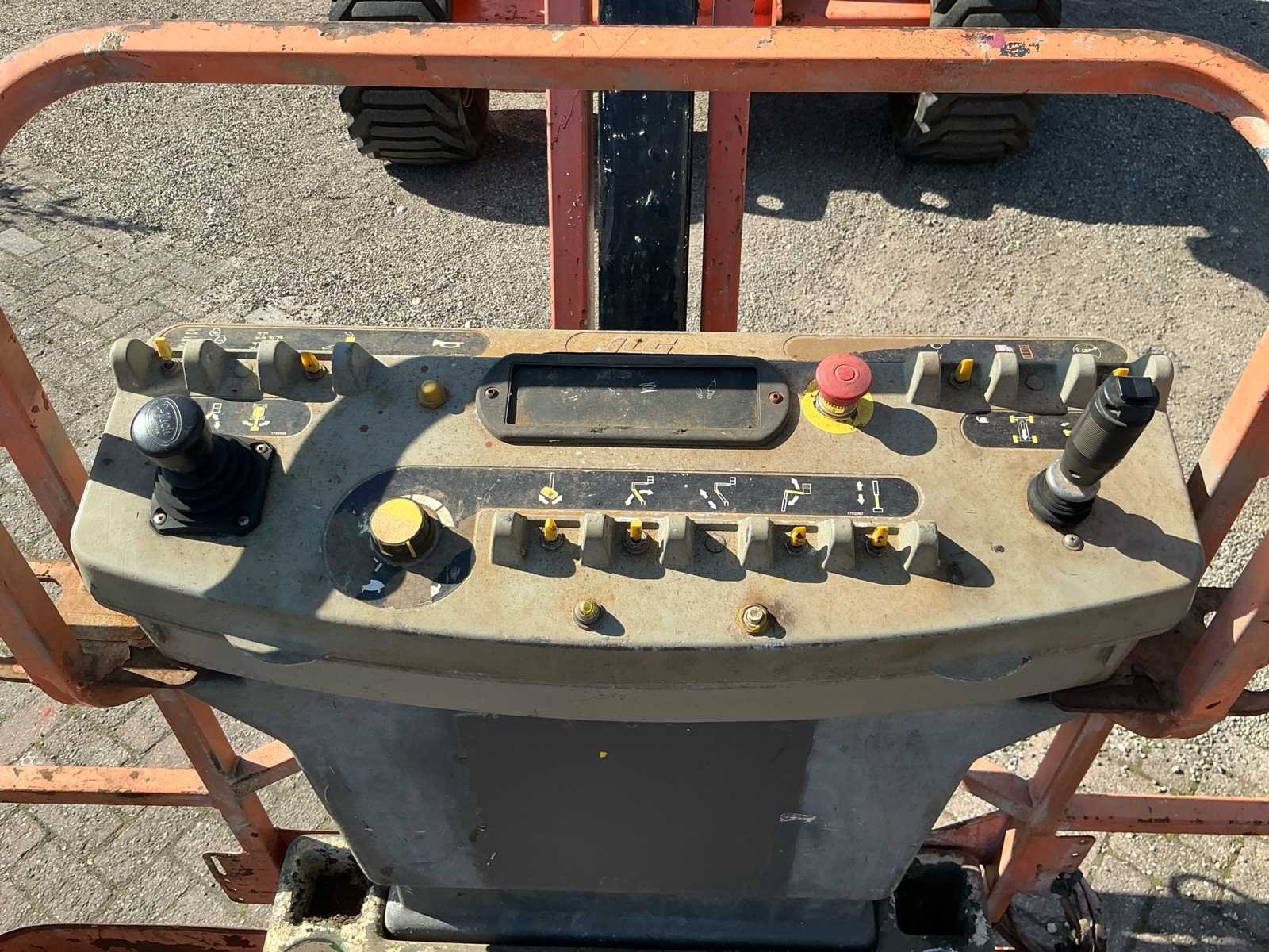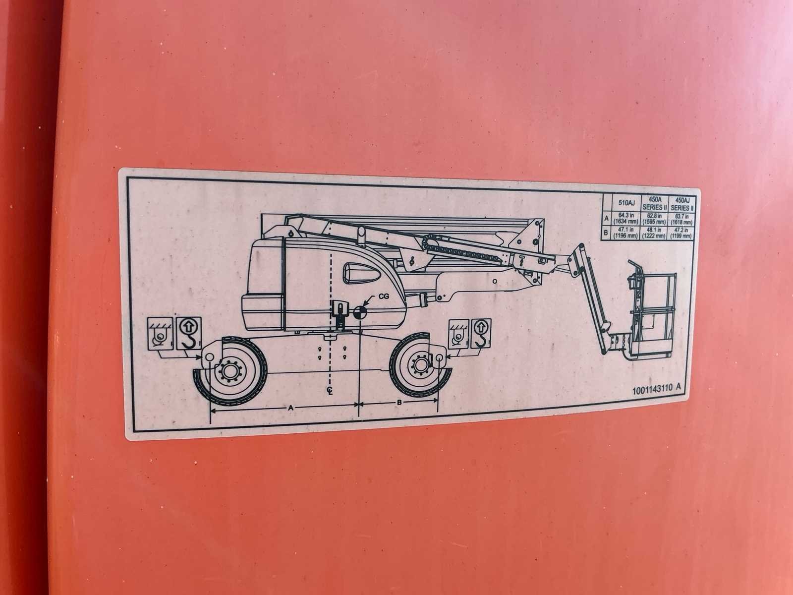 12,5 M/S, 400N, Hellingsvermogen: 45% (4WD), Draaibereik toren: ±355° , Platformrotatie: ±180° Merk: JLG Type: 450AJ Bouwjaar: 2014 Serienummer: E300001877 Diesel: true Elektrisch: true Motorvermogen (kW): 49kW Knikarm hoogwerker: true Werkhoogte: 16500mm Horizontale rijkwijdte: 8000mm Plateau afm. l: 1800mm Plateau afm. b: 750mm Platform capaciteit: 230kg Afgelezen urenstand: 2540 Eigen gewicht: 6418kg Totale afmeting L: 4900mm Totale afmeting Breedte: 2350mm Totale afmeting Hoogte: 2550mm