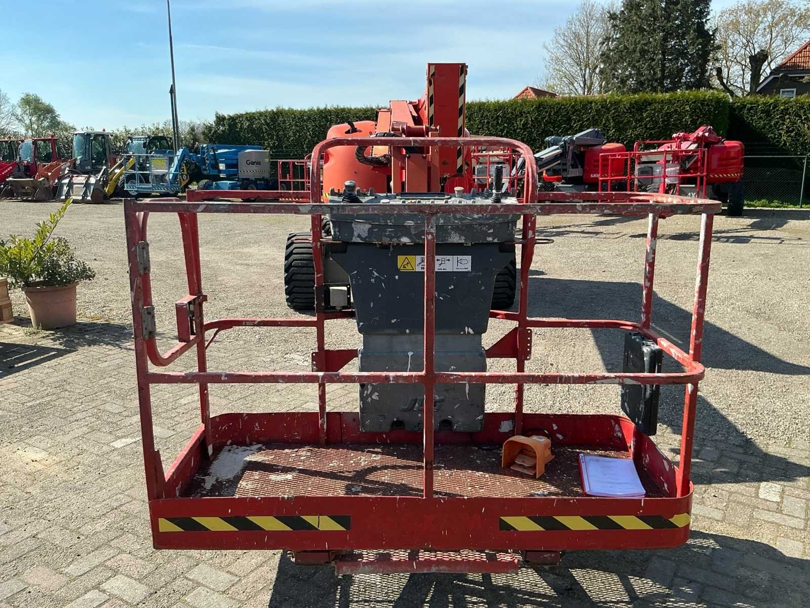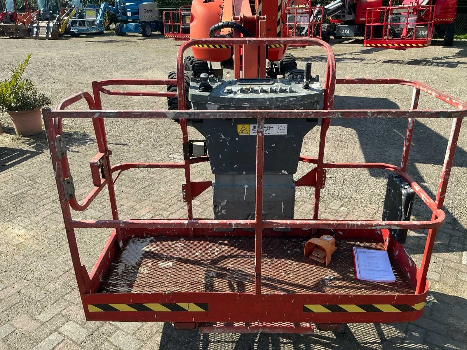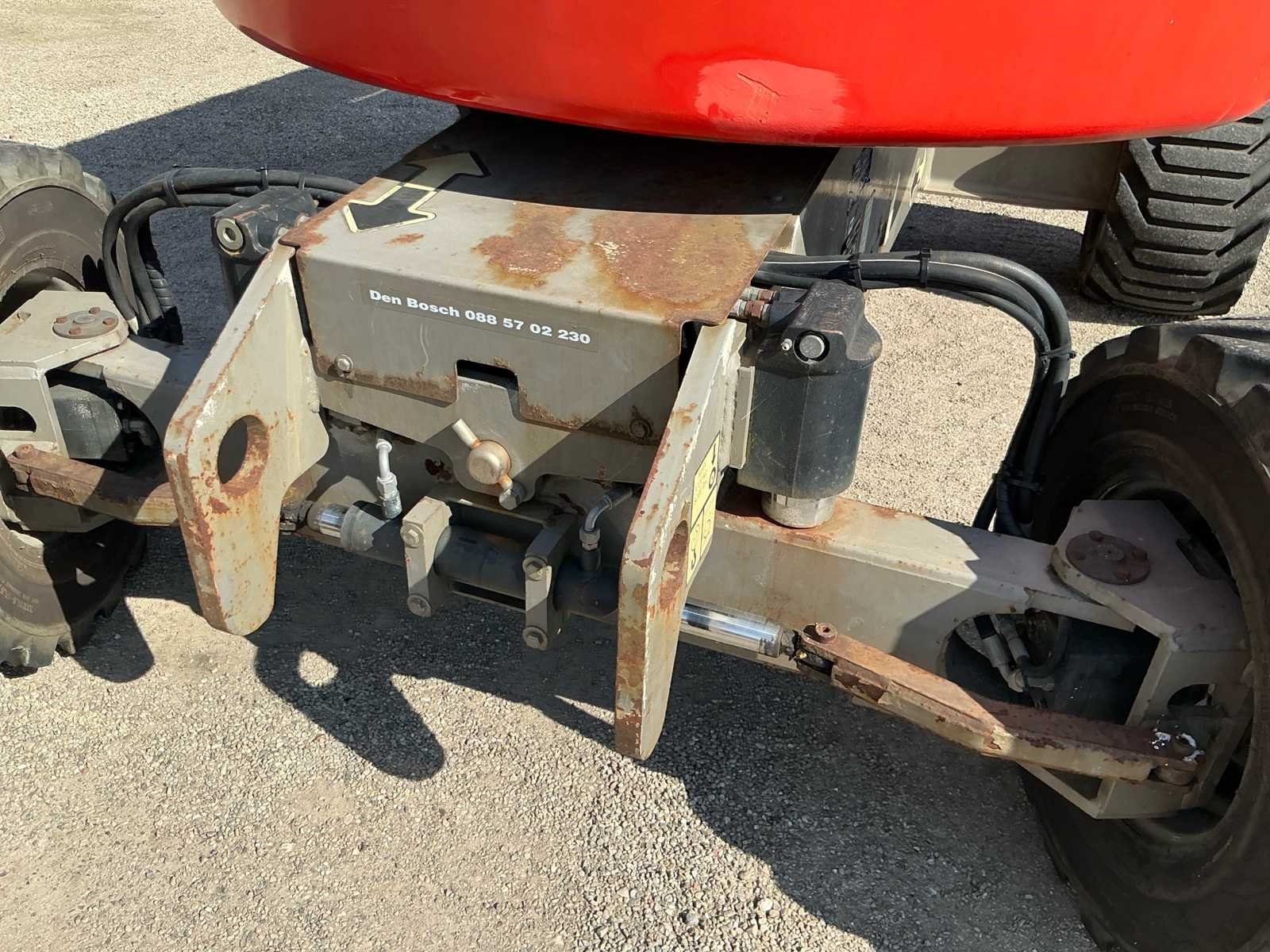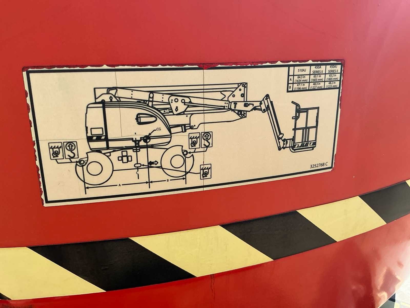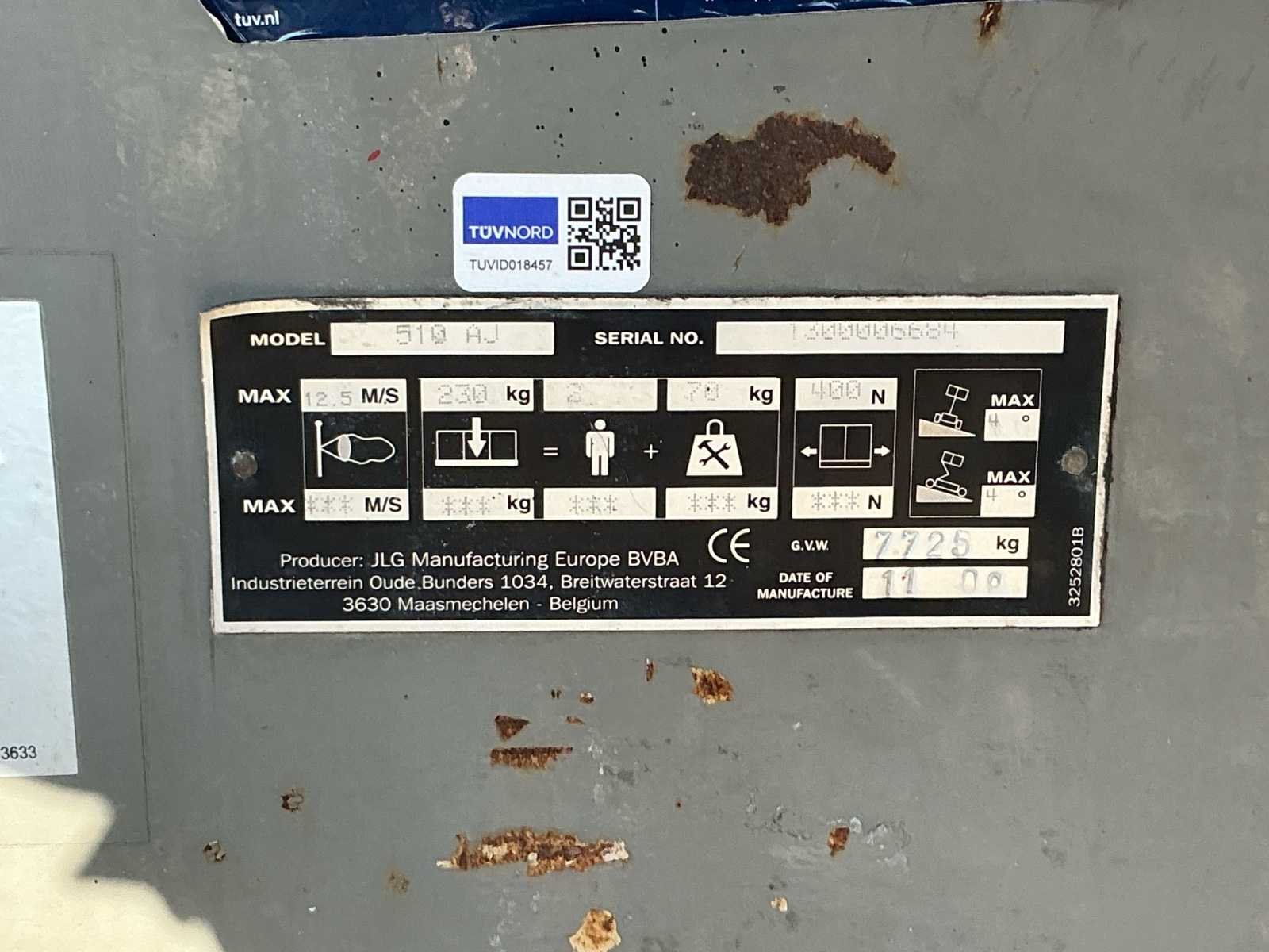 12,5 m/s, 400N, Rijsnelheid: ± 7,2 km/u, Hellingsvermogen: 45% (4WD), Draaibereik toren: 360° (niet continu), Platformrotatie: ±180° Merk: JLG Type: 510AJ Bouwjaar: 2008 Serienummer: 1300006684 Diesel: true Elektrisch: true Motorvermogen (kW): 37kW Knikarm hoogwerker: true Werkhoogte: 18000mm Horizontale rijkwijdte: 10000mm Plateau afm. l: 1800mm Plateau afm. b: 750mm Platform capaciteit: 230kg Afgelezen urenstand: 4101 Eigen gewicht: 7725kg Totale afmeting L: 4950mm Totale afmeting Breedte: 2350mm Totale afmeting Hoogte: 2550mm