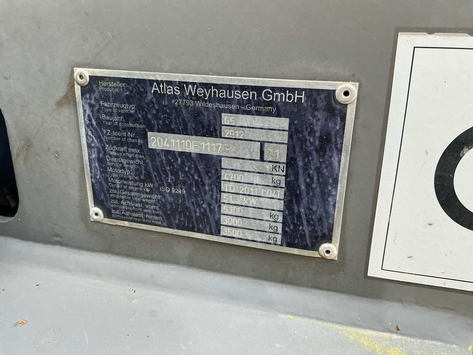 Voorzien van 4x1 bak, lepels, hydraulische snelwissel Merk: Atlas Type: 65 Bouwjaar: 2012 Serienummer: 2041110E111752 Merk motor: TD 2011 L041 Motorvermogen (kW): 51kW Aantal cilinders: 4 Brandstof: Diesel Bedrijfsgewicht: 4700kg Graafbak afm. l: 2900mm Graafbak afm. b: 900mm Graafbak afm. h: 800mm Bandenmaat: 12.5-20 Cabine: true Afgelezen urenstand: 4104 Totale afmeting L: 4500mm Totale afmeting Breedte: 1900mm Totale afmeting Hoogte: 2600mm