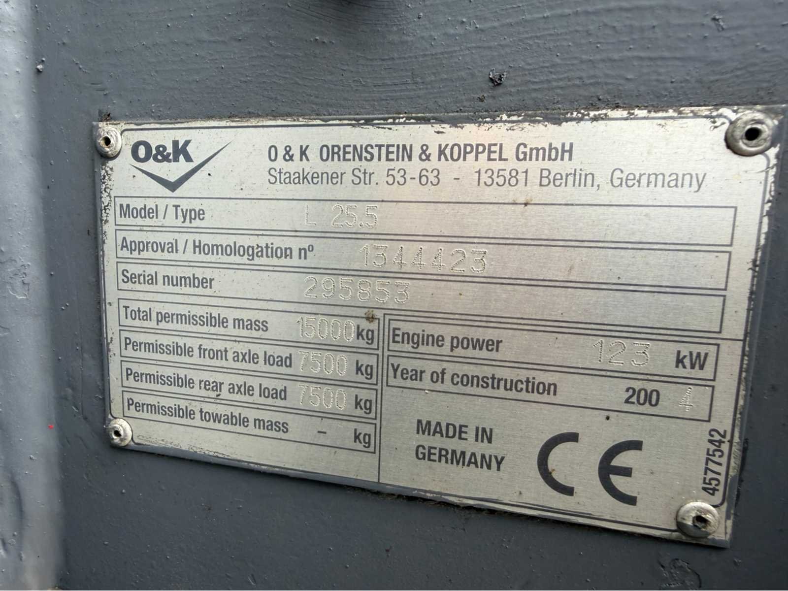 Merk: O&K Type: L25.5 Bouwjaar: 2004 Serienummer: 295853 Merk motor: cummins Motorvermogen (kW): 123kW Aantal cilinders: 6 Brandstof: diesel Afgelezen urenstand: 32725 Eigen gewicht: 15000kg