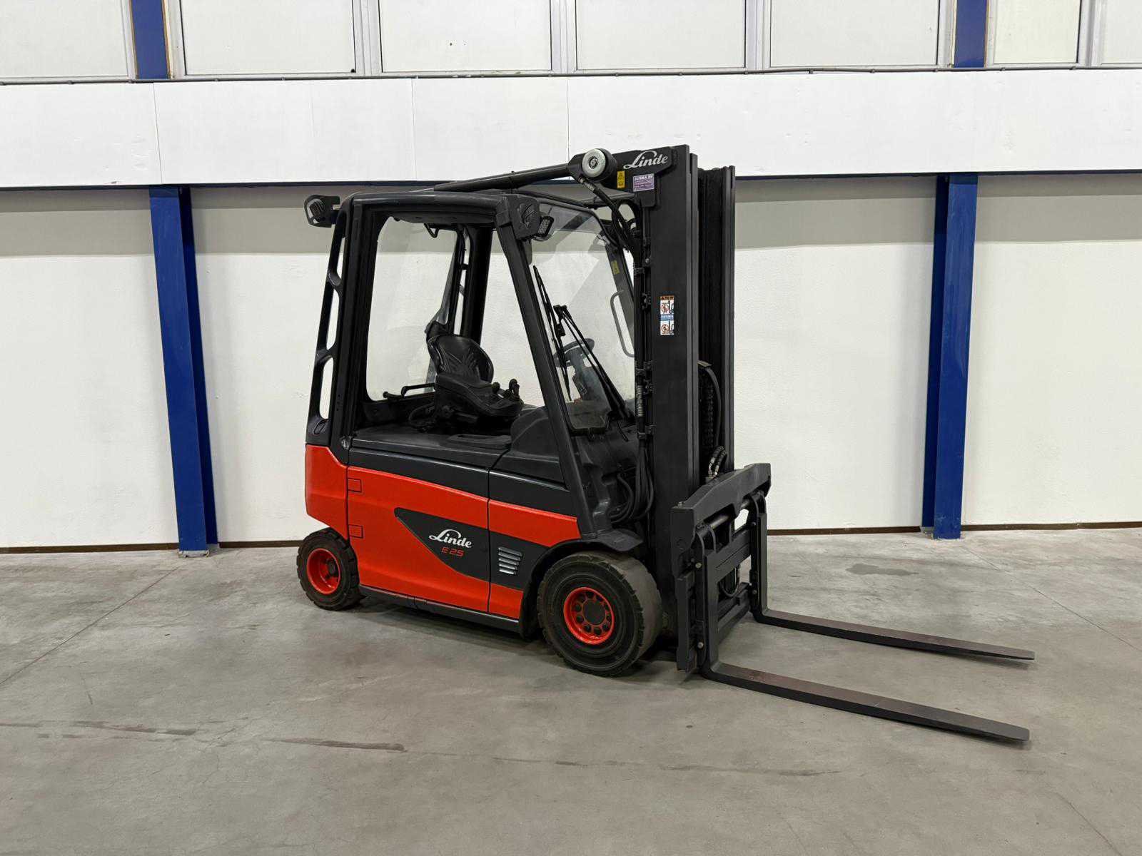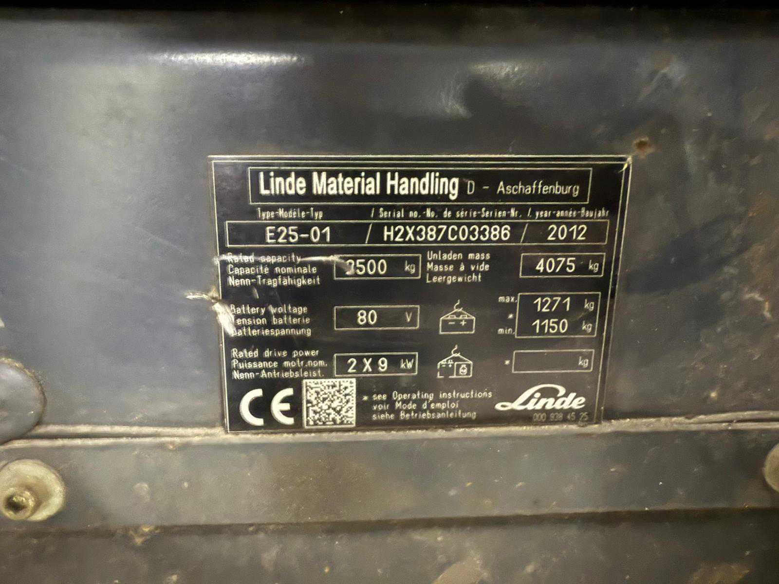 Voorzien van: acculader, werkverlichting, triplex mast, sideshift, hydraulisch verstelbare lepels Merk: Linde Type: E25-01 Bouwjaar: 2012 Serienummer: H2X387C03386 Brandstof: Elektrisch Mast: Triple Soort band: Volrubber banden Aantal wielen: 4 Afgelezen urenstand: 4864 Accu lader: true Free-lift: true Side-shift: true Hydraulisch verstelbare lepels: true Eigen gewicht: 4075kg Hefvermogen: 2500kg Lepellengte: 1150mm Min. hefhoogte: 2200mm Vol rubber banden: true Minimale doorrijhoogte: 2200mm Totale afmeting L: 2360mm Totale afmeting Breedte: 1150mm Totale afmeting Hoogte: 2200mm
